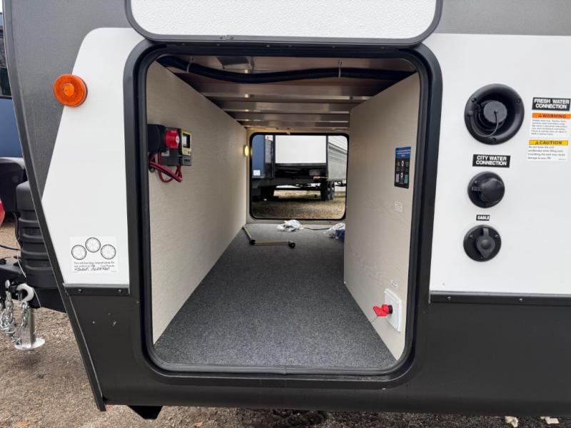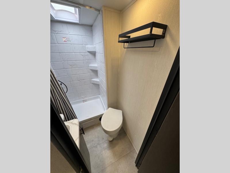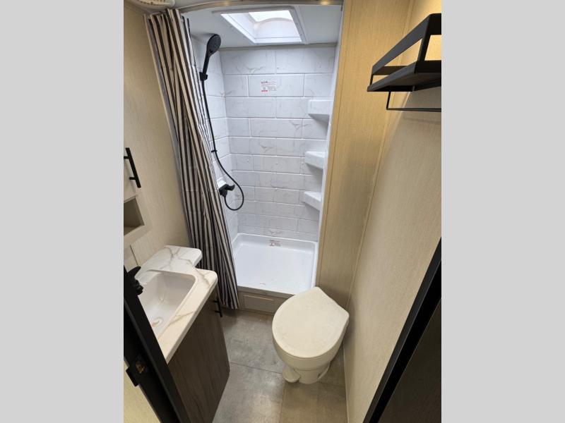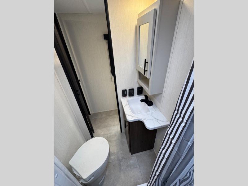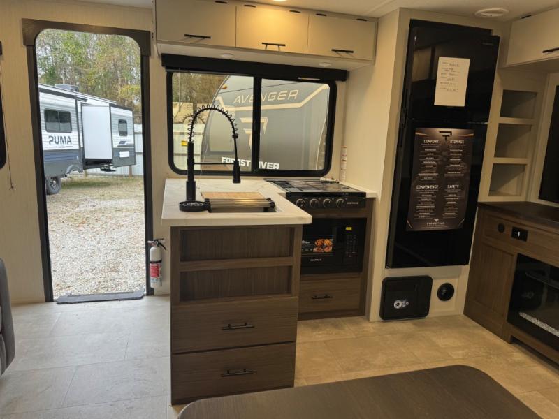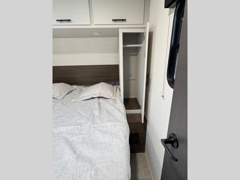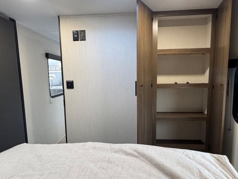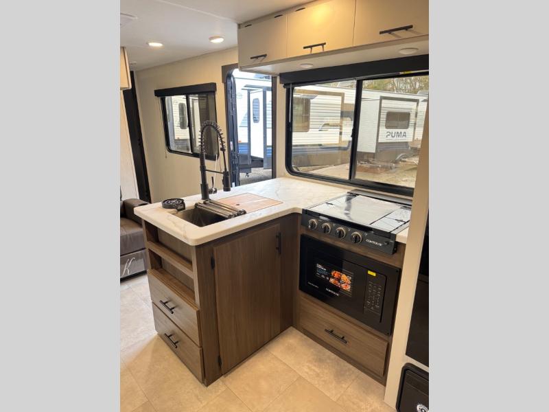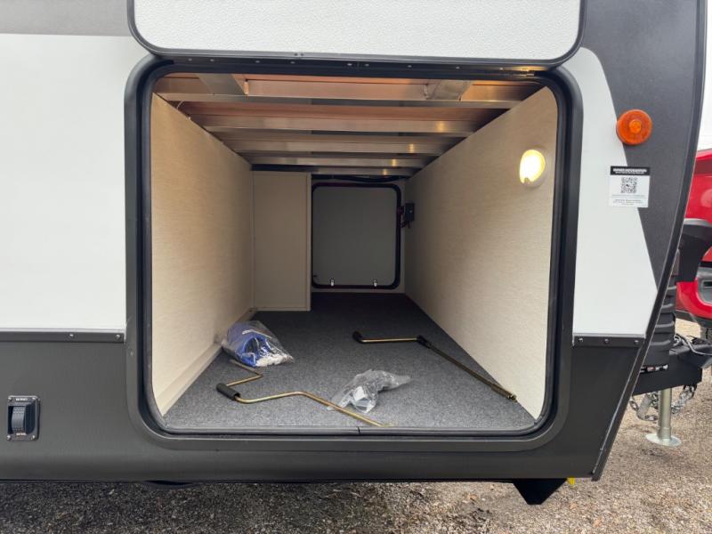 This travel trailer's modern rear kitchen is equipped with a reliable fridge, well-stocked pantry, and even a fireplace, making meal prep and cooking a great experience. The theater seating offers a cozy spot to unwind, while the dinette is perfect for sharing meals or stories with loved ones. The air fryer cooktop will also be useful for some easy delicious meals on the go, and the practical full bathroom to freshen up. The serene front bedroom is a peaceful retreat, featuring a comfortable camp king bed, spacious wardrobes, and ample overhead cabinets for storing your essentials.