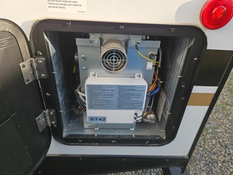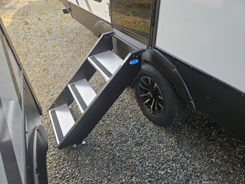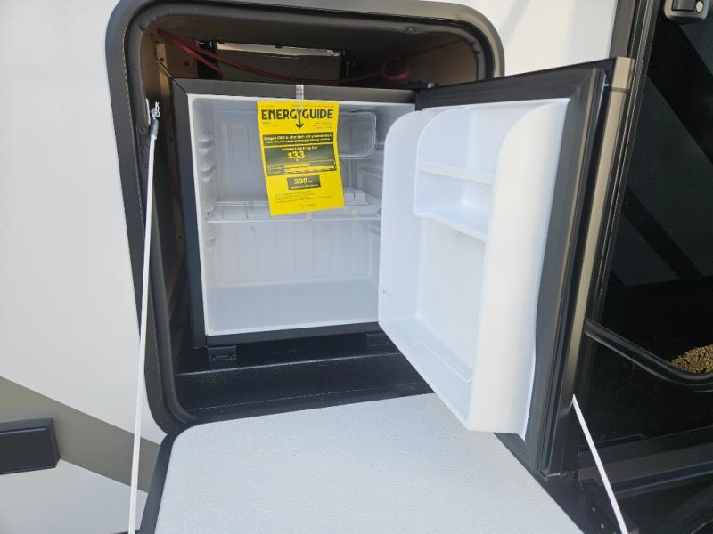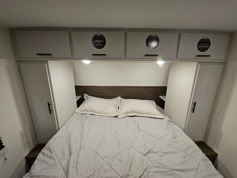 This travel trailer's modern rear kitchen is equipped with a reliable fridge, well-stocked pantry, and even a fireplace, making meal prep and cooking a great experience. The theater seating offers a cozy spot to unwind, while the dinette is perfect for sharing meals or stories with loved ones. The air fryer cooktop will also be useful for some easy delicious meals on the go, and the practical full bathroom to freshen up. The serene front bedroom is a peaceful retreat, featuring a comfortable camp king bed, spacious wardrobes, and ample overhead cabinets for storing your essentials.