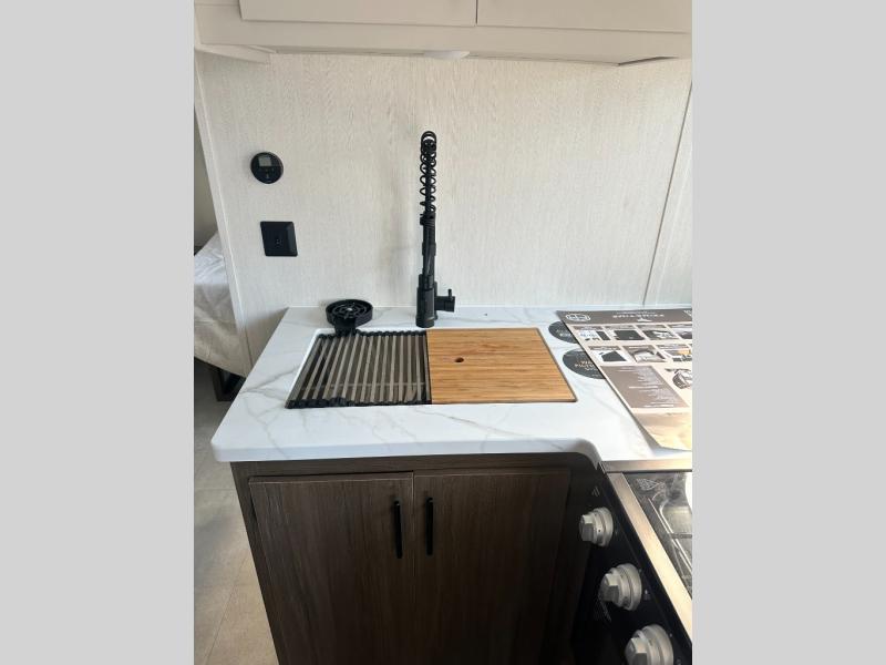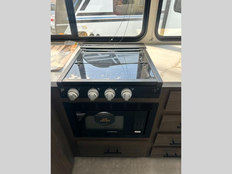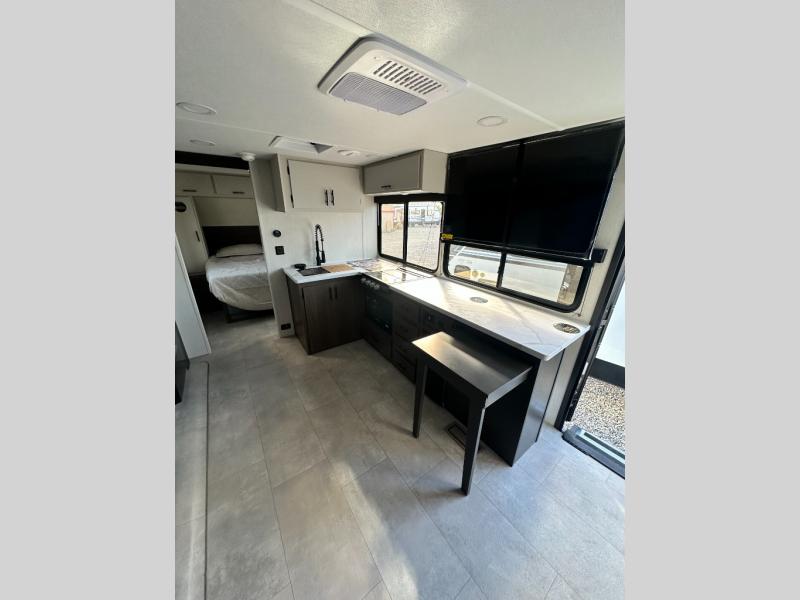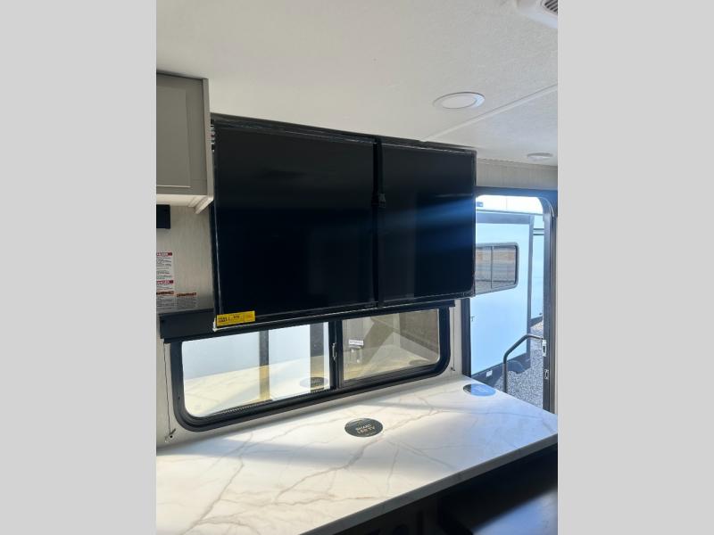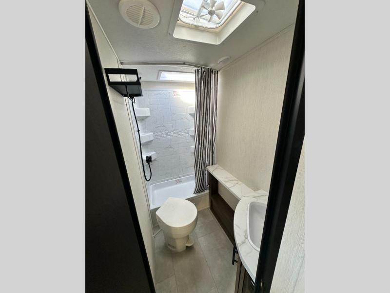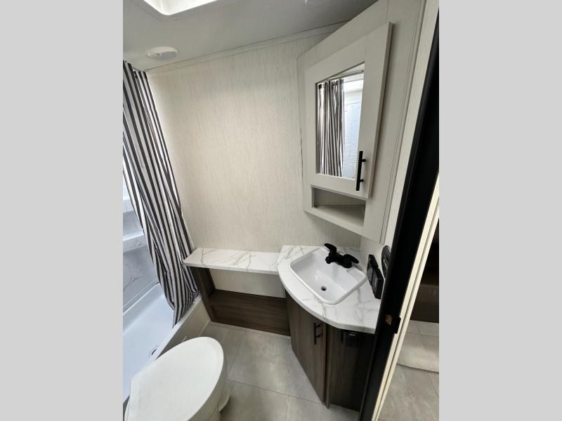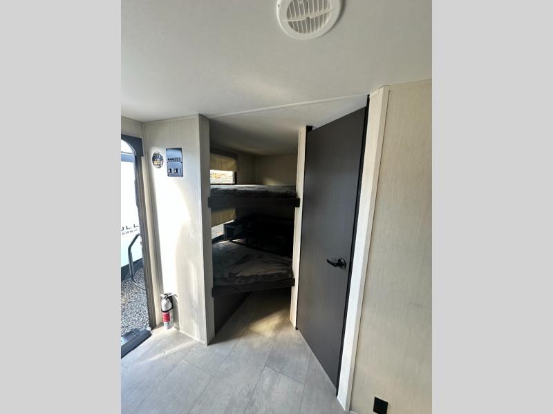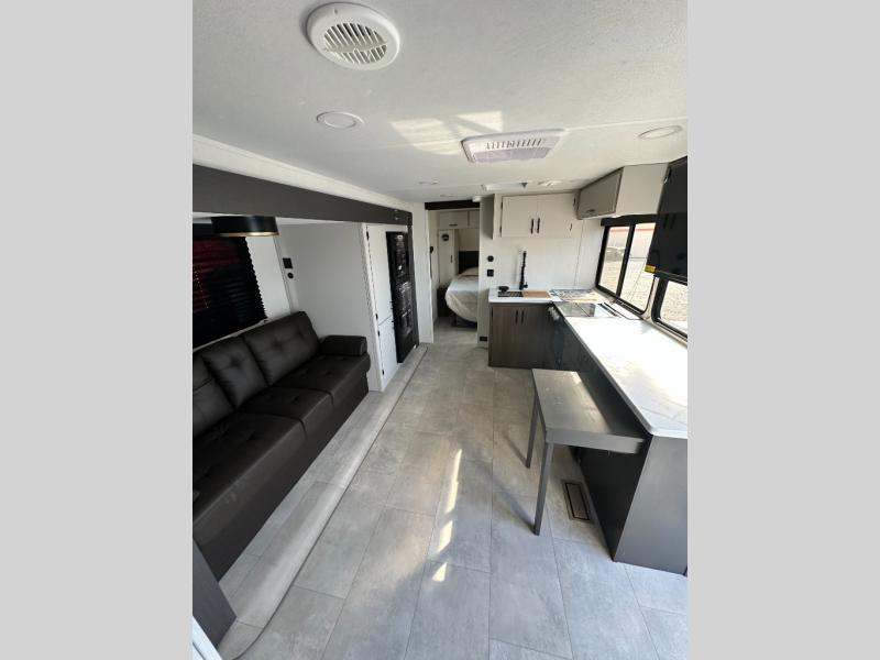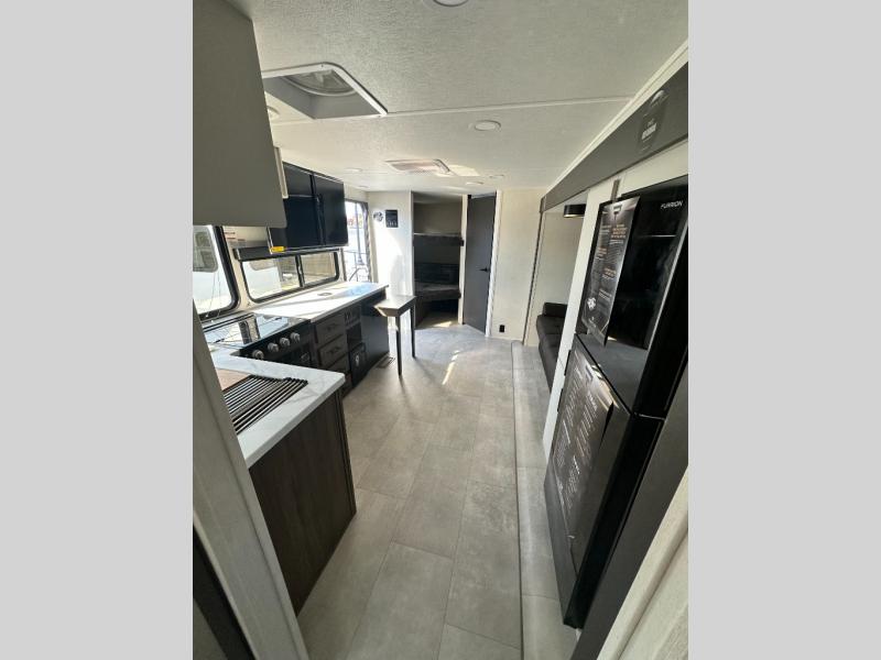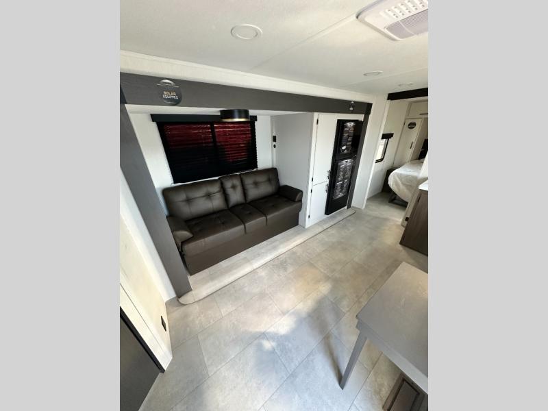 If you're looking for more comfort and a larger sleeping capacity in your next RV, this travel trailer is the one! There are double-size bunks in the rear corner, along with a ladder to easily hop into bed, and the full bath is in the other rear corner for easy nighttime use. You'll enjoy the front private bedroom with its queen bed and dual wardrobes for your things. In the morning, you can make breakfast in the full kitchen, then dine at the bartop with three stools. There is also a jack knife sofa within the slide out for more comfort and space, plus the pantry and refrigerator are here so you can easily grab a snack!