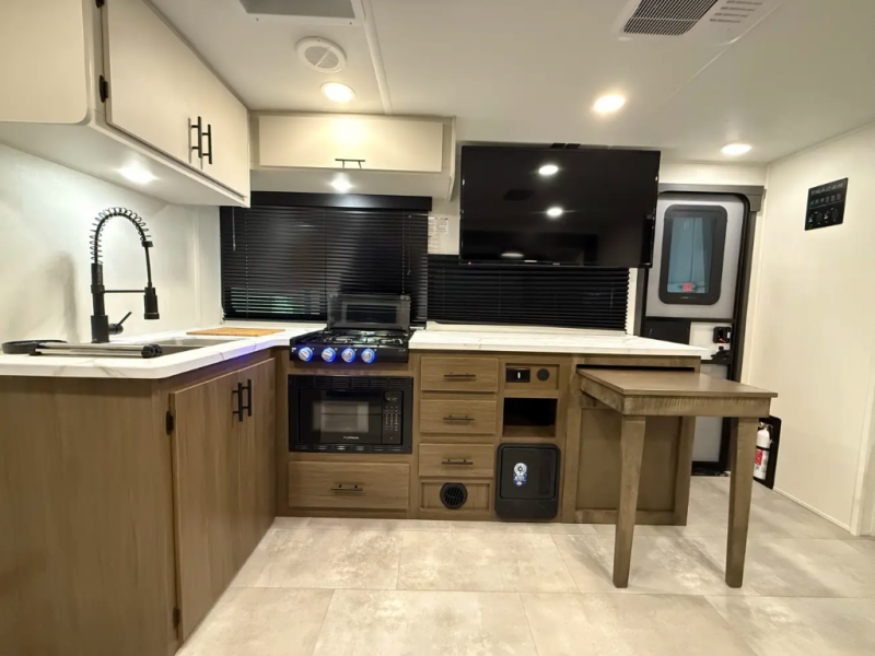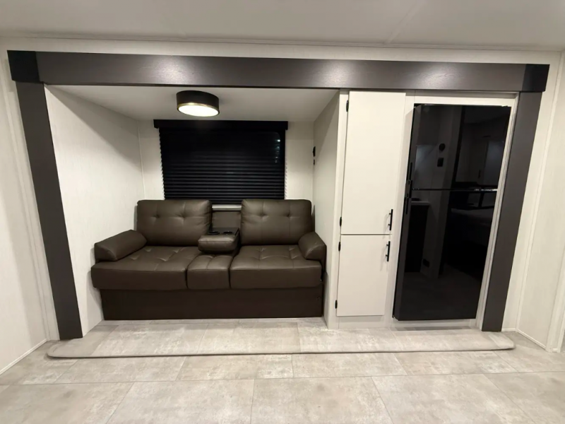 If you're looking for more comfort and a larger sleeping capacity in your next RV, this travel trailer is the one! There are double-size bunks in the rear corner, along with a ladder to easily hop into bed, and the full bath is in the other rear corner for easy nighttime use. You'll enjoy the front private bedroom with its camp king bed and dual wardrobes for your things. In the morning, you can make breakfast in the full kitchen, then dine at the bar top with three stools. There is also a jack knife sofa within the slide out for more comfort and space, plus the pantry and refrigerator are here so you can easily grab a snack!