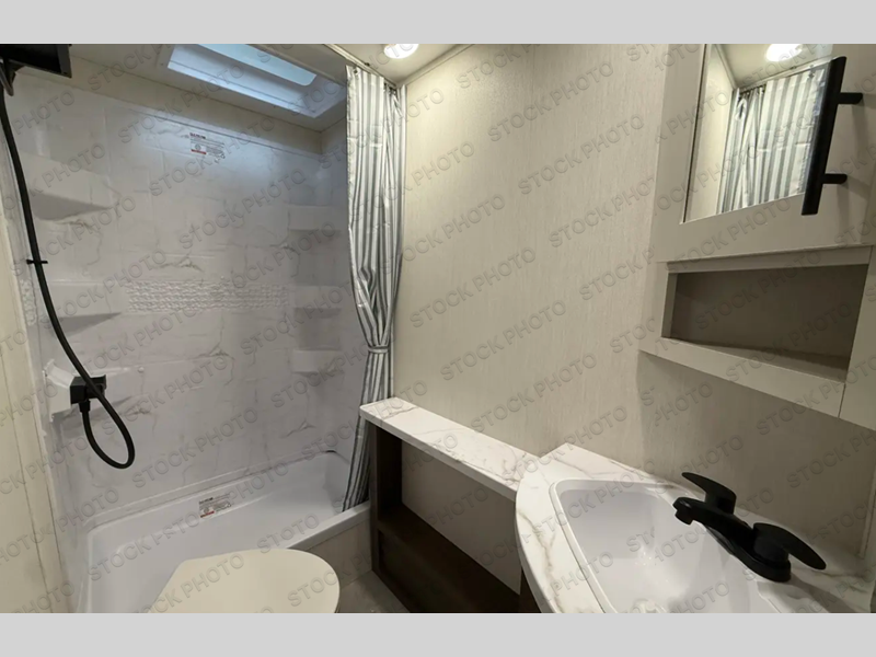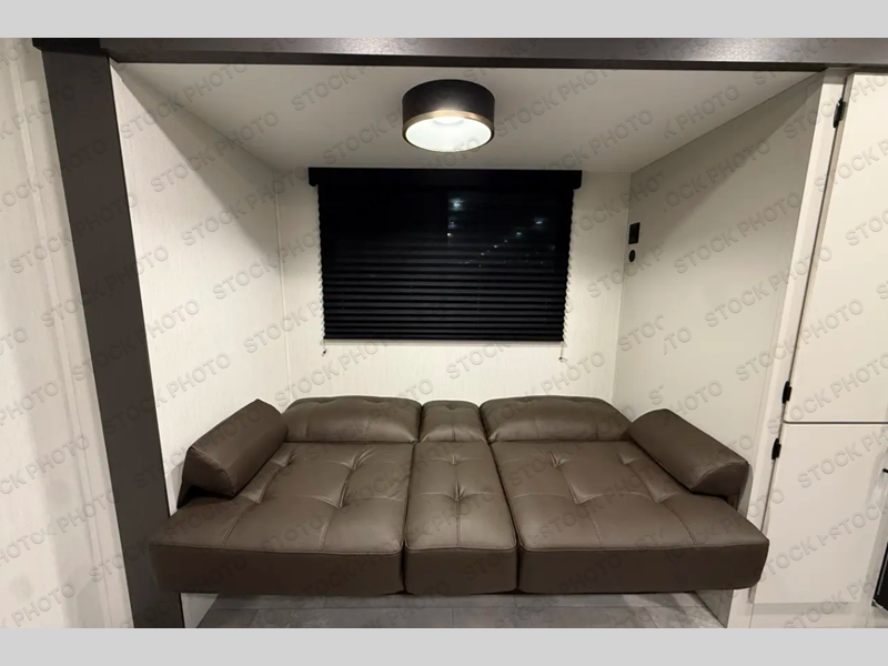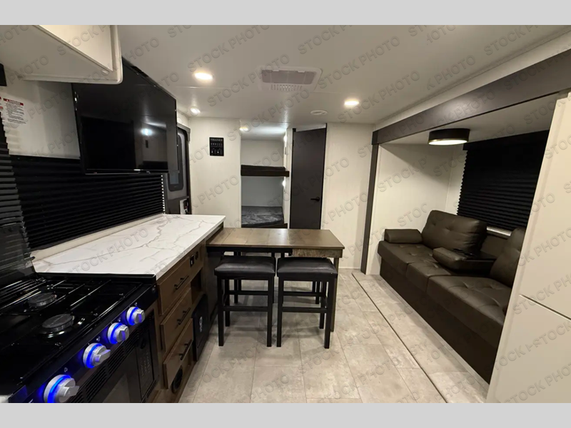 If you're looking for more comfort and a larger sleeping capacity in your next RV, this travel trailer is the one! There are double-size bunks in the rear corner, along with a ladder to easily hop into bed, and the full bath is in the other rear corner for easy nighttime use. You'll enjoy the front private bedroom with its camp king bed and dual wardrobes for your things. In the morning, you can make breakfast in the full kitchen, then dine at the bar top with three stools. There is also a jack knife sofa within the slide out for more comfort and space, plus the pantry and refrigerator are here so you can easily grab a snack!