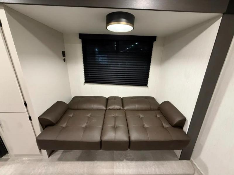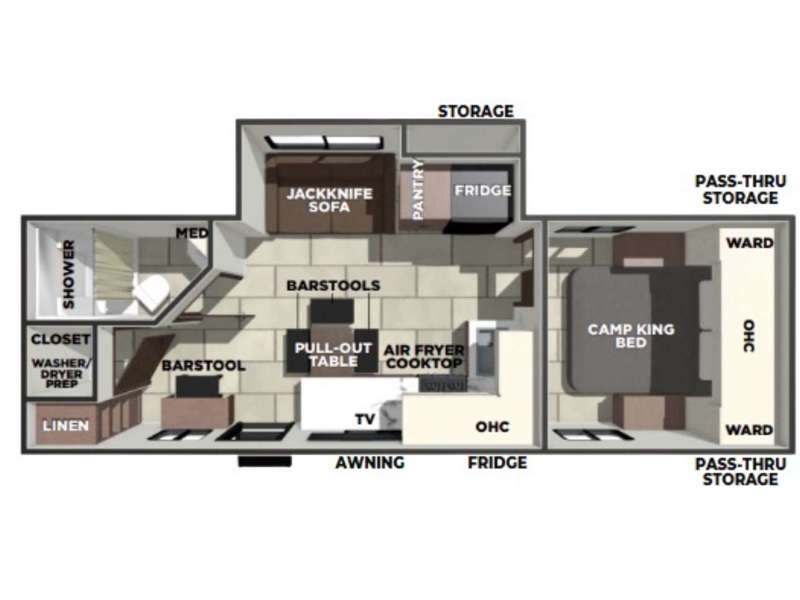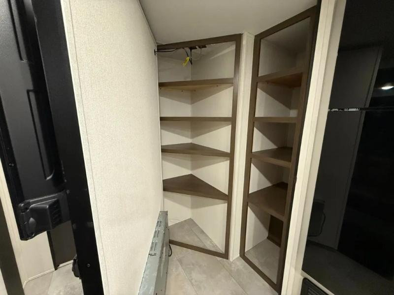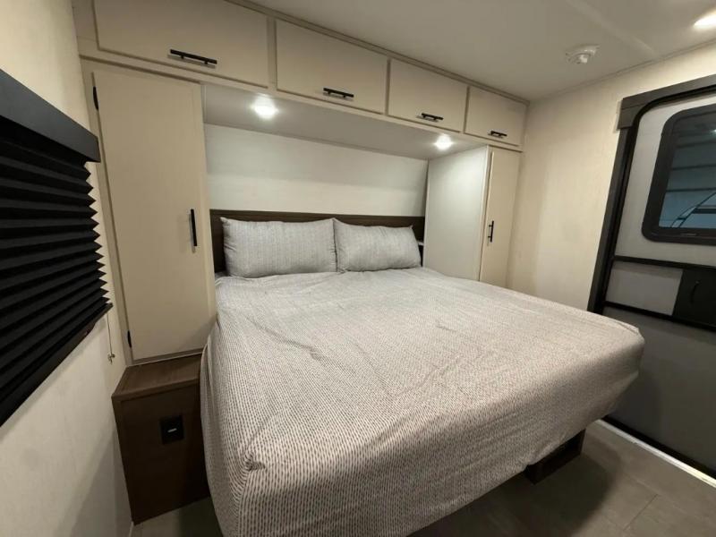The perfect couple's trailer is found with this RV! You'll enjoy the front private bedroom with its queen bed and dual wardrobes for your things, and the rear corner full bath on board will let you stay clean throughout your trip. In the morning, you can make breakfast in the full kitchen, then dine at the bartop with three stools. There is also a theater seat within the slide out for more comfort and space, plus the pantry and refrigerator are here so you can easily grab a snack. A desk with a chair lets you work while you're away from home if you need to, and there is even a closet with washer and dryer prep if you choose to add those appliances!