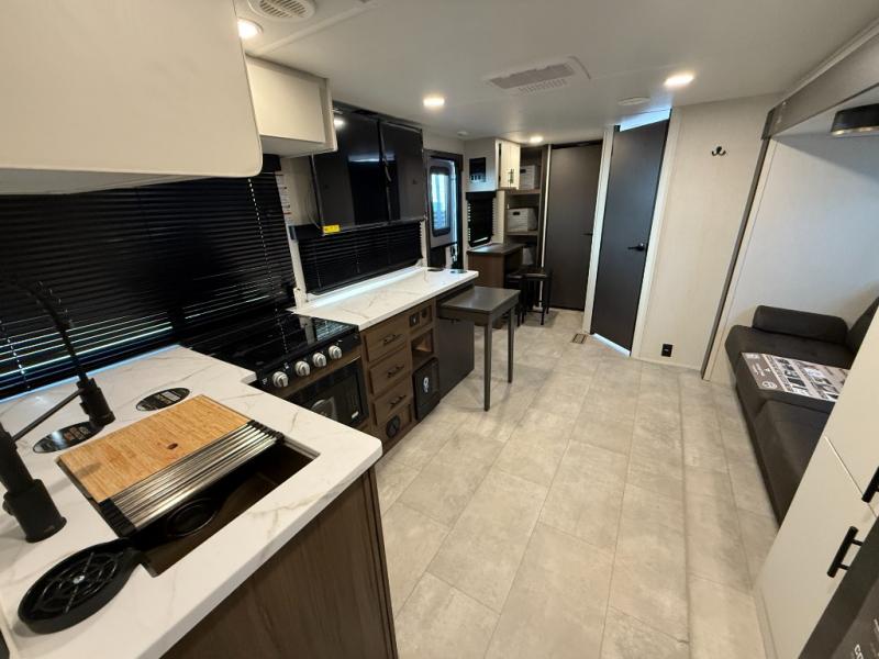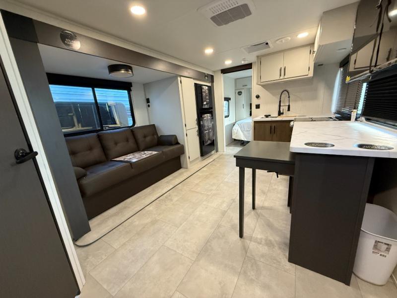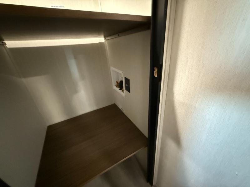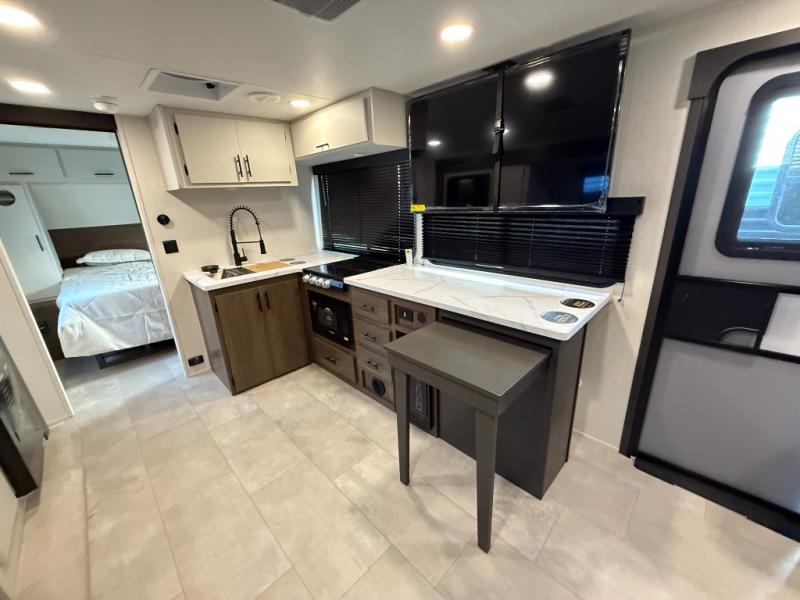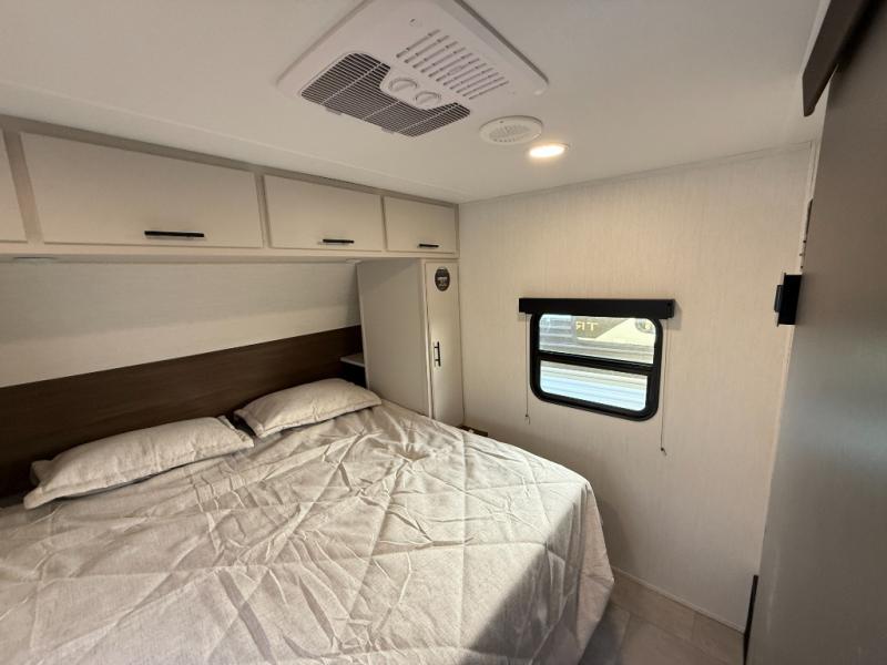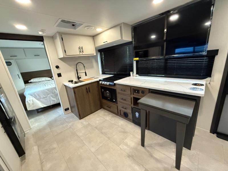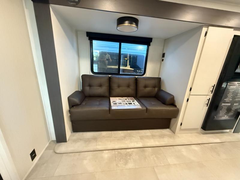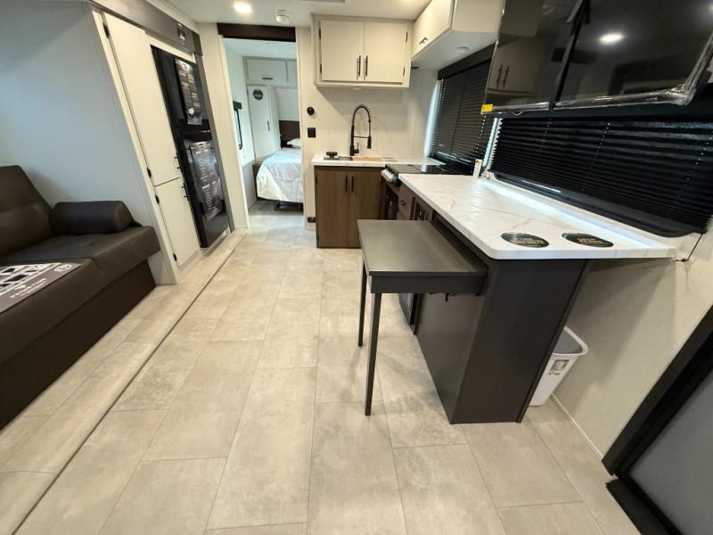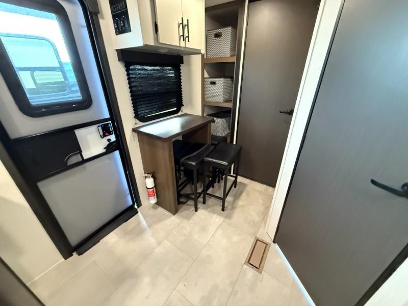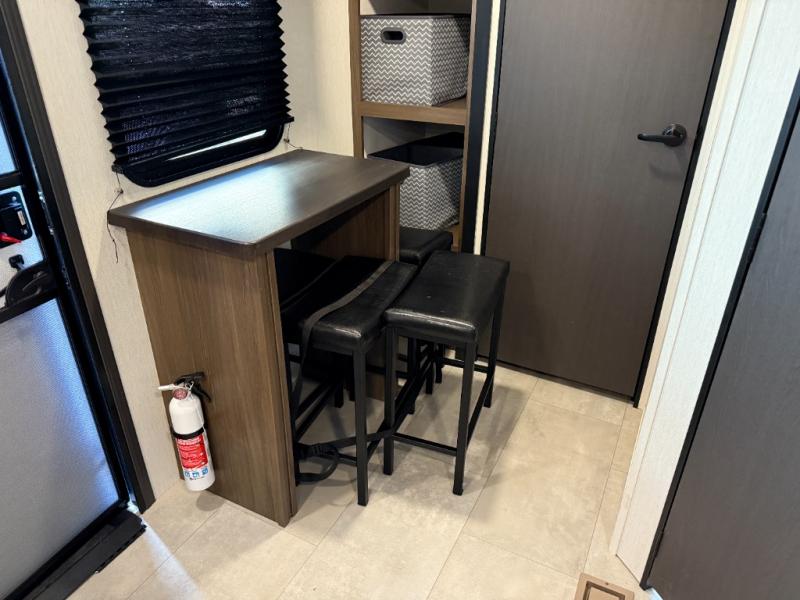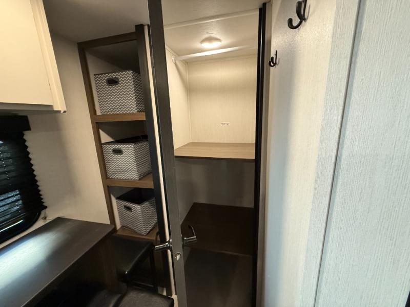 The perfect couple's trailer is found with this RV! You'll enjoy the front private bedroom with its queen bed and dual wardrobes for your things, and the rear corner full bath on board will let you stay clean throughout your trip. In the morning, you can make breakfast in the full kitchen, then dine at the bartop with three stools. There is also a theater seat within the slide out for more comfort and space, plus the pantry and refrigerator are here so you can easily grab a snack. A desk with a chair lets you work while you're away from home if you need to, and there is even a closet with washer and dryer prep if you choose to add those appliances!