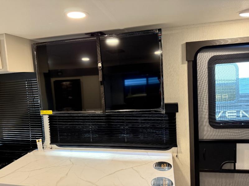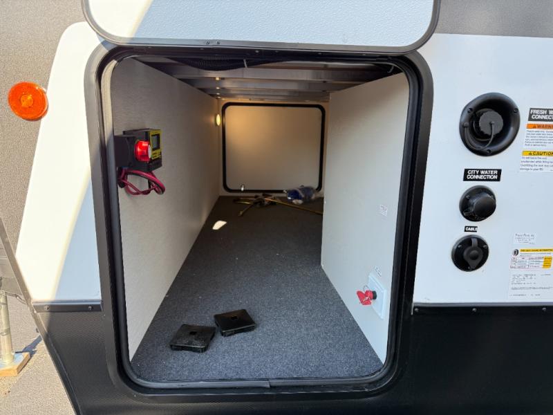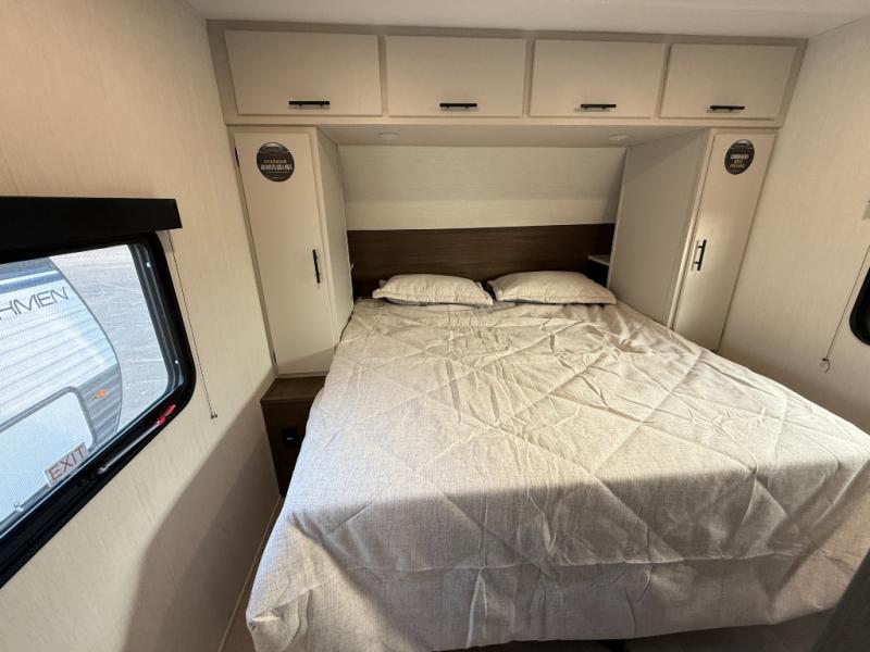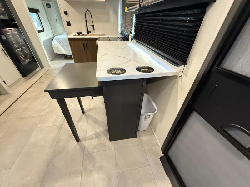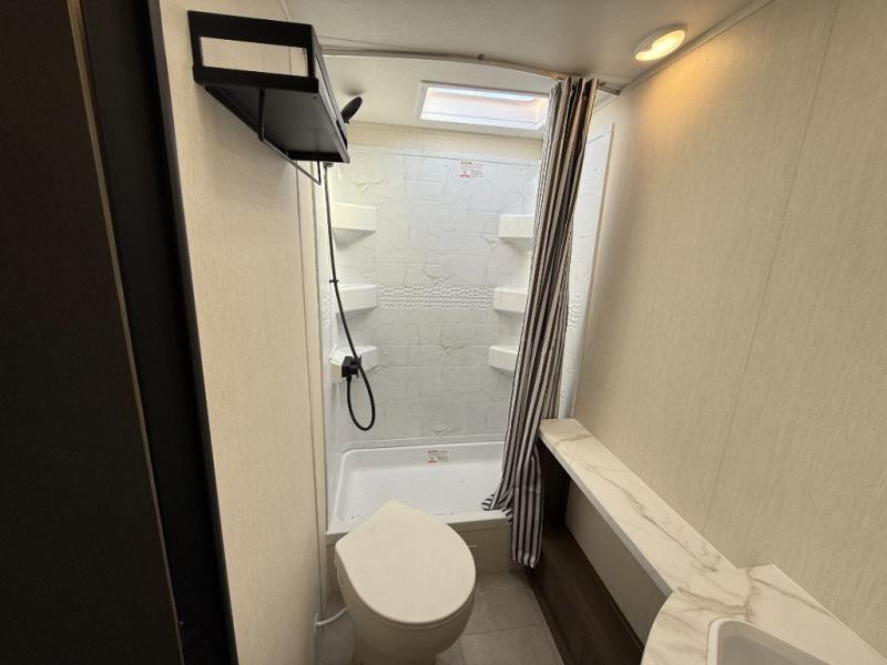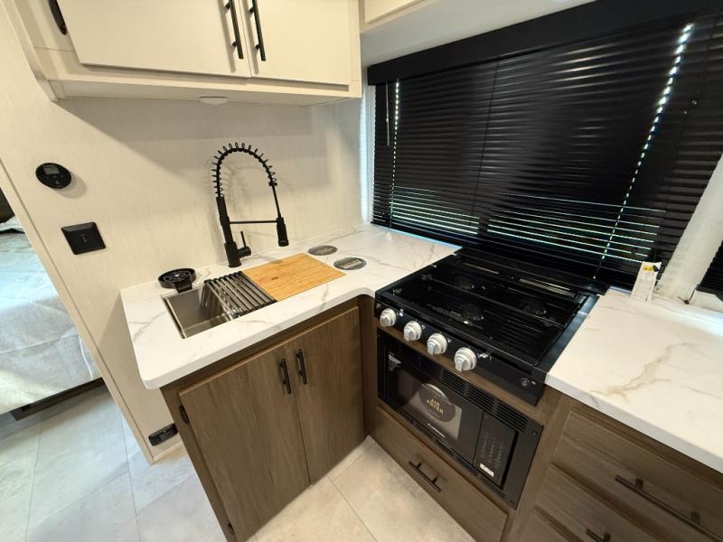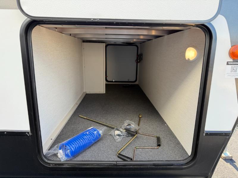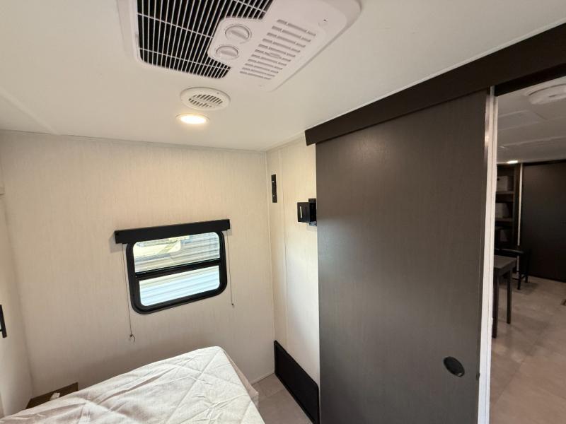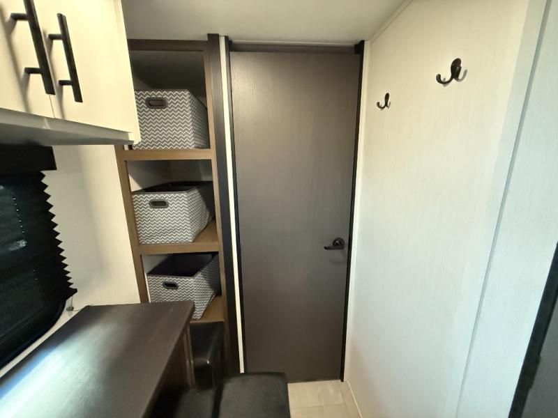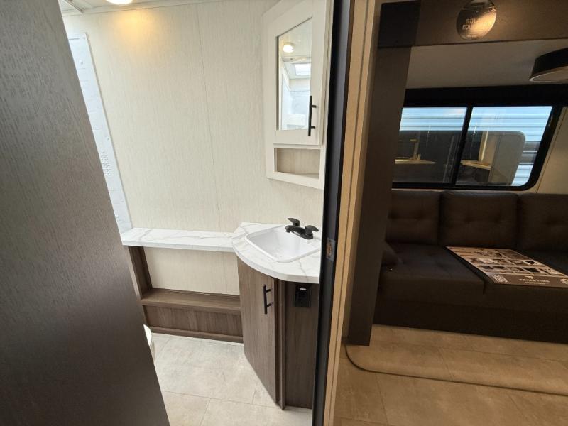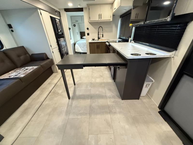 The perfect couple's trailer is found with this RV! You'll enjoy the front private bedroom with its queen bed and dual wardrobes for your things, and the rear corner full bath on board will let you stay clean throughout your trip. In the morning, you can make breakfast in the full kitchen, then dine at the bartop with three stools. There is also a theater seat within the slide out for more comfort and space, plus the pantry and refrigerator are here so you can easily grab a snack. A desk with a chair lets you work while you're away from home if you need to, and there is even a closet with washer and dryer prep if you choose to add those appliances!