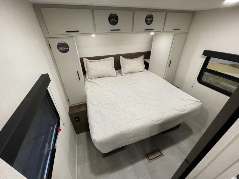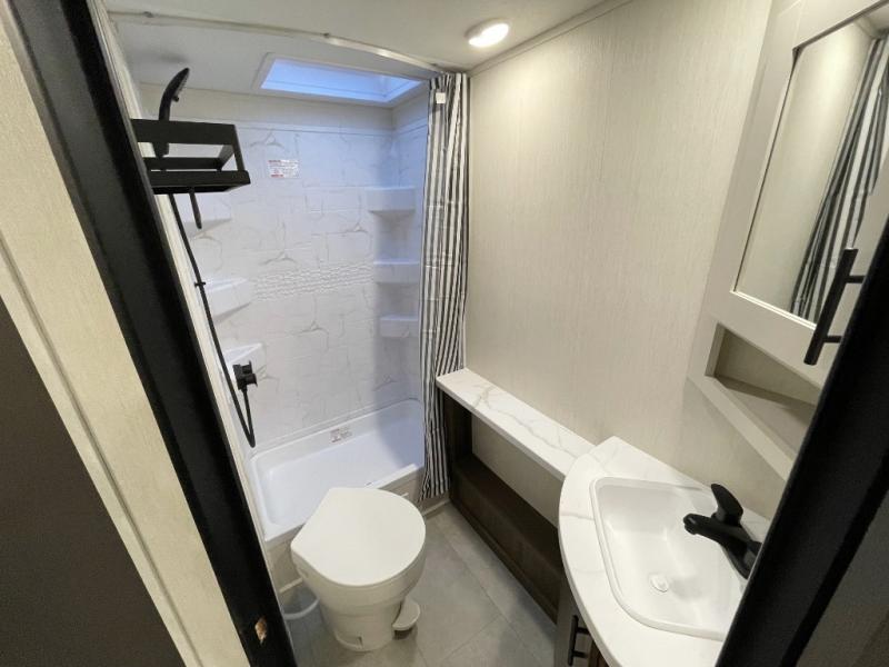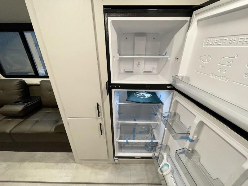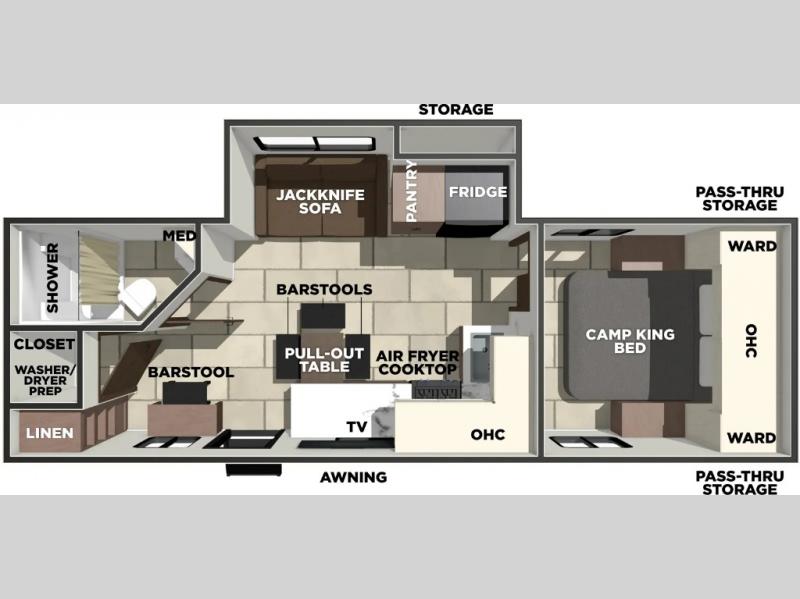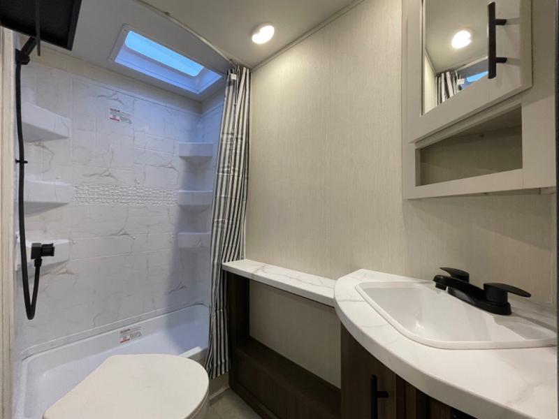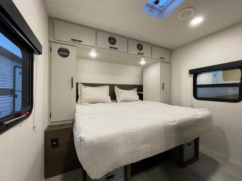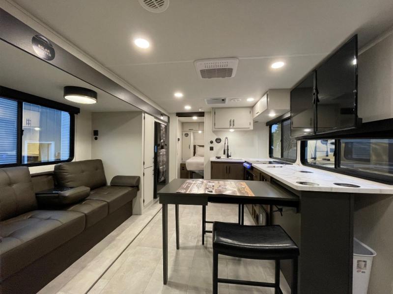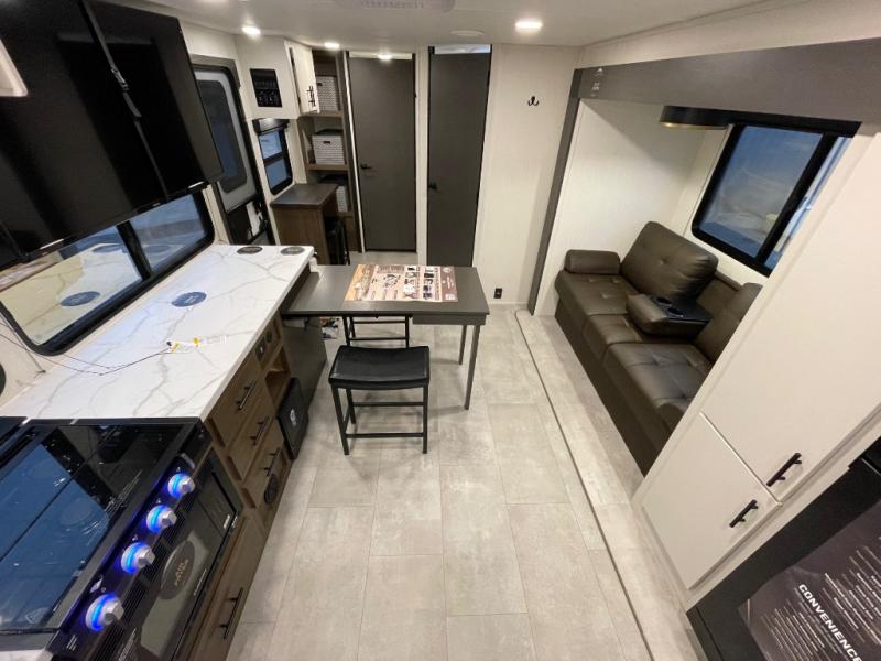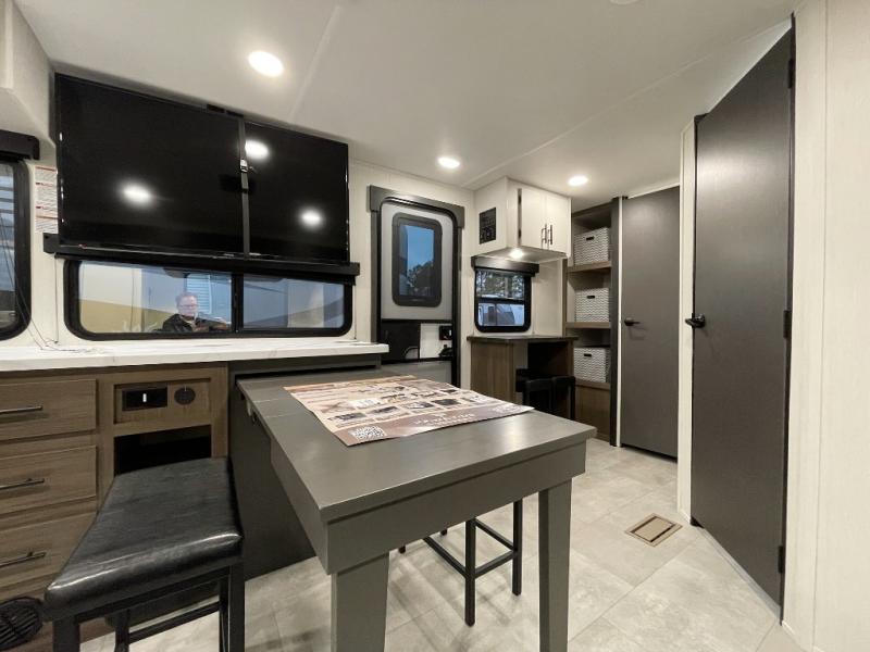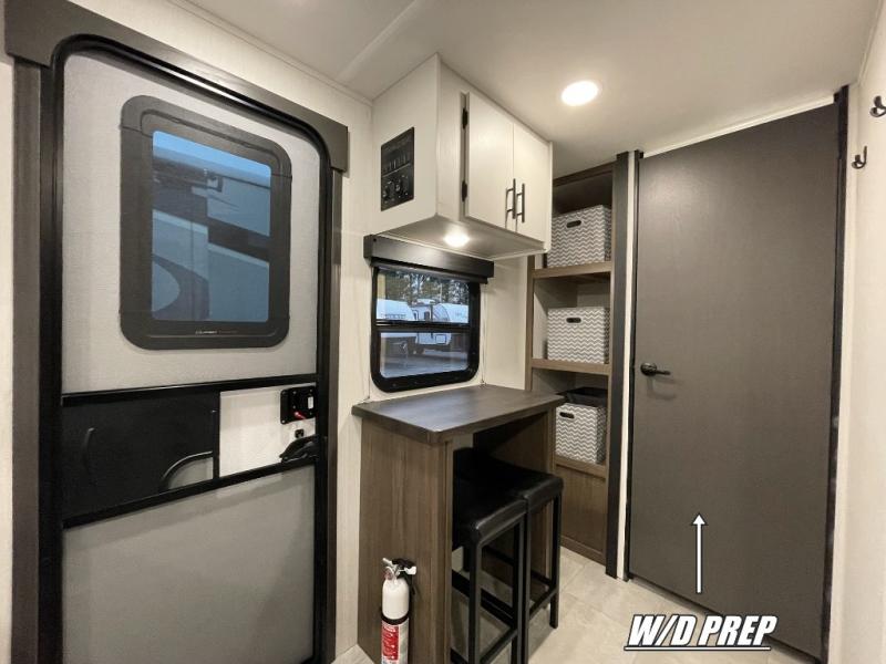 The perfect couple's trailer is found with this RV! You'll enjoy the front private bedroom with its camp king bed and dual wardrobes for your things, and the rear corner full bath on board will let you stay clean throughout your trip. In the morning, you can make breakfast in the full kitchen, then dine at the bar top with three stools. There is also a theater seat within the slide out for more comfort and space, plus the pantry and refrigerator are here so you can easily grab a snack. A desk with a chair lets you work while you're away from home if you need to, and there is even a closet with washer and dryer prep if you choose to add those appliances!