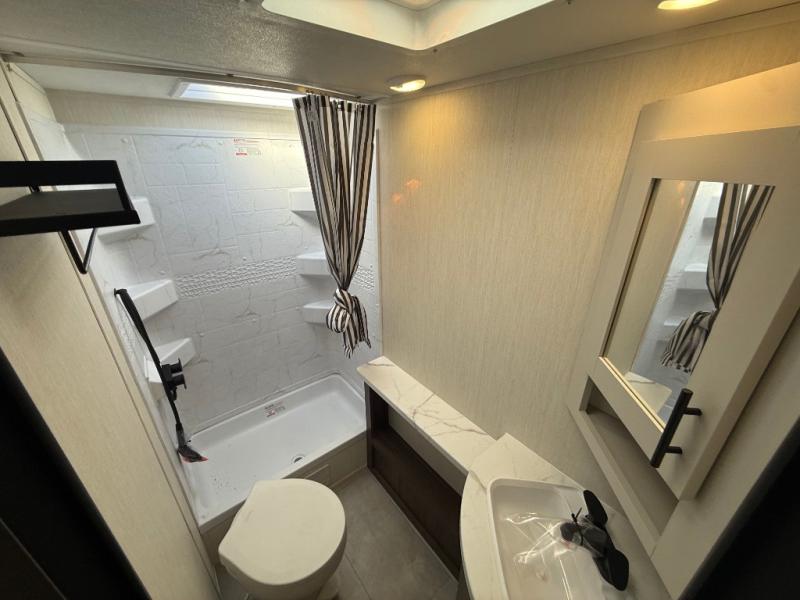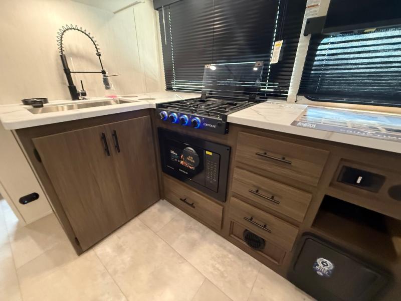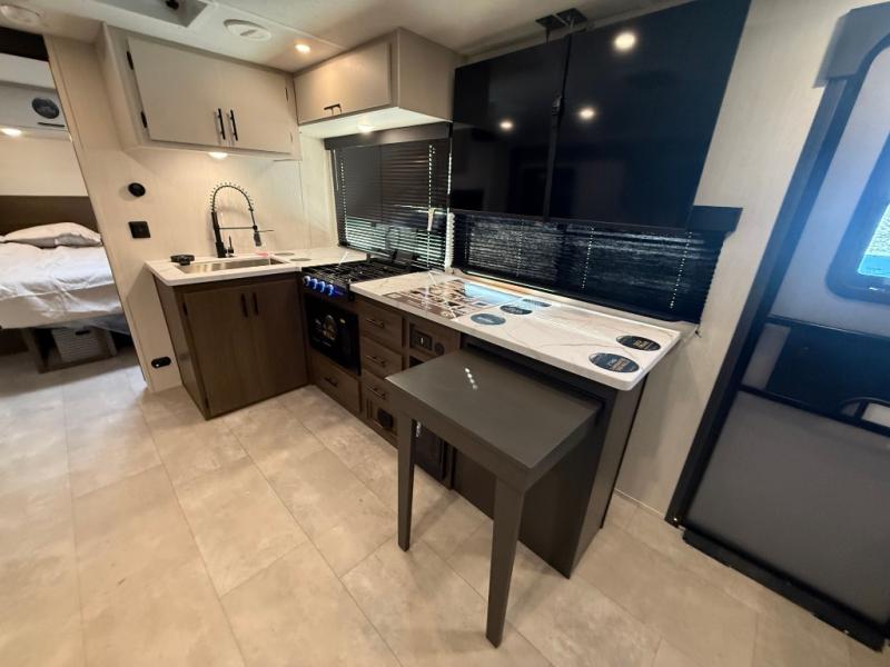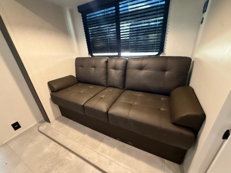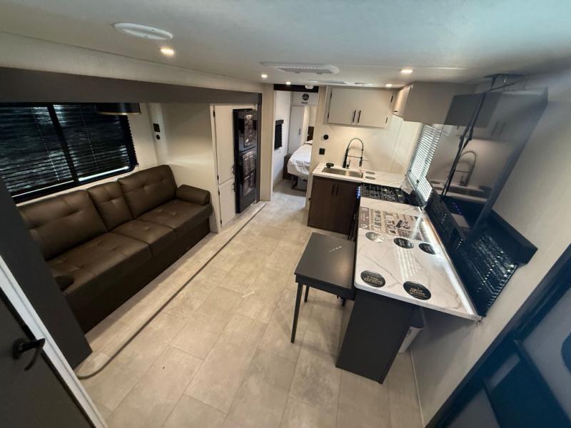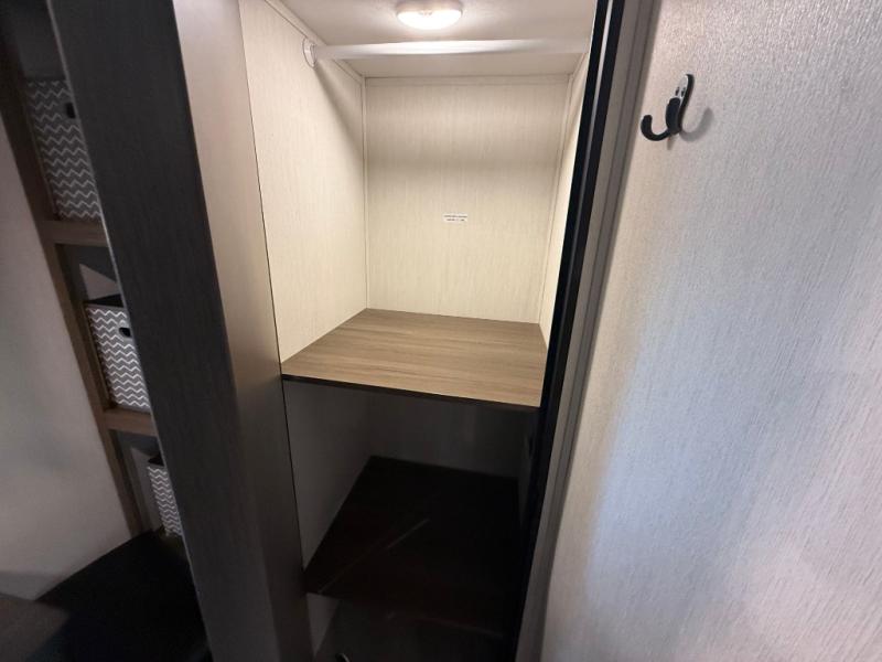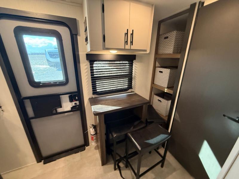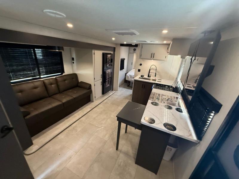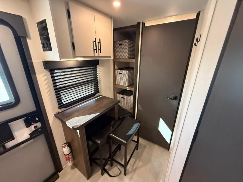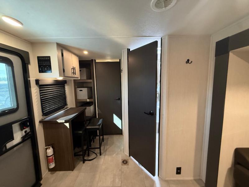 The perfect couple's trailer is found with this RV! You'll enjoy the front private bedroom with its camp king bed and dual wardrobes for your things, and the rear corner full bath on board will let you stay clean throughout your trip. In the morning, you can make breakfast in the full kitchen, then dine at the bar top with three stools. There is also a theater seat within the slide out for more comfort and space, plus the pantry and refrigerator are here so you can easily grab a snack. A desk with a chair lets you work while you're away from home if you need to, and there is even a closet with washer and dryer prep if you choose to add those appliances!
