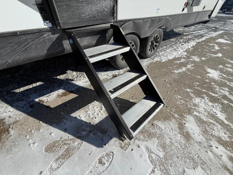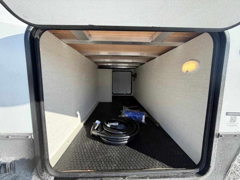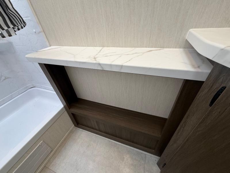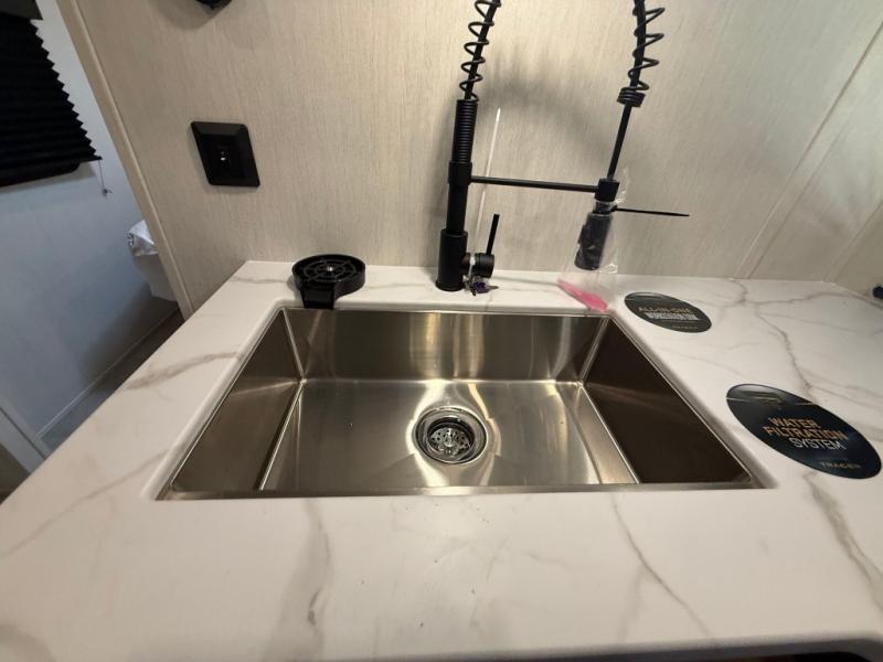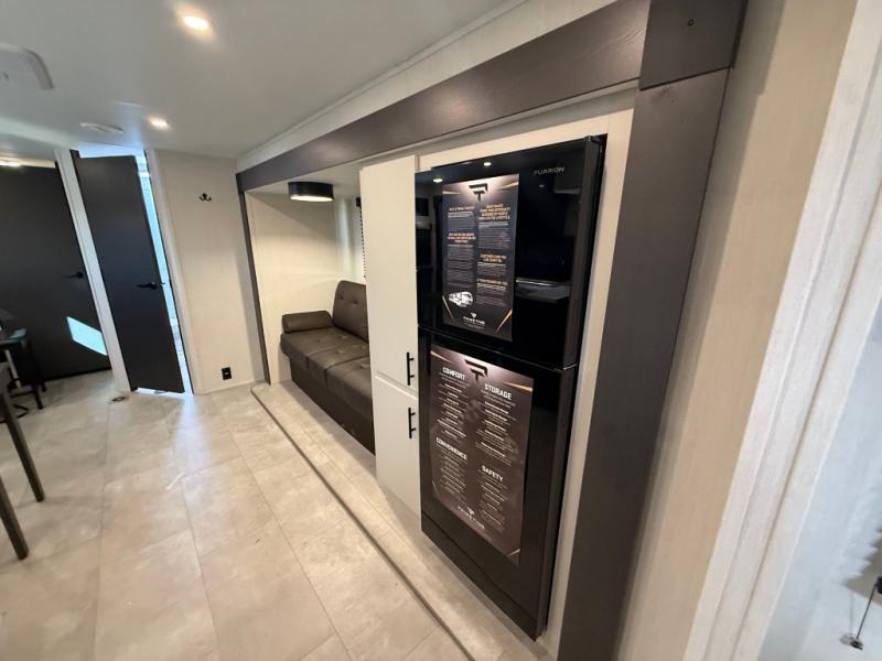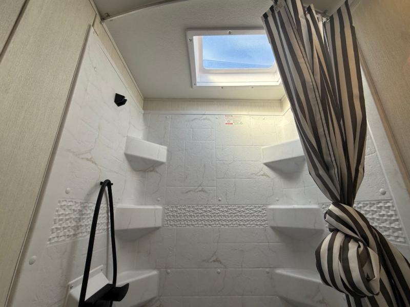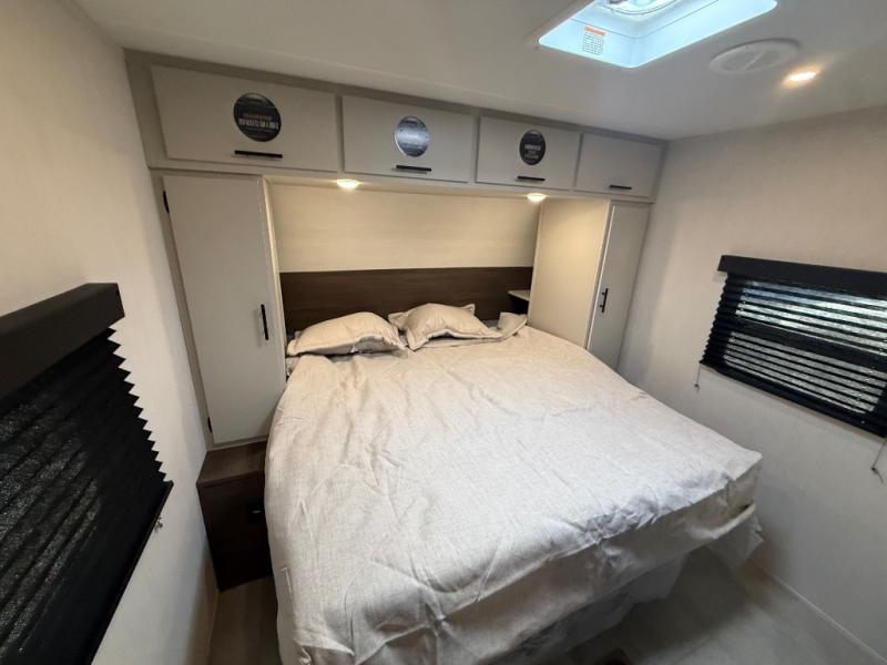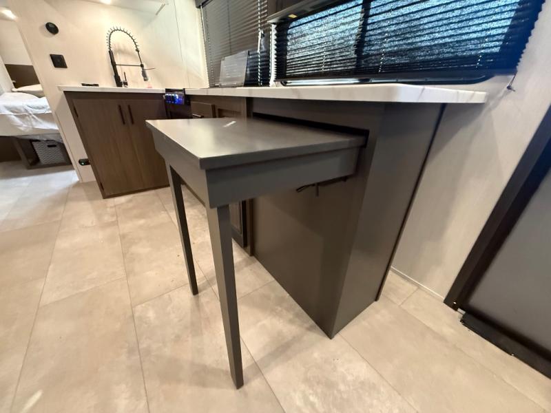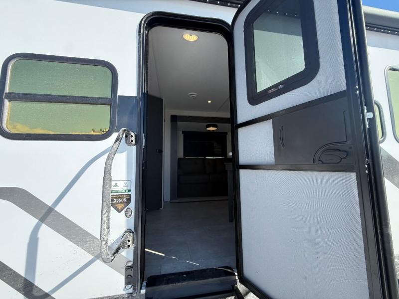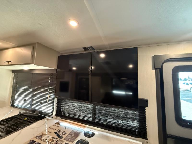 The perfect couple's trailer is found with this RV! You'll enjoy the front private bedroom with its camp king bed and dual wardrobes for your things, and the rear corner full bath on board will let you stay clean throughout your trip. In the morning, you can make breakfast in the full kitchen, then dine at the bar top with three stools. There is also a theater seat within the slide out for more comfort and space, plus the pantry and refrigerator are here so you can easily grab a snack. A desk with a chair lets you work while you're away from home if you need to, and there is even a closet with washer and dryer prep if you choose to add those appliances!
