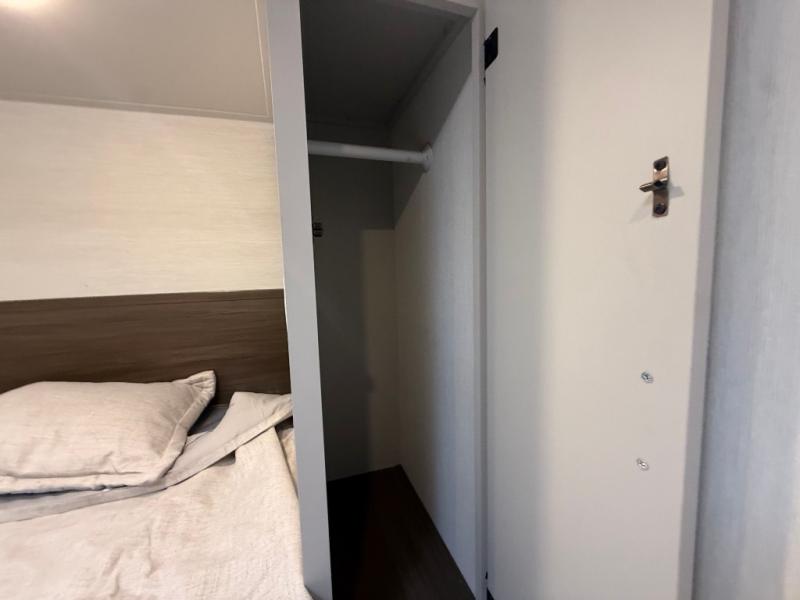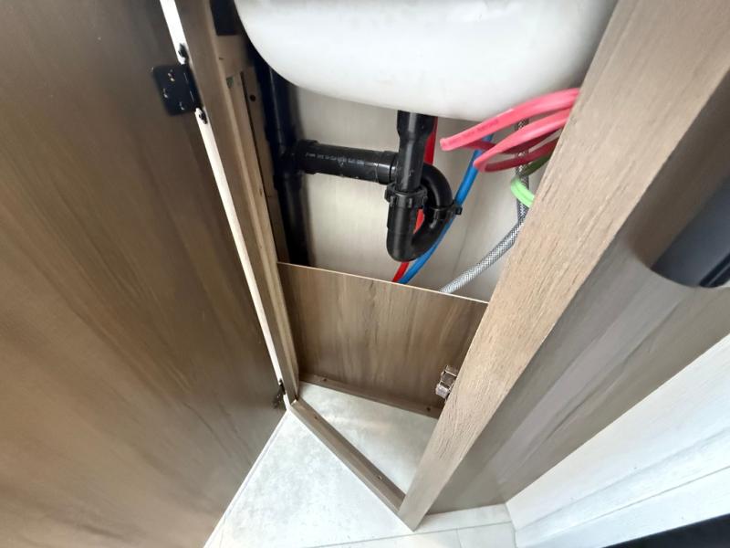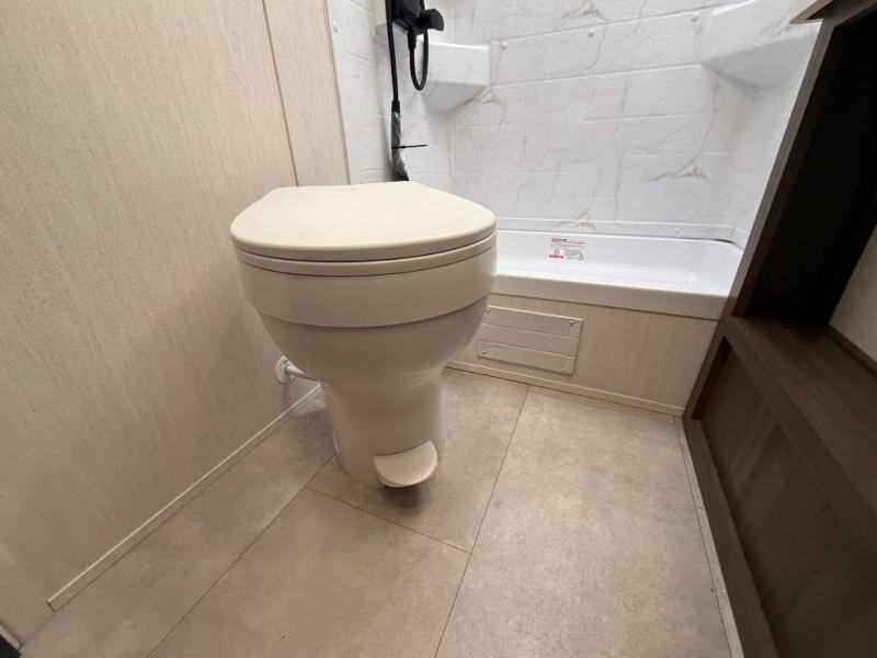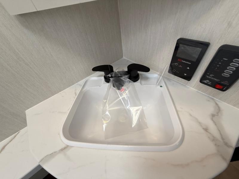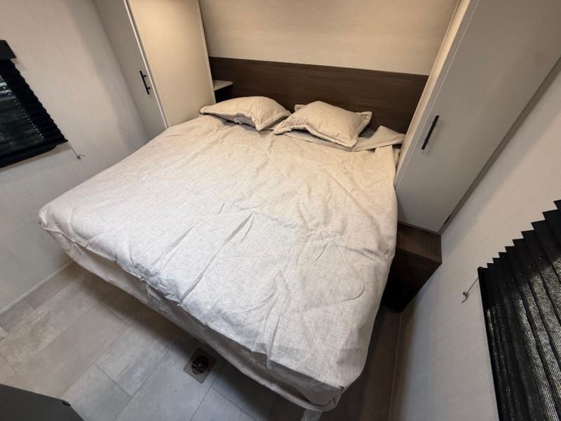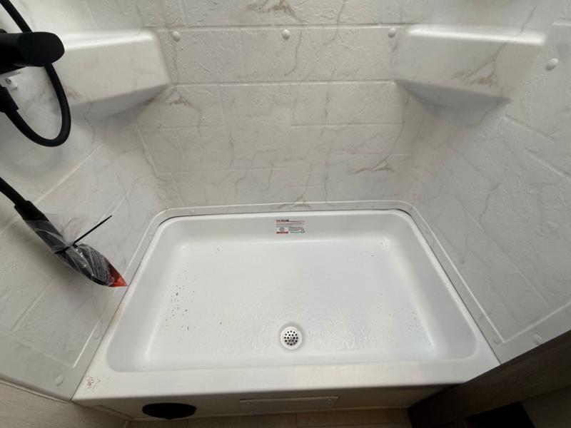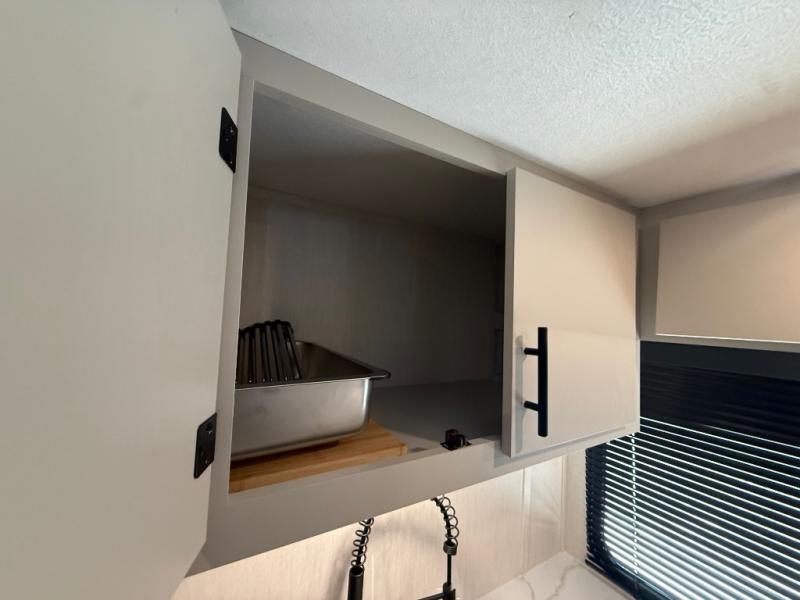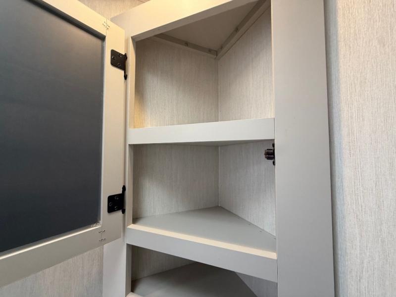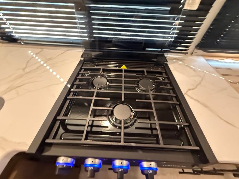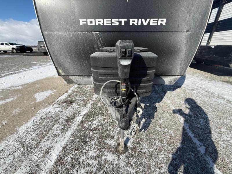 The perfect couple's trailer is found with this RV! You'll enjoy the front private bedroom with its camp king bed and dual wardrobes for your things, and the rear corner full bath on board will let you stay clean throughout your trip. In the morning, you can make breakfast in the full kitchen, then dine at the bar top with three stools. There is also a theater seat within the slide out for more comfort and space, plus the pantry and refrigerator are here so you can easily grab a snack. A desk with a chair lets you work while you're away from home if you need to, and there is even a closet with washer and dryer prep if you choose to add those appliances!