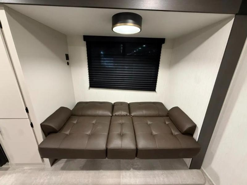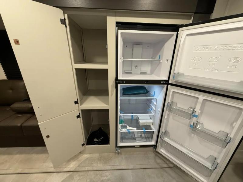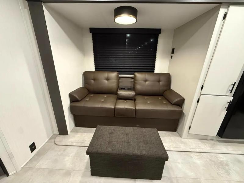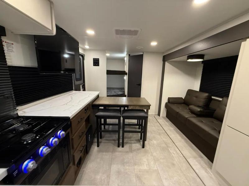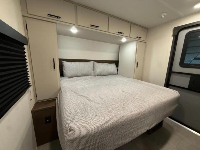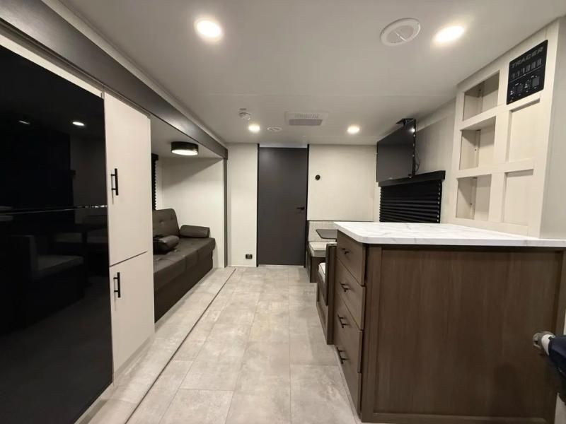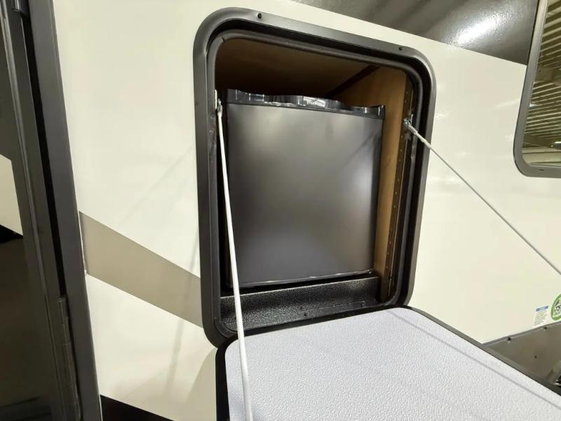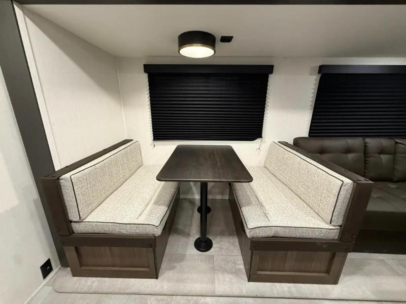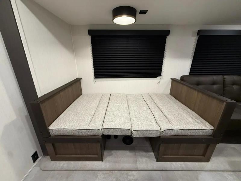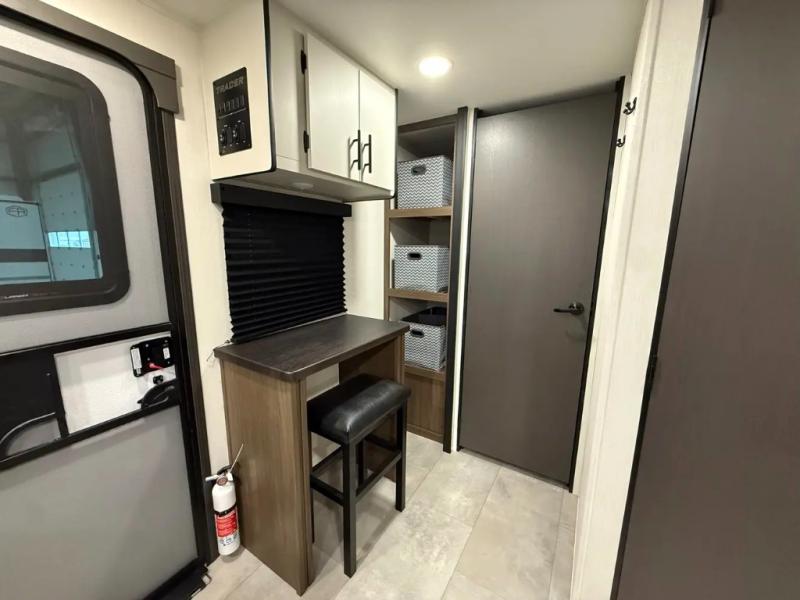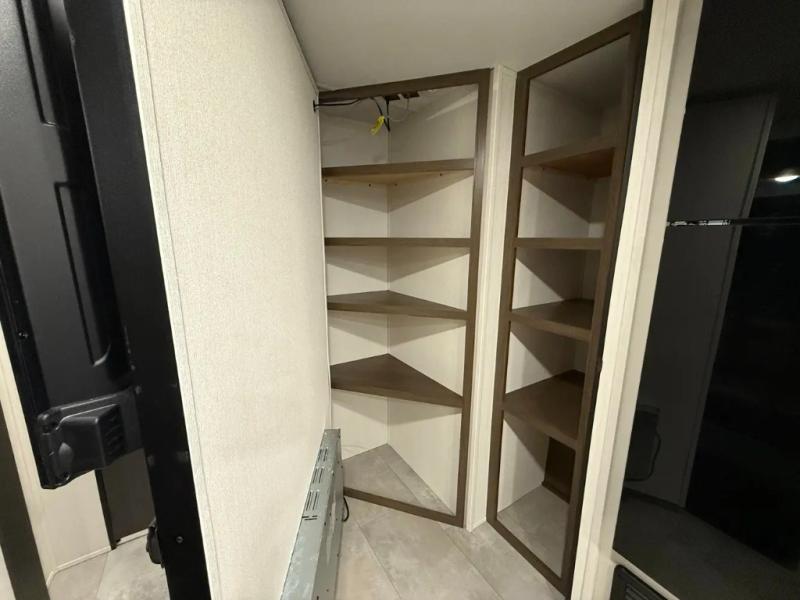 If you're looking for more comfort and a larger sleeping capacity in your next RV, this travel trailer is the one! There are double-size bunks in the rear corner, along with a ladder to easily hop into bed, and the full bath is in the other rear corner for easy nighttime use. You'll enjoy the front private bedroom with its queen bed and dual wardrobes for your things, and a separate closet with washer and dryer prep if you choose to add those appliances. And one of the dual entry doors is located here so you can easily slip out in the morning without waking everyone else up in the trailer! In the morning, you can make breakfast in the full kitchen, then dine at the booth dinette within the large slide out. There is also a theater here for more comfort. This travel trailer also includes plenty of storage space, including a walk-in pantry with shelves, an additional storage closet, and a pass-thru storage outside for fishing poles!