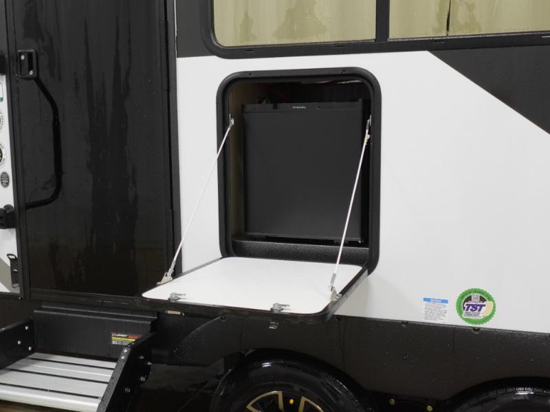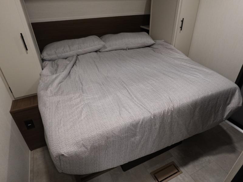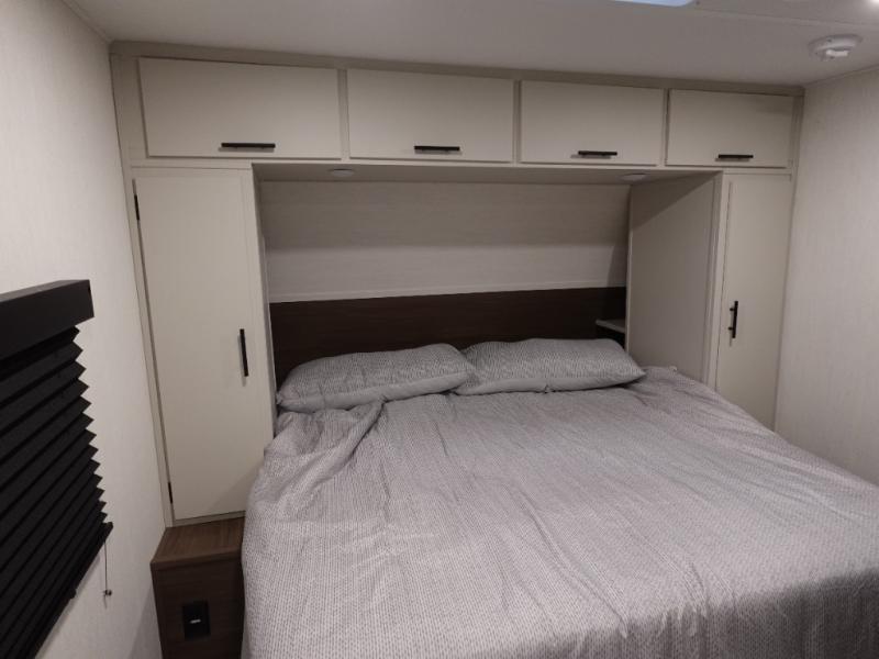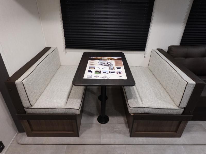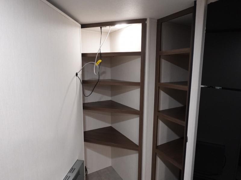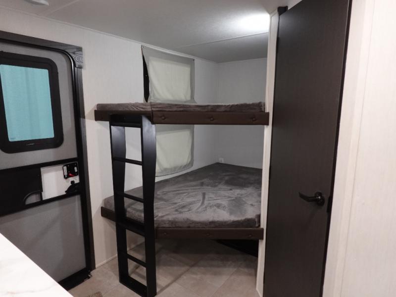 If you're looking for more comfort and a larger sleeping capacity in your next RV, this travel trailer is the one! There are double-size bunks in the rear corner, along with a ladder to easily hop into bed, and the full bath is in the other rear corner for easy nighttime use. You'll enjoy the front private bedroom with its queen bed and dual wardrobes for your things, and a separate closet with washer and dryer prep if you choose to add those appliances. And one of the dual entry doors is located here so you can easily slip out in the morning without waking everyone else up in the trailer! In the morning, you can make breakfast in the full kitchen, then dine at the booth dinette within the large slide out. There is also a jack knife sofa here for more comfort. This travel trailer also includes plenty of storage space, including a walk-in pantry with shelves, an additional storage closet, and a pass-thru storage outside for fishing poles!
