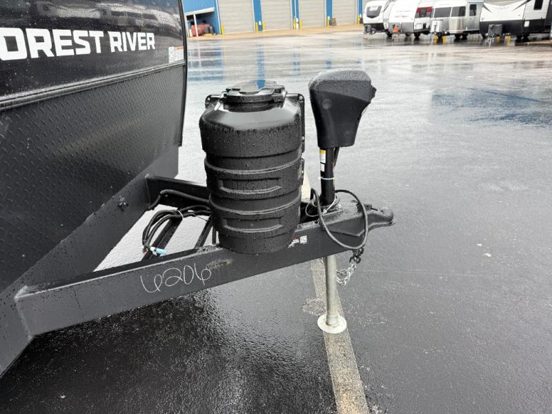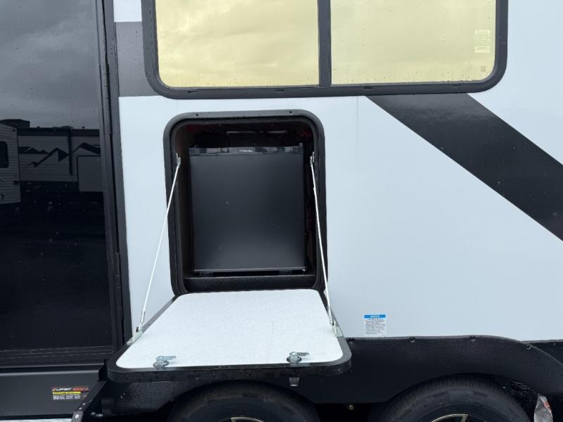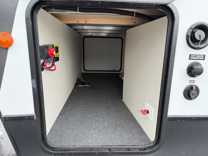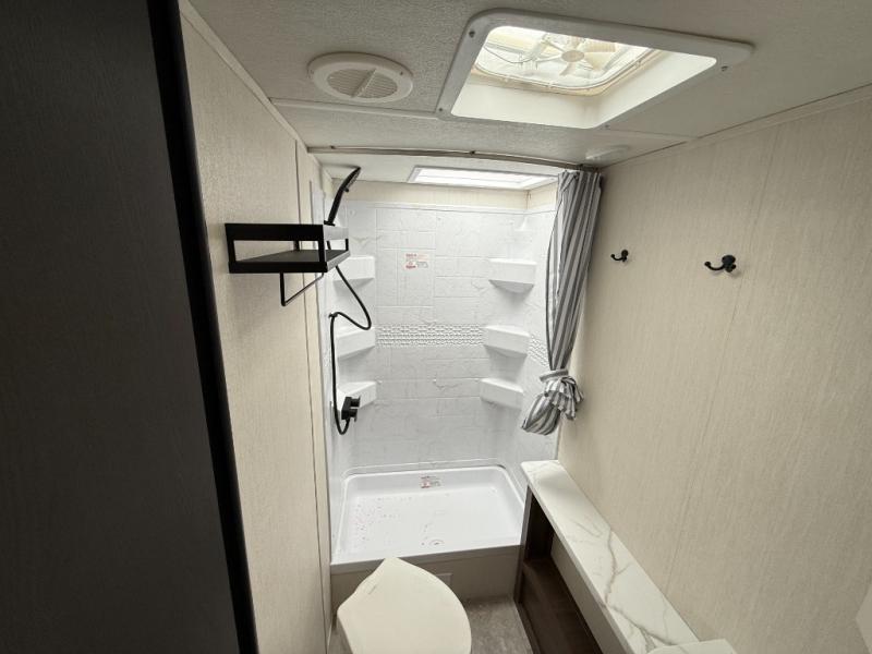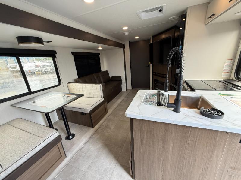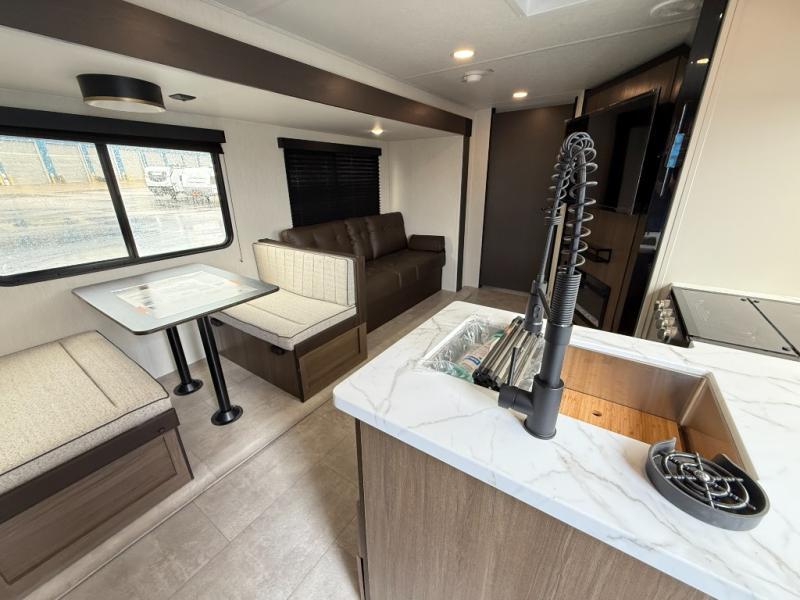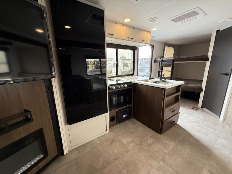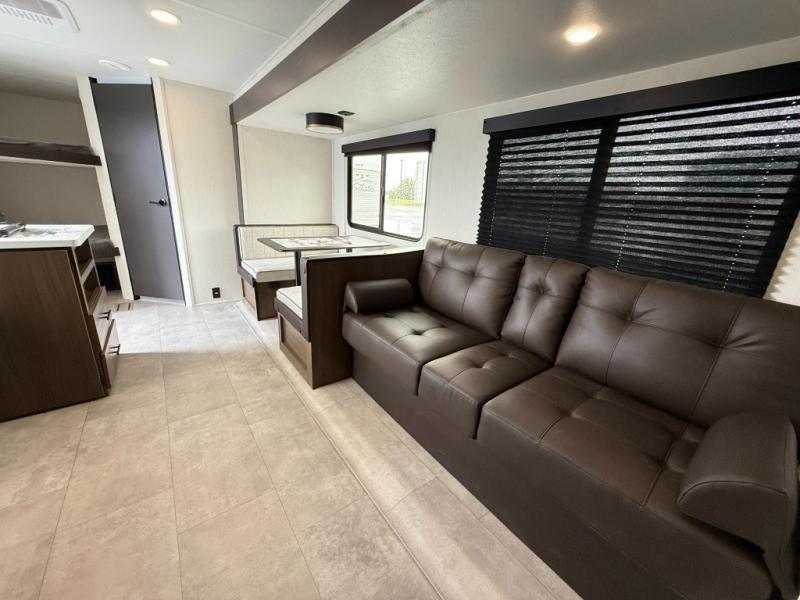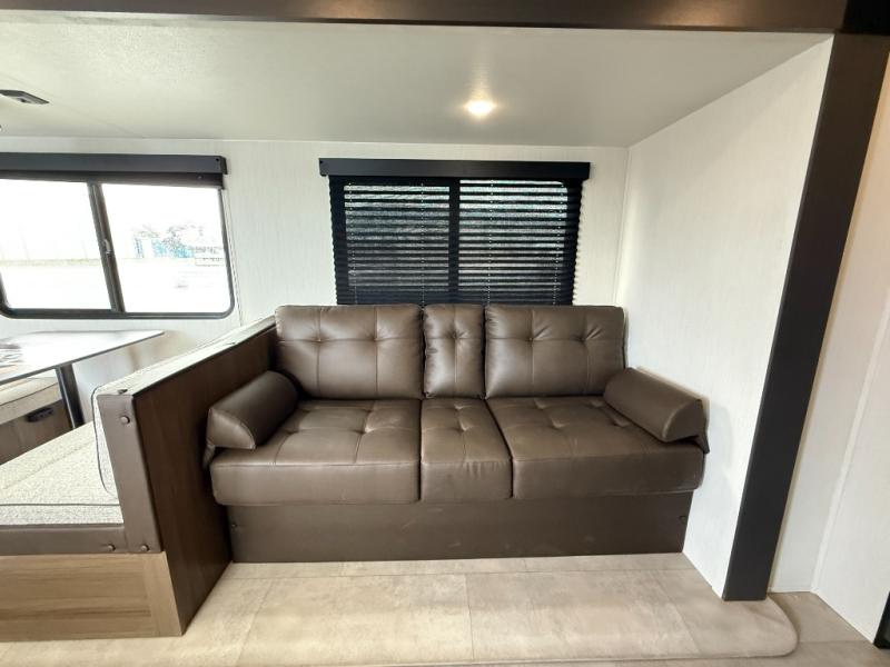 If you're looking for more comfort and a larger sleeping capacity in your next RV, this travel trailer is the one! There are double-size bunks in the rear corner, along with a ladder to easily hop into bed, and the full bath is in the other rear corner for easy nighttime use. You'll enjoy the front private bedroom with its camp king bed and dual wardrobes for your things, and a separate closet with washer and dryer prep if you choose to add those appliances. And one of the dual entry doors is located here so you can easily slip out in the morning without waking everyone else up in the trailer! In the morning, you can make breakfast in the full kitchen, then dine at the booth dinette within the large slide out. There is also a jack knife sofa here for more comfort. This travel trailer also includes plenty of storage space, including a walk-in pantry with shelves, an additional storage closet, and a pass-thru storage outside for fishing poles!