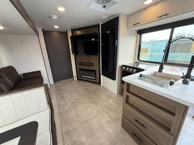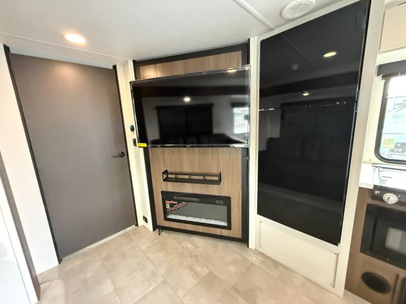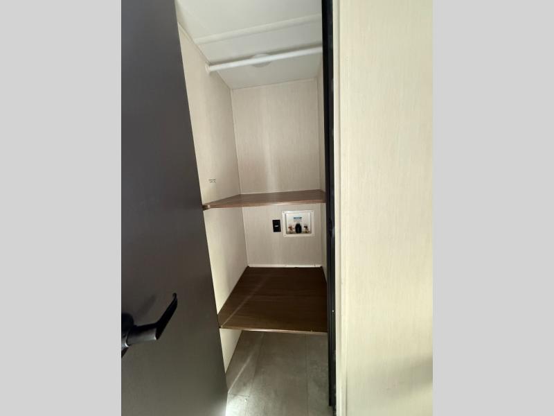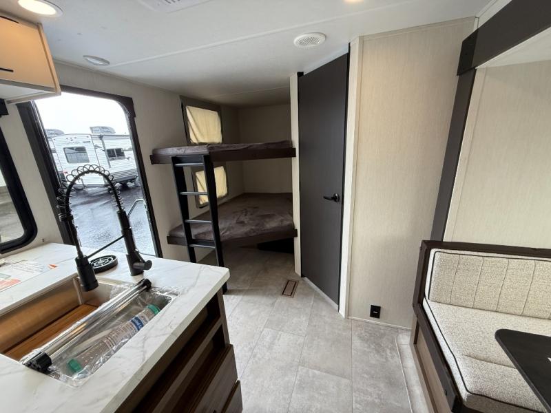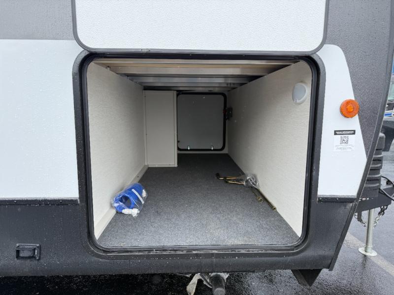 If you're looking for more comfort and a larger sleeping capacity in your next RV, this travel trailer is the one! There are double-size bunks in the rear corner, along with a ladder to easily hop into bed, and the full bath is in the other rear corner for easy nighttime use. You'll enjoy the front private bedroom with its queen bed and dual wardrobes for your things, and a separate closet with washer and dryer prep if you choose to add those appliances. And one of the dual entry doors is located here so you can easily slip out in the morning without waking everyone else up in the trailer! In the morning, you can make breakfast in the full kitchen, then dine at the booth dinette within the large slide out. There is also a theater here for more comfort. This travel trailer also includes plenty of storage space, including a walk-in pantry with shelves, an additional storage closet, and a pass-thru storage outside for fishing poles!