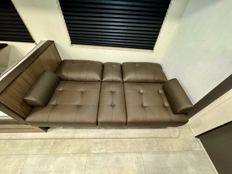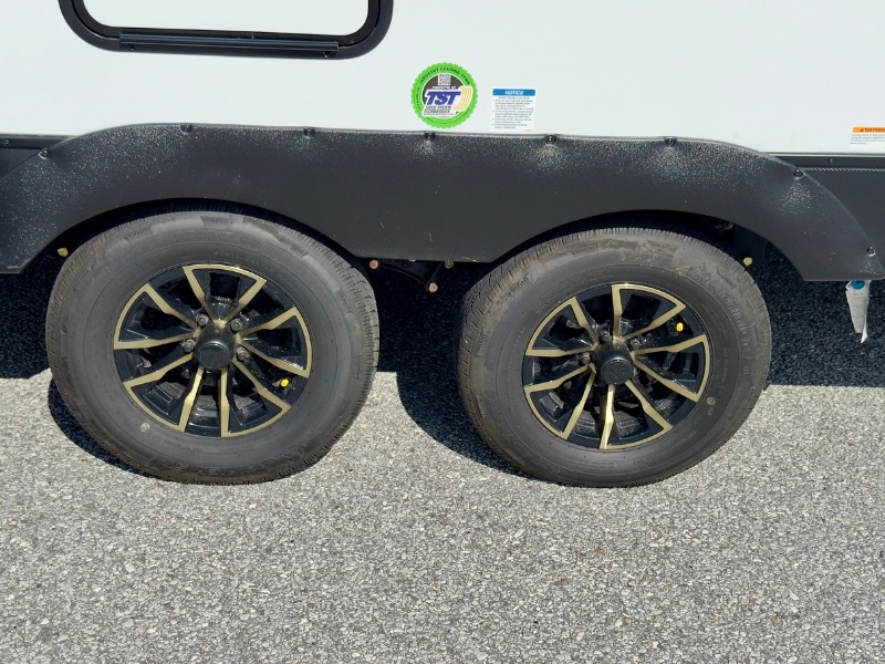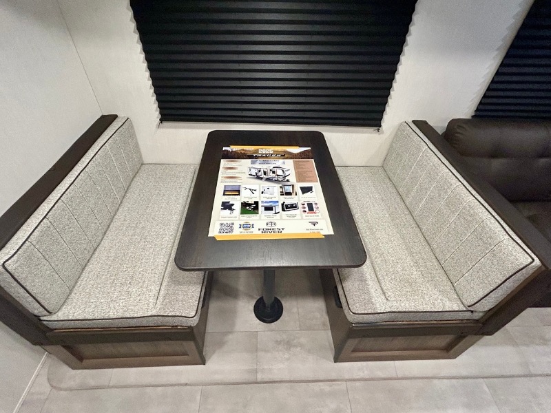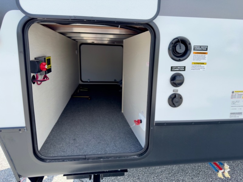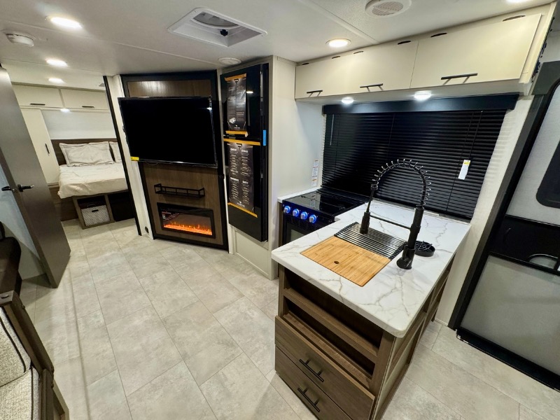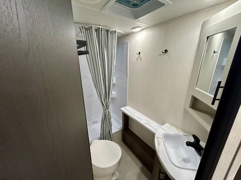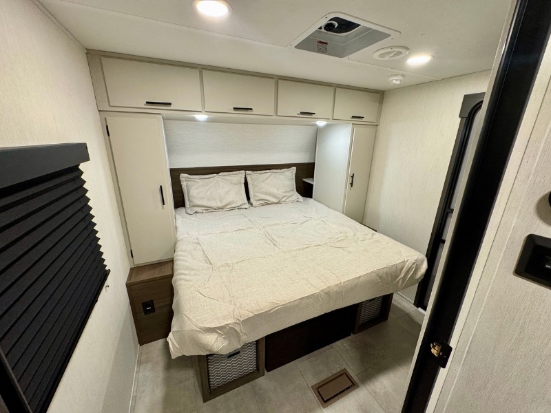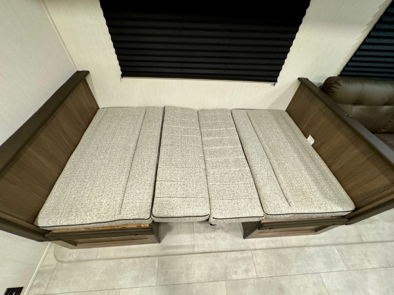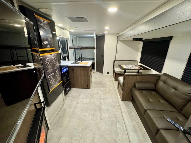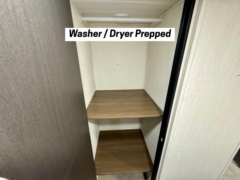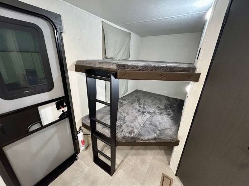 If you're looking for more comfort and a larger sleeping capacity in your next RV, this travel trailer is the one! There are double-size bunks in the rear corner, along with a ladder to easily hop into bed, and the full bath is in the other rear corner for easy nighttime use. You'll enjoy the front private bedroom with its queen bed and dual wardrobes for your things, and a separate closet with washer and dryer prep if you choose to add those appliances. And one of the dual entry doors is located here so you can easily slip out in the morning without waking everyone else up in the trailer! In the morning, you can make breakfast in the full kitchen, then dine at the booth dinette within the large slide out. There is also a theater here for more comfort. This travel trailer also includes plenty of storage space, including a walk-in pantry with shelves, an additional storage closet, and a pass-thru storage outside for fishing poles!
