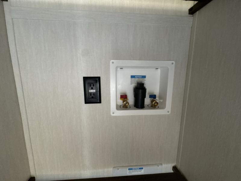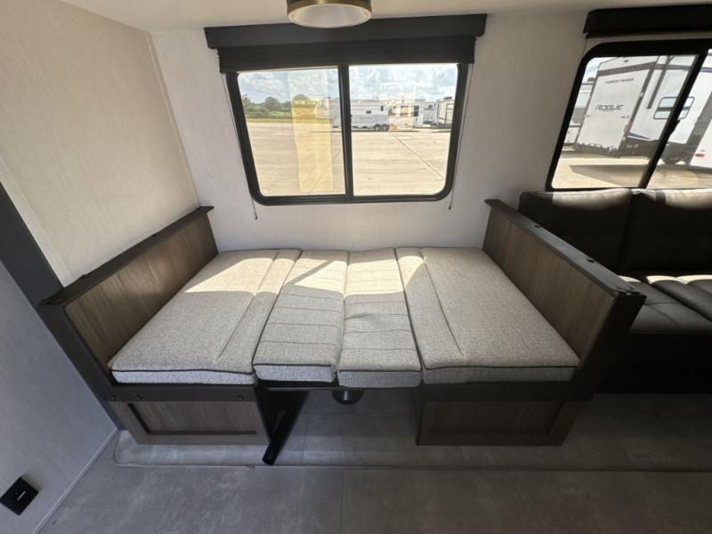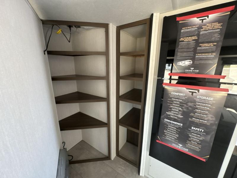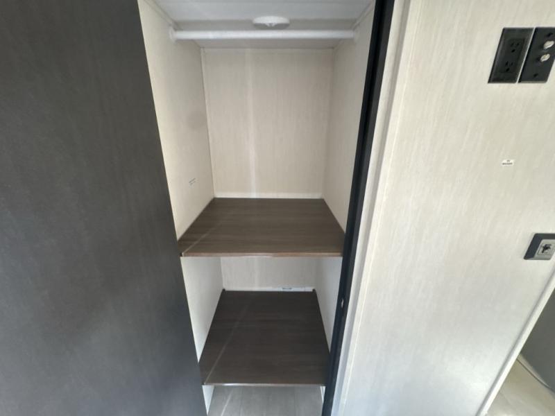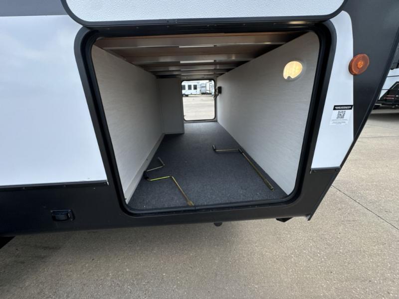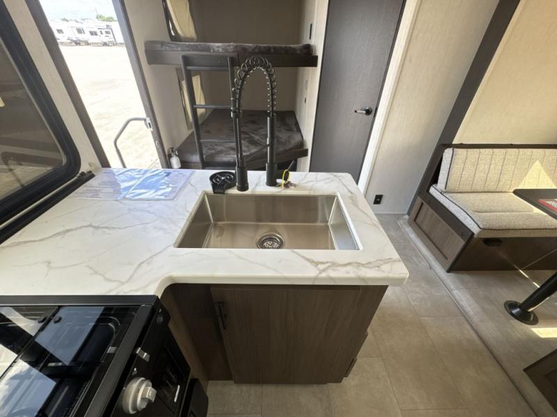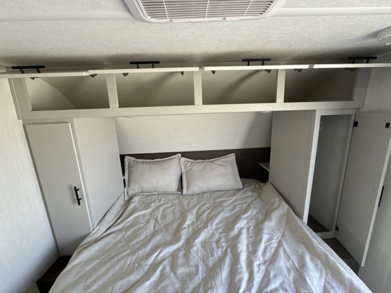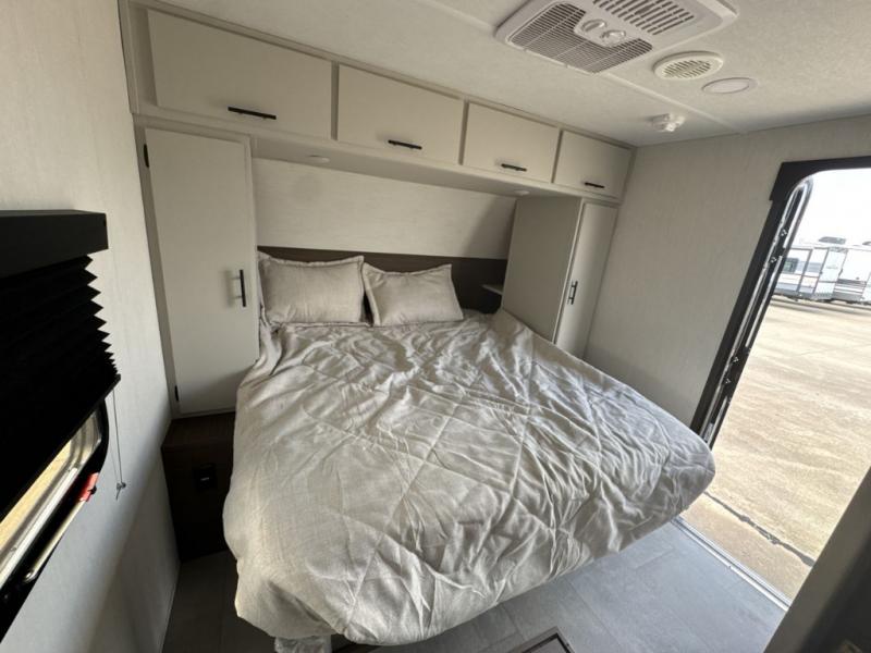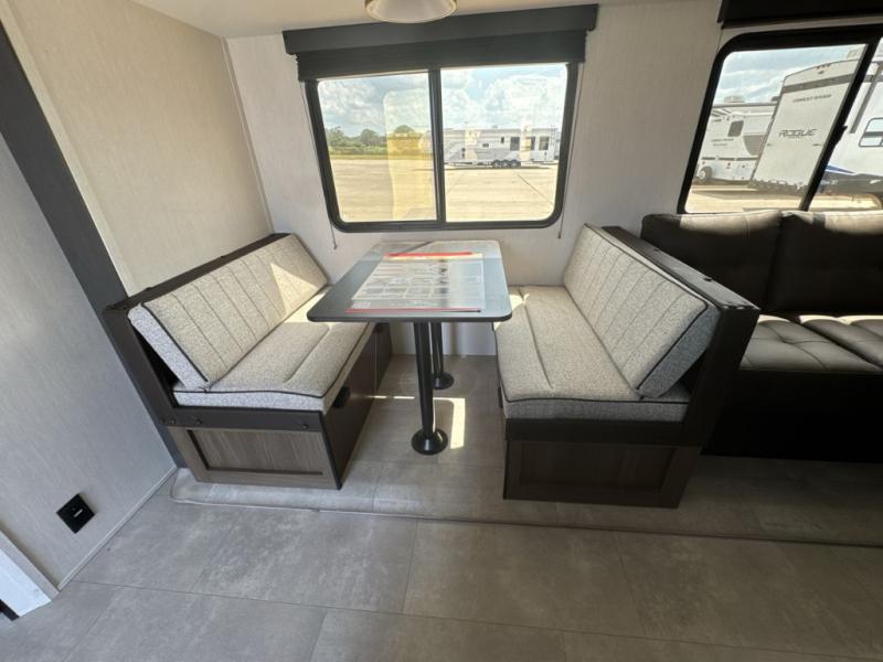 If you're looking for more comfort and a larger sleeping capacity in your next RV, this travel trailer is the one! There are double-size bunks in the rear corner, along with a ladder to easily hop into bed, and the full bath is in the other rear corner for easy nighttime use. You'll enjoy the front private bedroom with its queen bed and dual wardrobes for your things, and a separate closet with washer and dryer prep if you choose to add those appliances. And one of the dual entry doors is located here so you can easily slip out in the morning without waking everyone else up in the trailer! In the morning, you can make breakfast in the full kitchen, then dine at the booth dinette within the large slide out. There is also a jack knife sofa here for more comfort. This travel trailer also includes plenty of storage space, including a walk-in pantry with shelves, an additional storage closet, and a pass-thru storage outside for fishing poles!