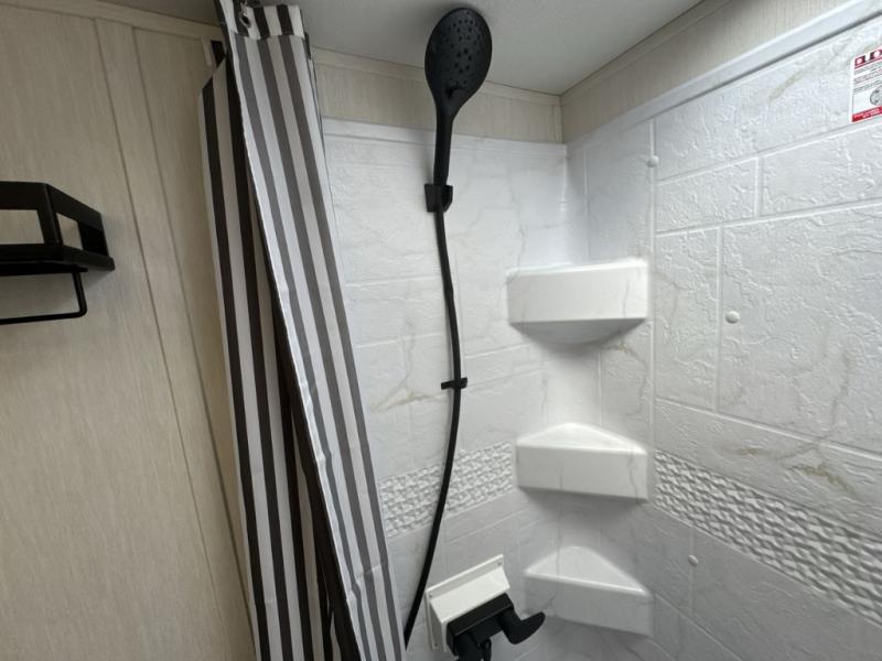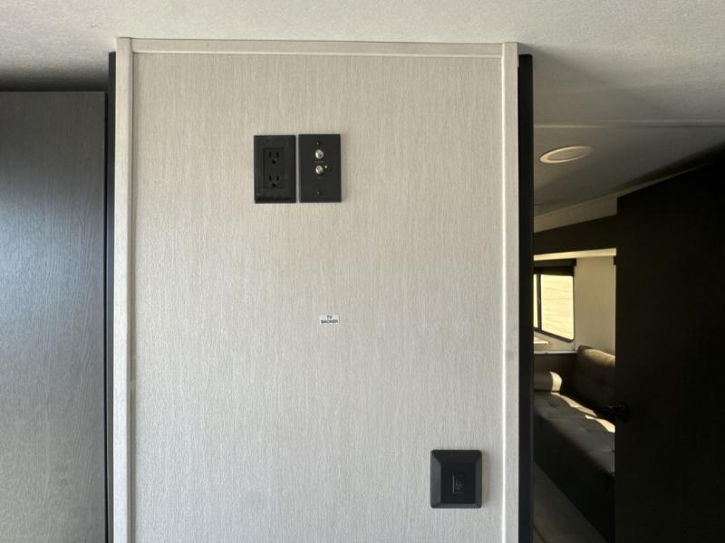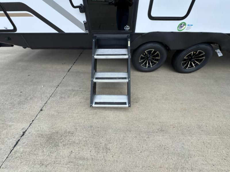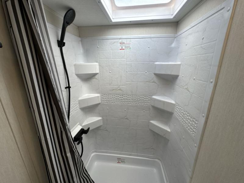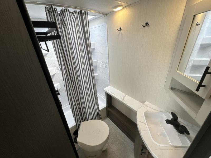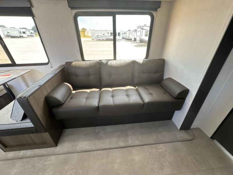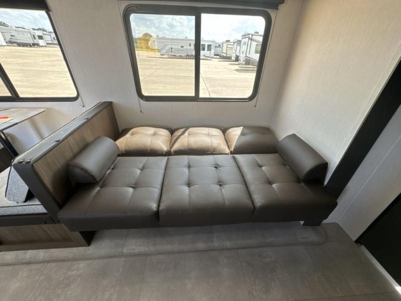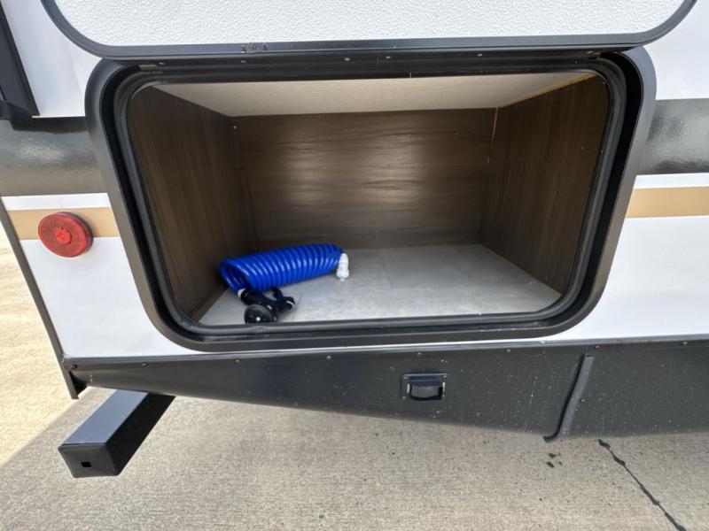 If you're looking for more comfort and a larger sleeping capacity in your next RV, this travel trailer is the one! There are double-size bunks in the rear corner, along with a ladder to easily hop into bed, and the full bath is in the other rear corner for easy nighttime use. You'll enjoy the front private bedroom with its queen bed and dual wardrobes for your things, and a separate closet with washer and dryer prep if you choose to add those appliances. And one of the dual entry doors is located here so you can easily slip out in the morning without waking everyone else up in the trailer! In the morning, you can make breakfast in the full kitchen, then dine at the booth dinette within the large slide out. There is also a jack knife sofa here for more comfort. This travel trailer also includes plenty of storage space, including a walk-in pantry with shelves, an additional storage closet, and a pass-thru storage outside for fishing poles!
