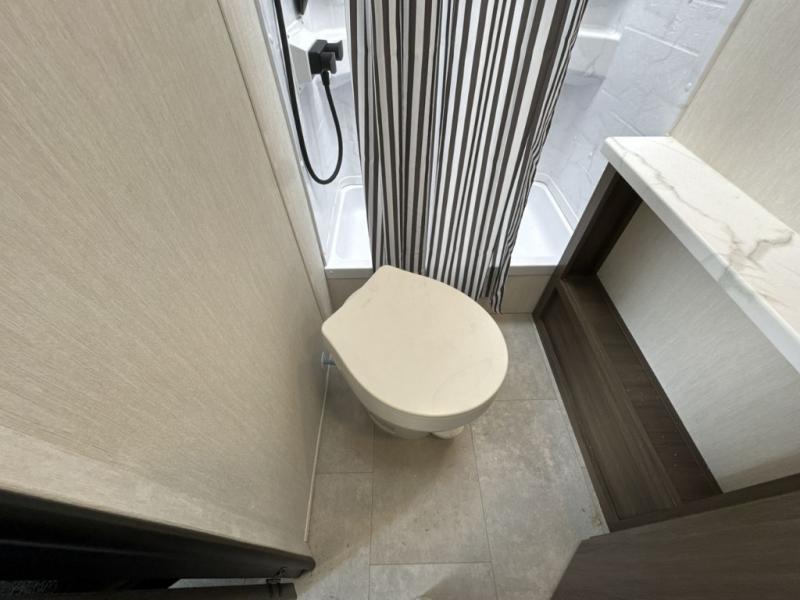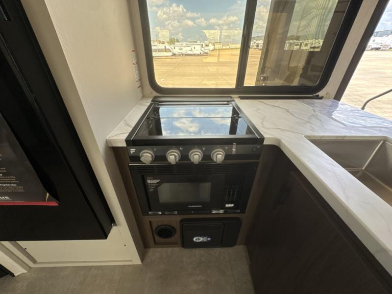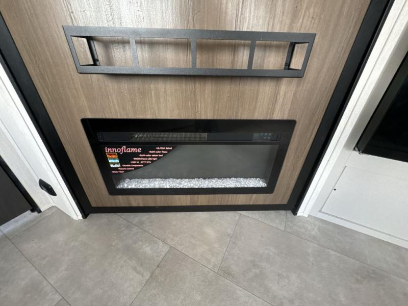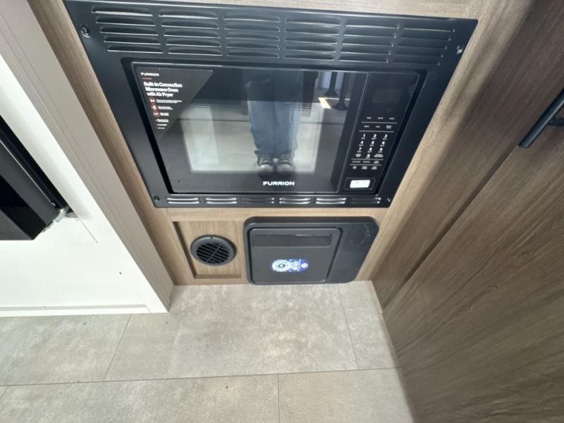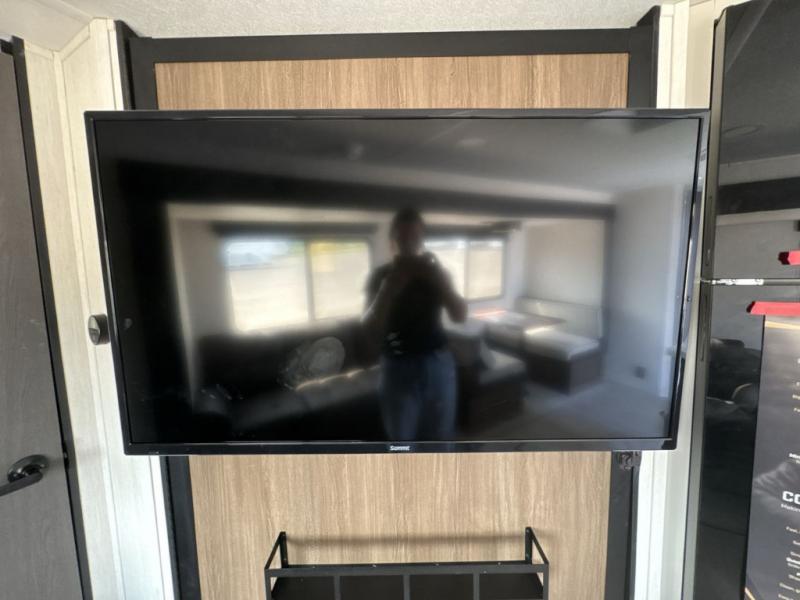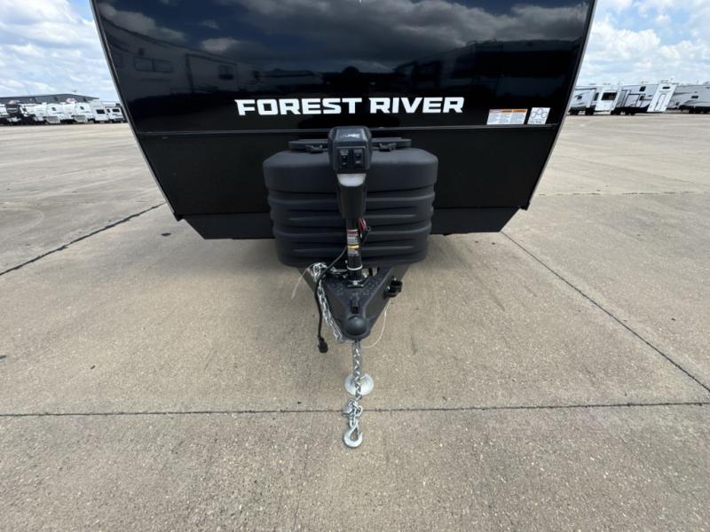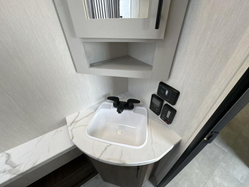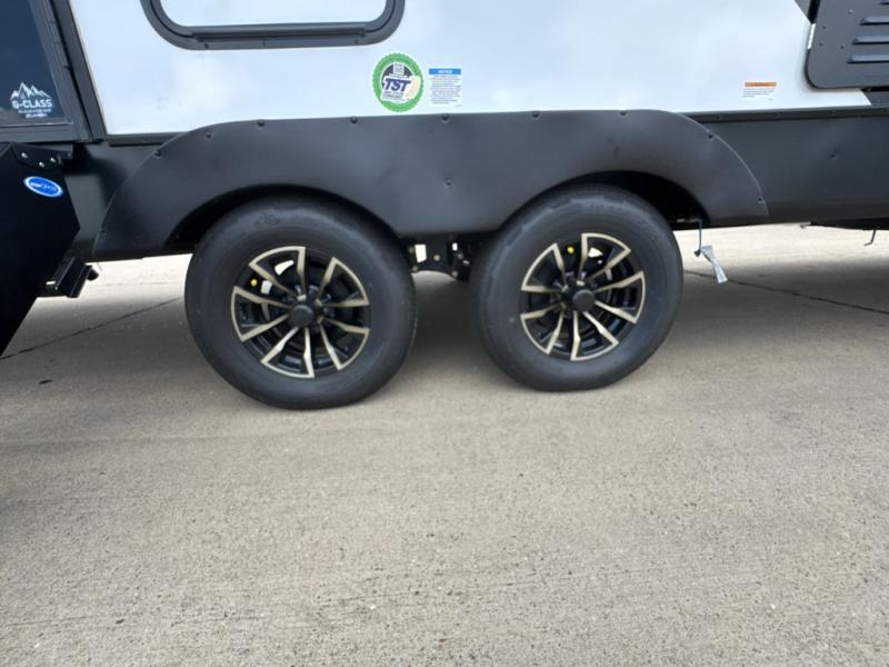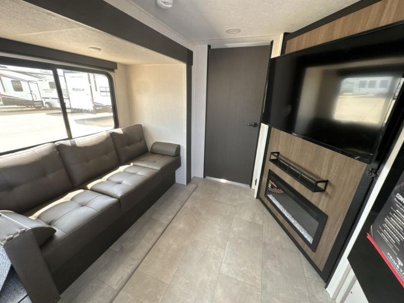 If you're looking for more comfort and a larger sleeping capacity in your next RV, this travel trailer is the one! There are double-size bunks in the rear corner, along with a ladder to easily hop into bed, and the full bath is in the other rear corner for easy nighttime use. You'll enjoy the front private bedroom with its queen bed and dual wardrobes for your things, and a separate closet with washer and dryer prep if you choose to add those appliances. And one of the dual entry doors is located here so you can easily slip out in the morning without waking everyone else up in the trailer! In the morning, you can make breakfast in the full kitchen, then dine at the booth dinette within the large slide out. There is also a jack knife sofa here for more comfort. This travel trailer also includes plenty of storage space, including a walk-in pantry with shelves, an additional storage closet, and a pass-thru storage outside for fishing poles!