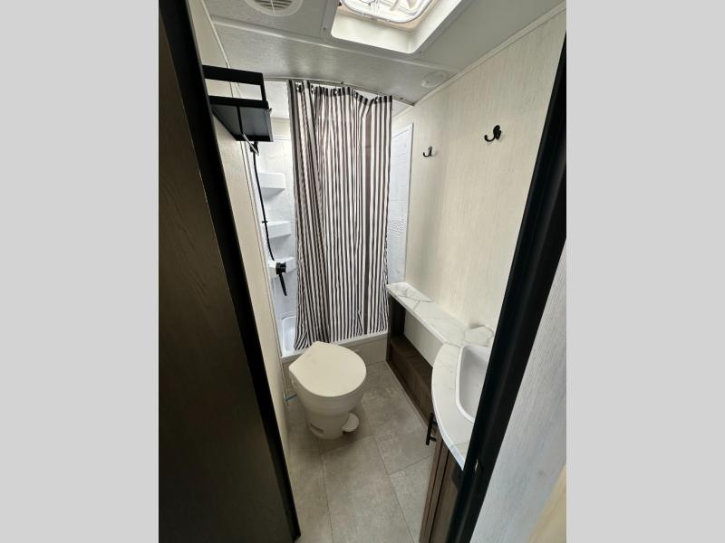 If you're looking for more comfort and a larger sleeping capacity in your next RV, this travel trailer is the one! There are double-size bunks in the rear corner, along with a ladder to easily hop into bed, and the full bath is in the other rear corner for easy nighttime use. You'll enjoy the front private bedroom with its queen bed and dual wardrobes for your things, and a separate closet with washer and dryer prep if you choose to add those appliances. And one of the dual entry doors is located here so you can easily slip out in the morning without waking everyone else up in the trailer! In the morning, you can make breakfast in the full kitchen, then dine at the booth dinette within the large slide out. There is also a jack knife sofa here for more comfort. This travel trailer also includes plenty of storage space, including a walk-in pantry with shelves, an additional storage closet, and a pass-thru storage outside for fishing poles!