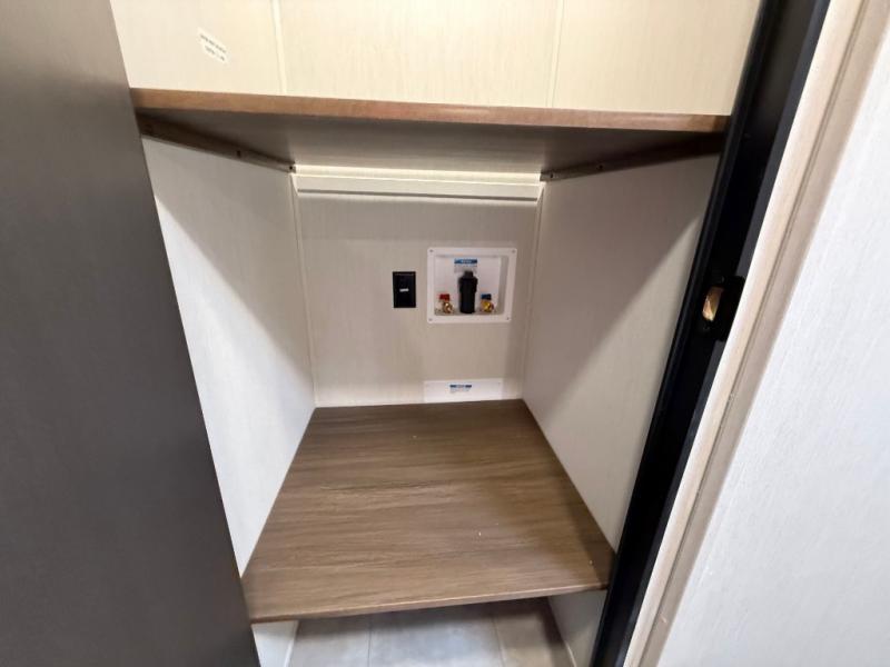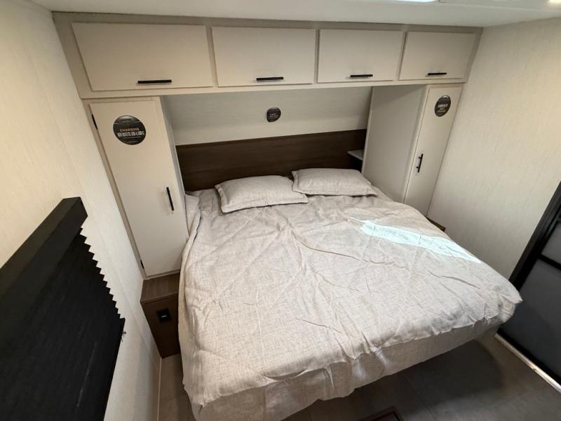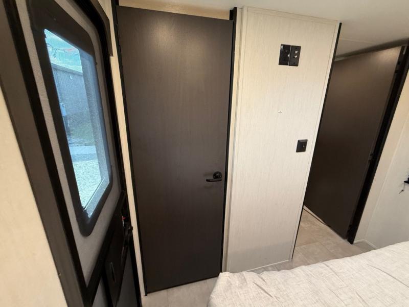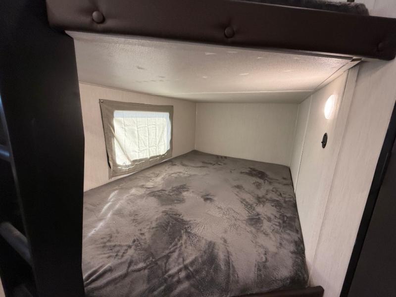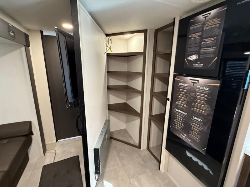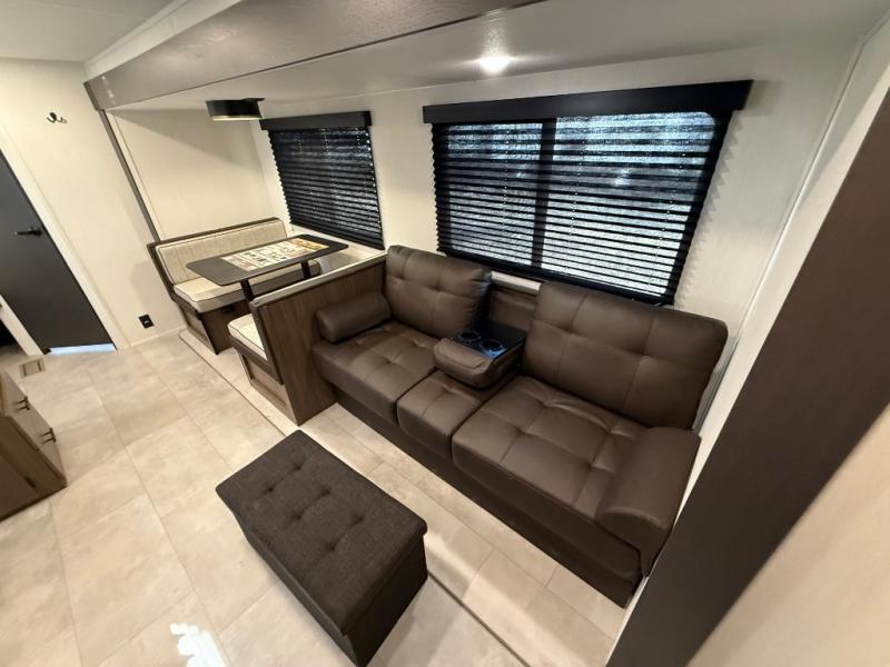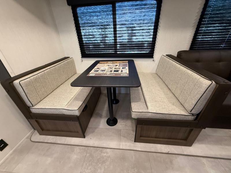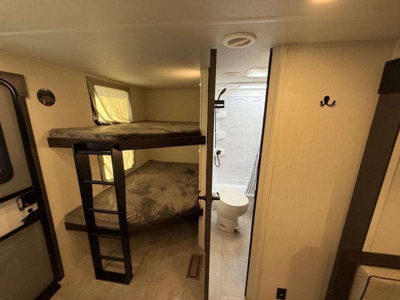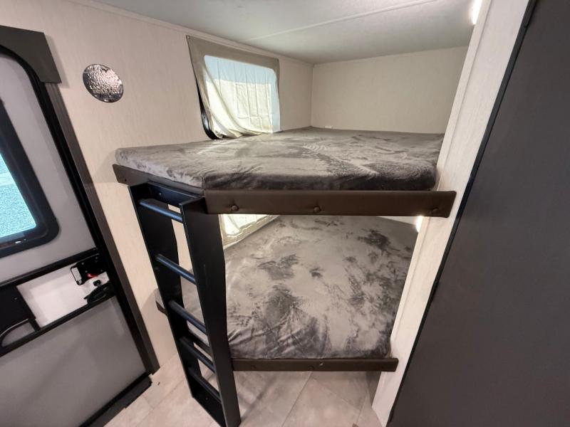 If you're looking for more comfort and a larger sleeping capacity in your next RV, this travel trailer is the one! There are double-size bunks in the rear corner, along with a ladder to easily hop into bed, and the full bath is in the other rear corner for easy nighttime use. You'll enjoy the front private bedroom with its queen bed and dual wardrobes for your things, and a separate closet with washer and dryer prep if you choose to add those appliances. And one of the dual entry doors is located here so you can easily slip out in the morning without waking everyone else up in the trailer! In the morning, you can make breakfast in the full kitchen, then dine at the booth dinette within the large slide out. There is also a jack knife sofa here for more comfort. This travel trailer also includes plenty of storage space, including a walk-in pantry with shelves, an additional storage closet, and a pass-thru storage outside for fishing poles!