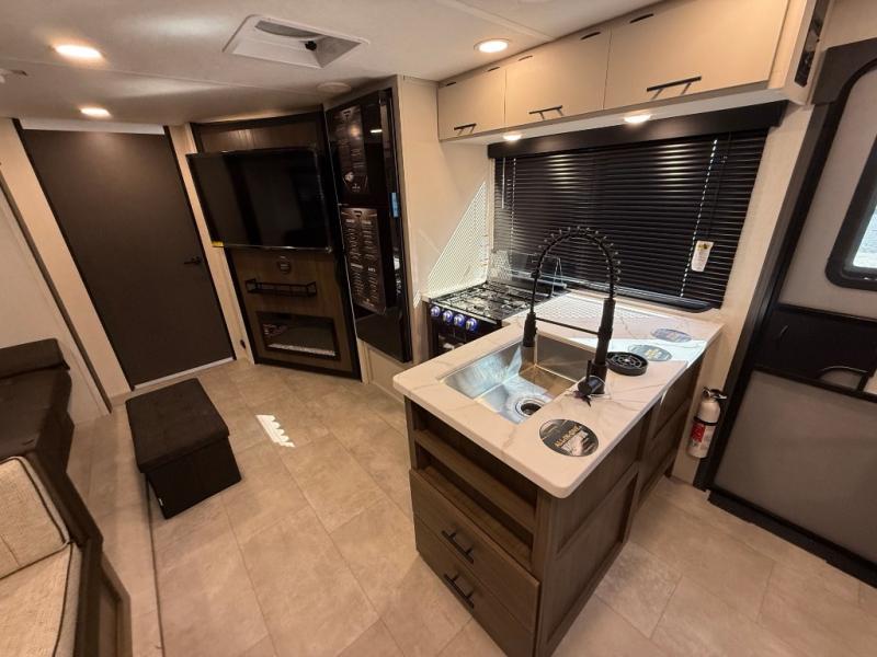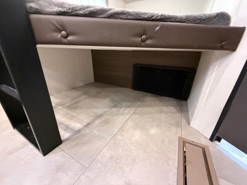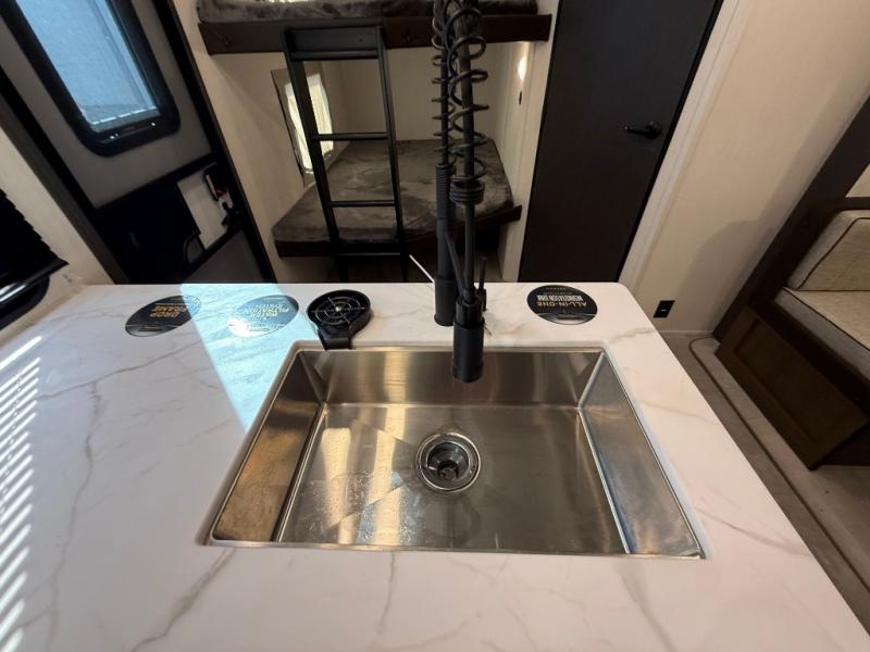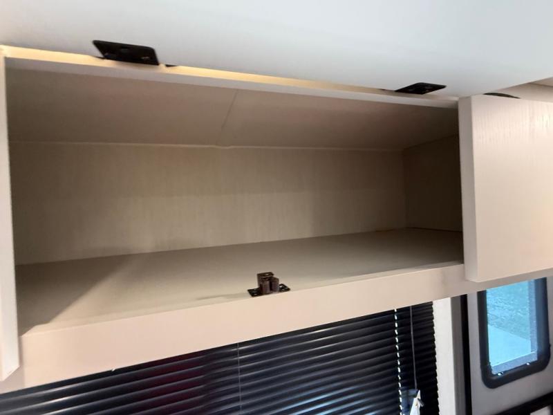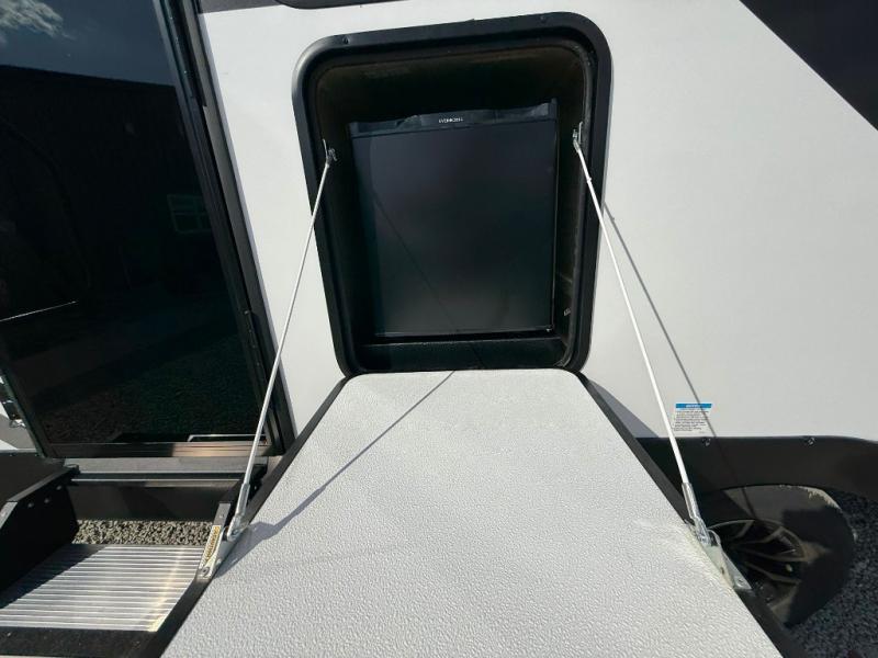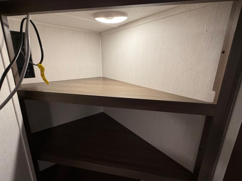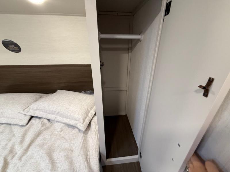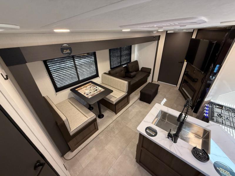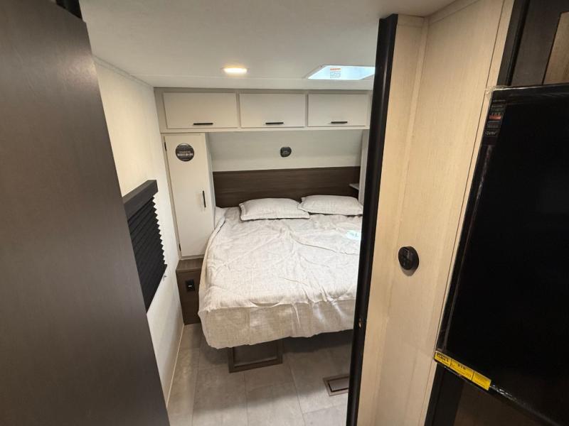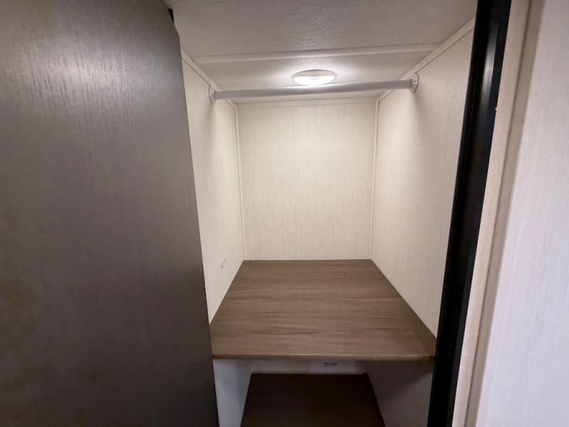 If you're looking for more comfort and a larger sleeping capacity in your next RV, this travel trailer is the one! There are double-size bunks in the rear corner, along with a ladder to easily hop into bed, and the full bath is in the other rear corner for easy nighttime use. You'll enjoy the front private bedroom with its queen bed and dual wardrobes for your things, and a separate closet with washer and dryer prep if you choose to add those appliances. And one of the dual entry doors is located here so you can easily slip out in the morning without waking everyone else up in the trailer! In the morning, you can make breakfast in the full kitchen, then dine at the booth dinette within the large slide out. There is also a jack knife sofa here for more comfort. This travel trailer also includes plenty of storage space, including a walk-in pantry with shelves, an additional storage closet, and a pass-thru storage outside for fishing poles!