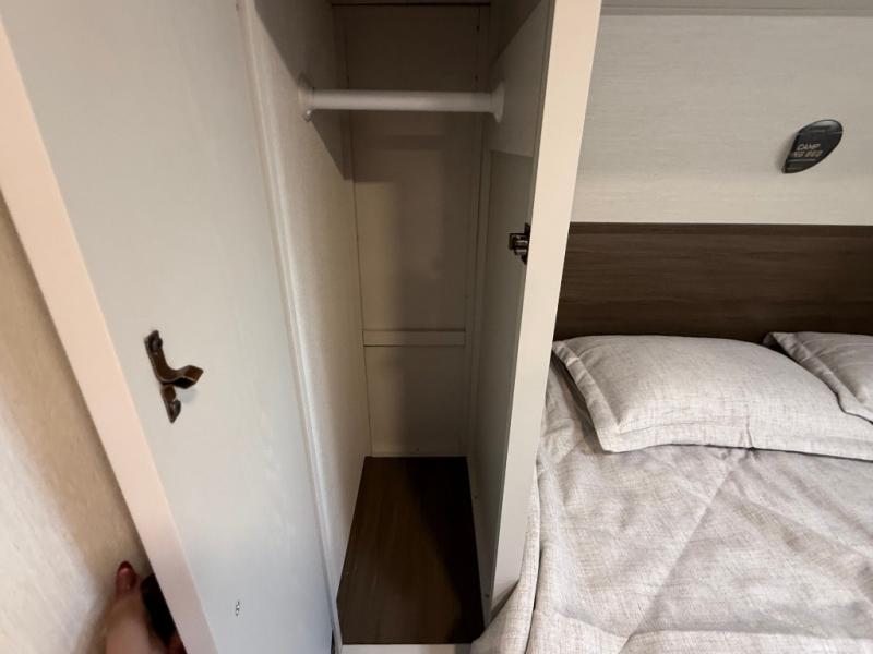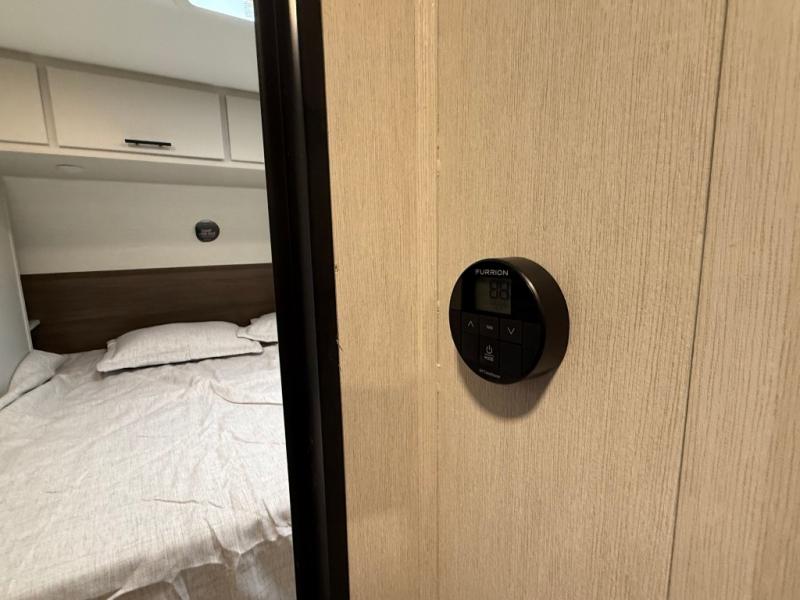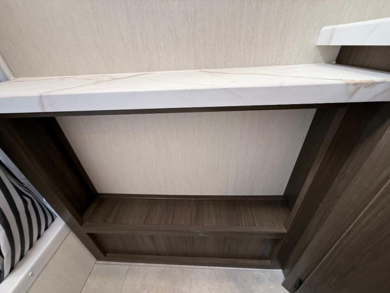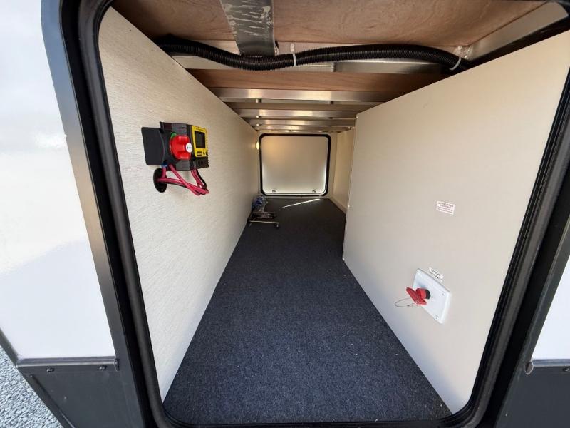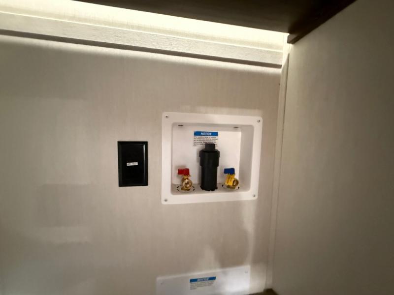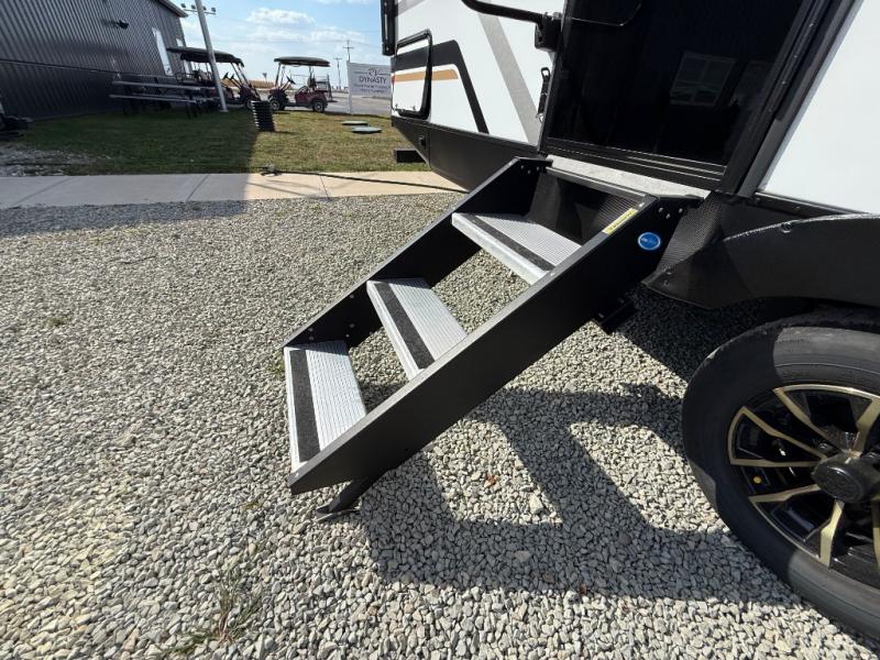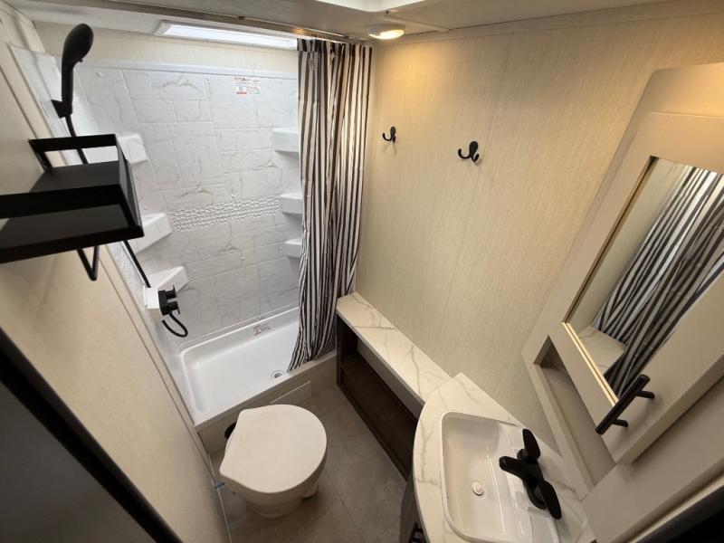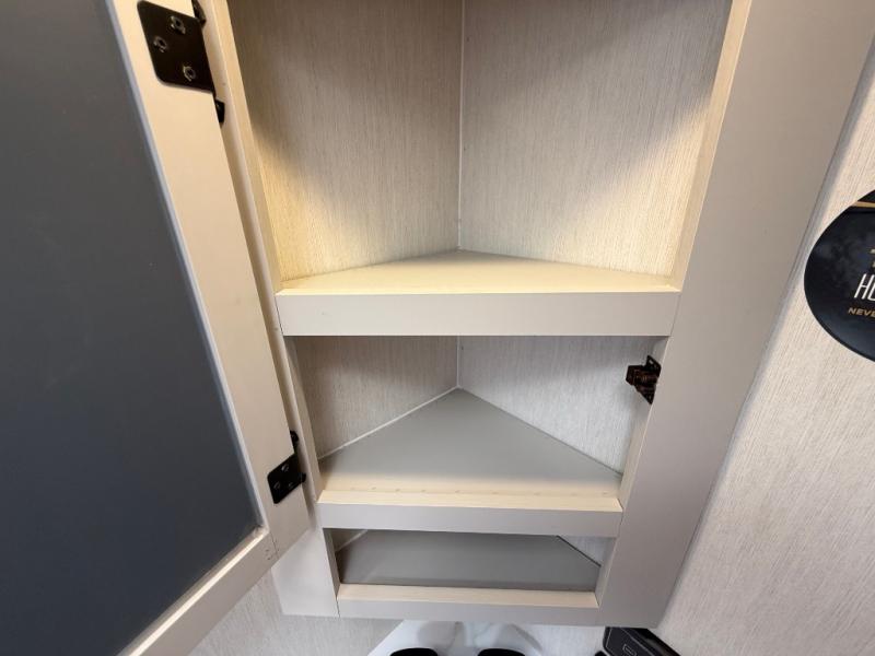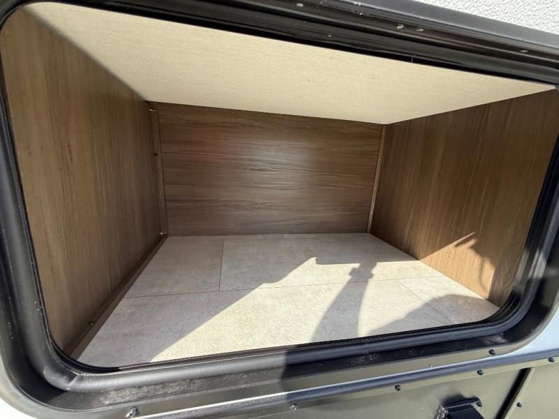 If you're looking for more comfort and a larger sleeping capacity in your next RV, this travel trailer is the one! There are double-size bunks in the rear corner, along with a ladder to easily hop into bed, and the full bath is in the other rear corner for easy nighttime use. You'll enjoy the front private bedroom with its queen bed and dual wardrobes for your things, and a separate closet with washer and dryer prep if you choose to add those appliances. And one of the dual entry doors is located here so you can easily slip out in the morning without waking everyone else up in the trailer! In the morning, you can make breakfast in the full kitchen, then dine at the booth dinette within the large slide out. There is also a jack knife sofa here for more comfort. This travel trailer also includes plenty of storage space, including a walk-in pantry with shelves, an additional storage closet, and a pass-thru storage outside for fishing poles!