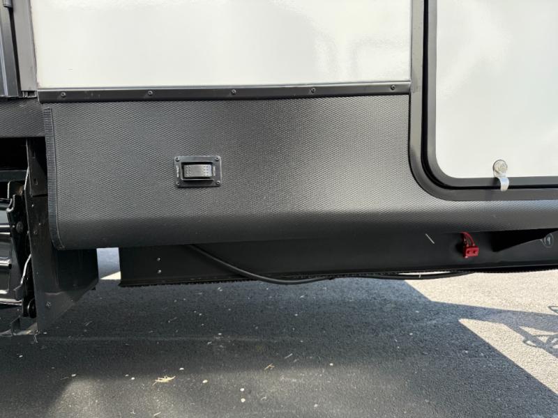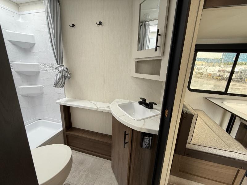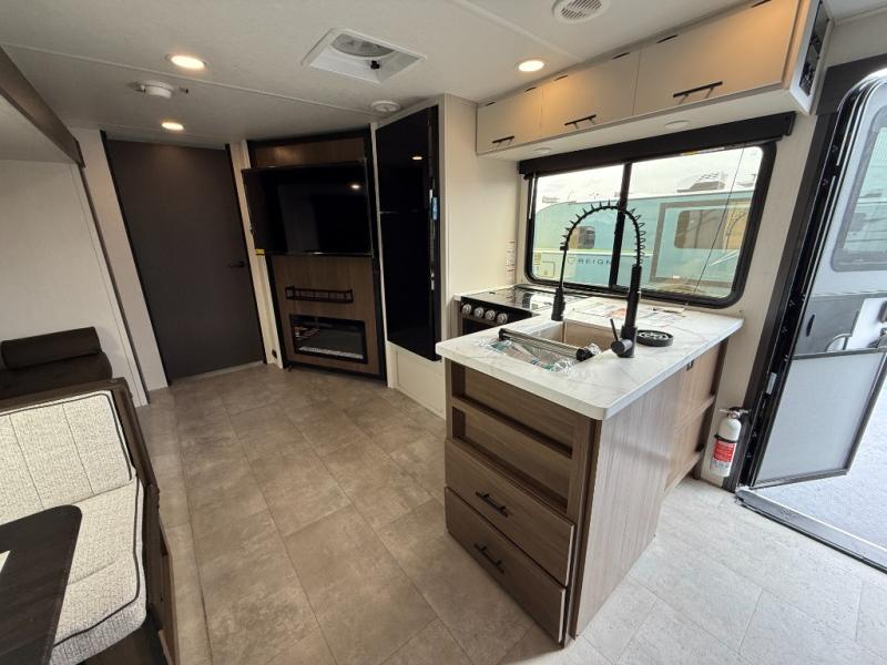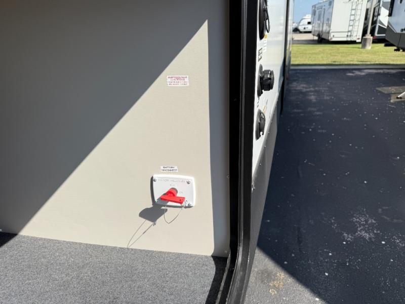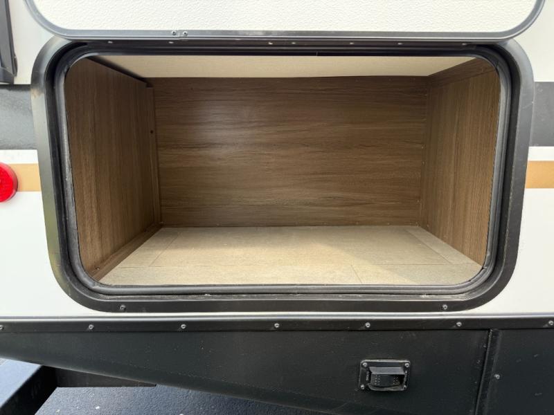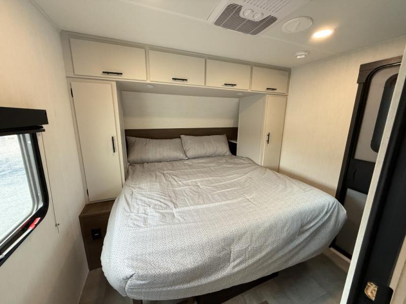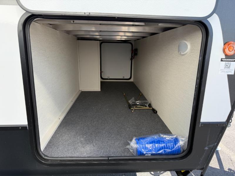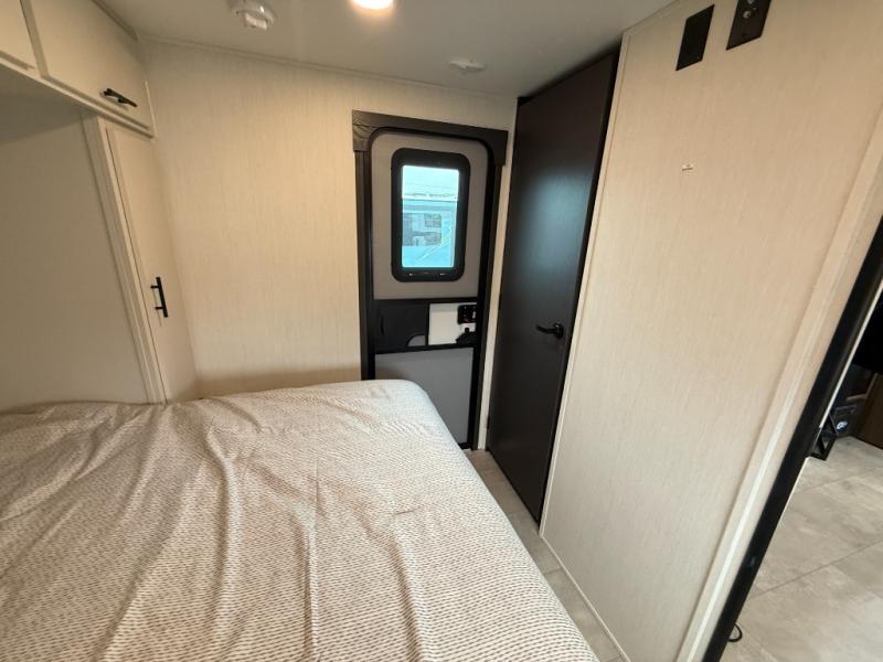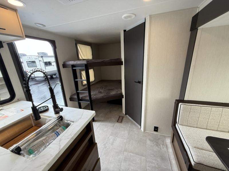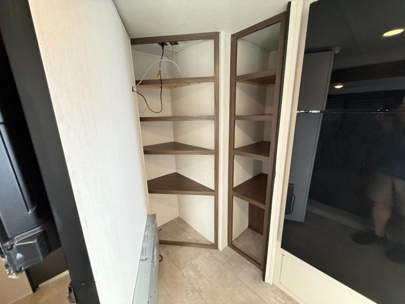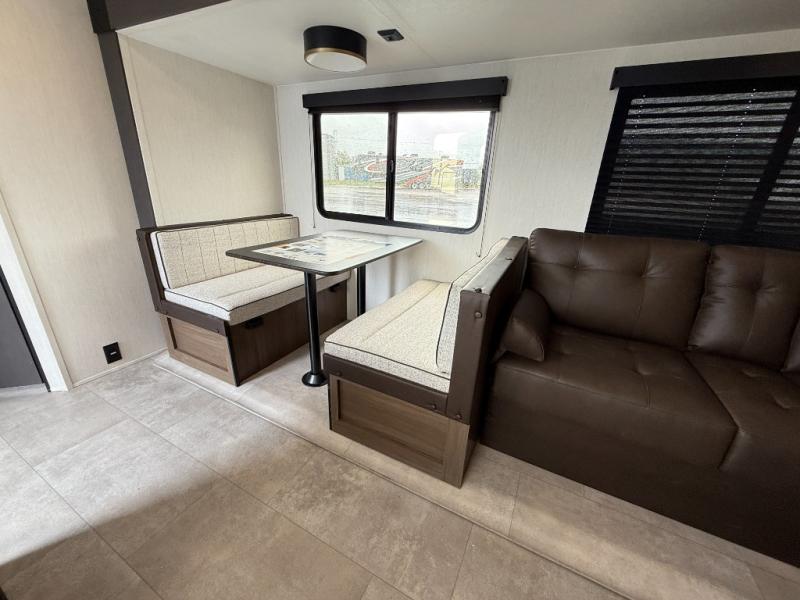 If you're looking for more comfort and a larger sleeping capacity in your next RV, this travel trailer is the one! There are double-size bunks in the rear corner, along with a ladder to easily hop into bed, and the full bath is in the other rear corner for easy nighttime use. You'll enjoy the front private bedroom with its queen bed and dual wardrobes for your things, and a separate closet with washer and dryer prep if you choose to add those appliances. And one of the dual entry doors is located here so you can easily slip out in the morning without waking everyone else up in the trailer! In the morning, you can make breakfast in the full kitchen, then dine at the booth dinette within the large slide out. There is also a jack knife sofa here for more comfort. This travel trailer also includes plenty of storage space, including a walk-in pantry with shelves, an additional storage closet, and a pass-thru storage outside for fishing poles!
