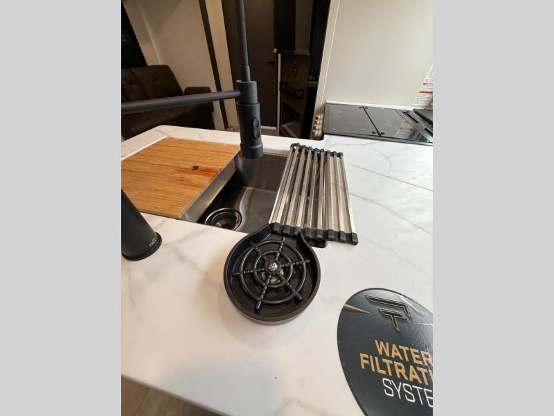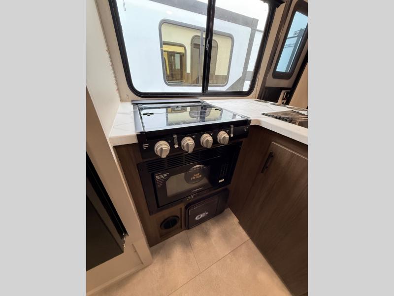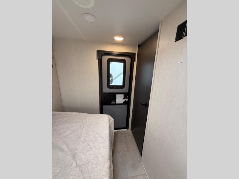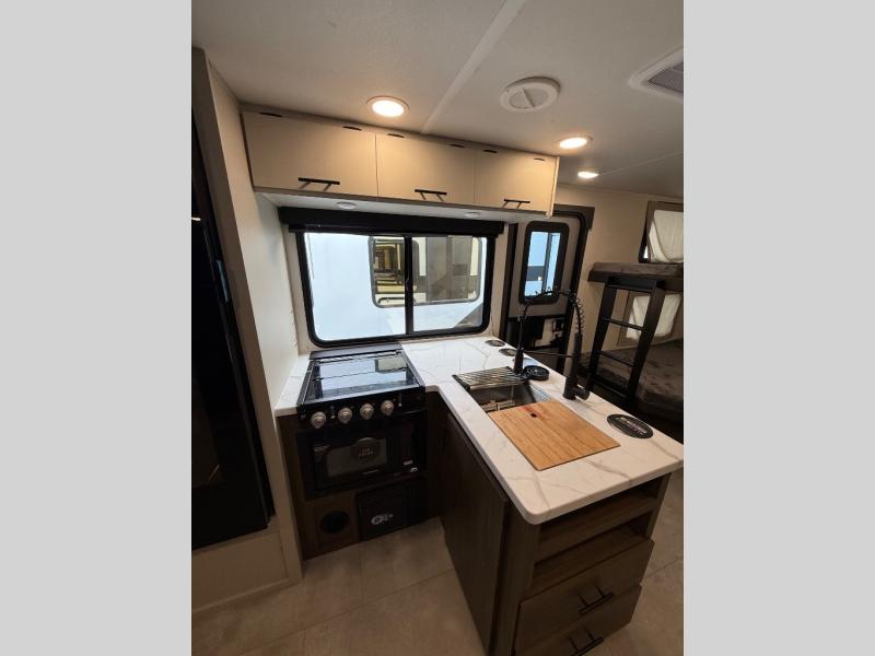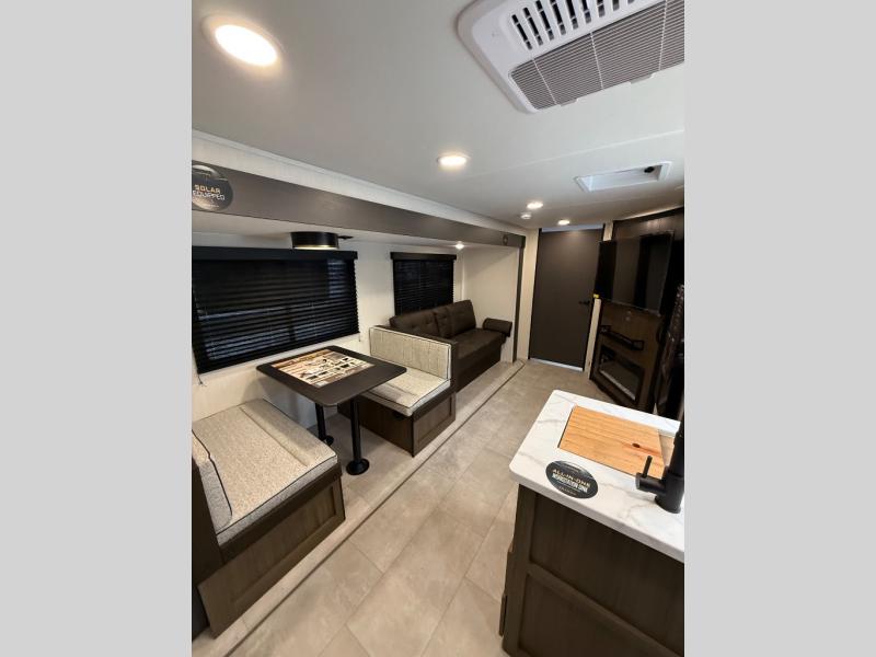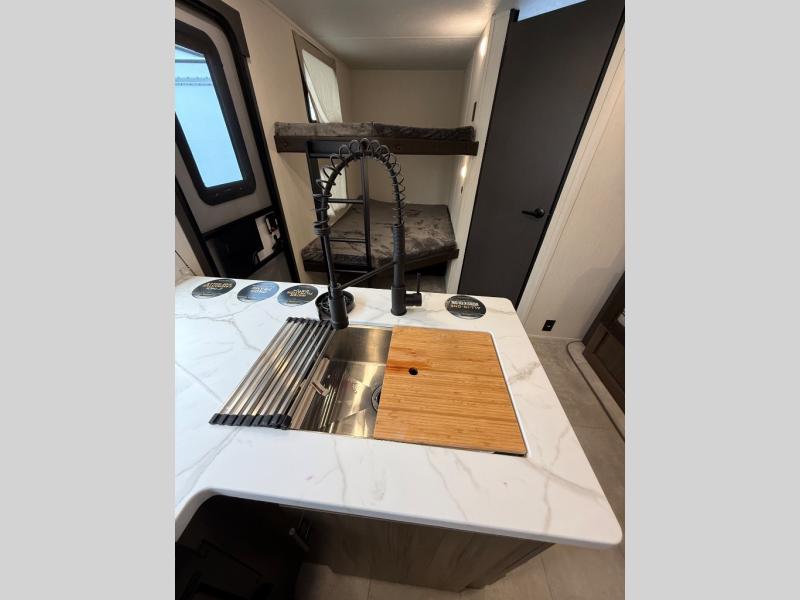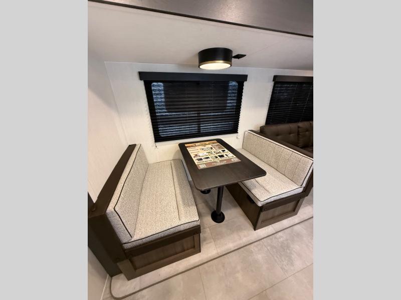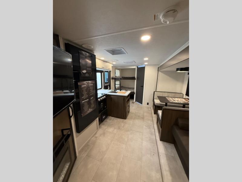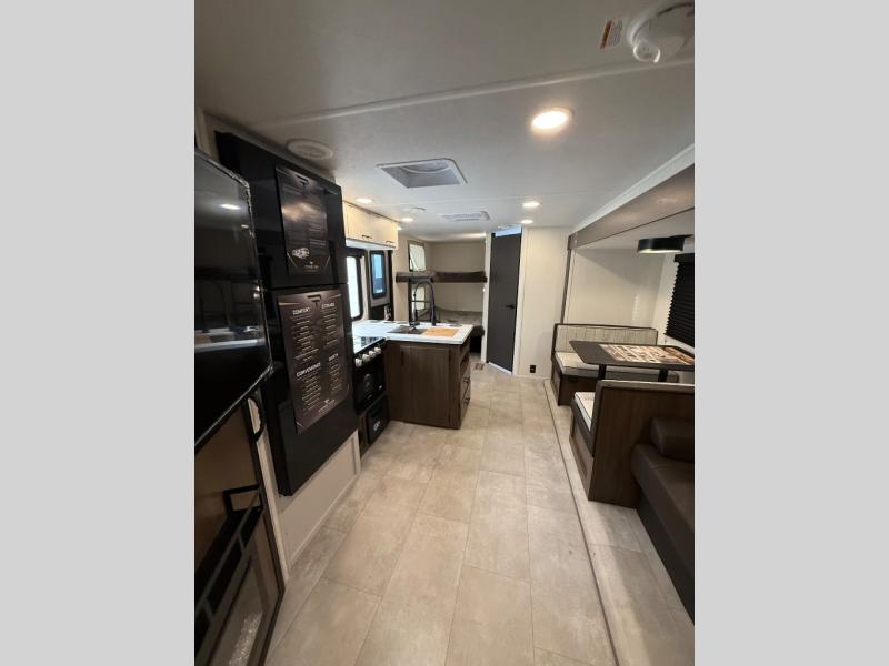 If you're looking for more comfort and a larger sleeping capacity in your next RV, this travel trailer is the one! There are double-size bunks in the rear corner, along with a ladder to easily hop into bed, and the full bath is in the other rear corner for easy nighttime use. You'll enjoy the front private bedroom with its queen bed and dual wardrobes for your things, and a separate closet with washer and dryer prep if you choose to add those appliances. And one of the dual entry doors is located here so you can easily slip out in the morning without waking everyone else up in the trailer! In the morning, you can make breakfast in the full kitchen, then dine at the booth dinette within the large slide out. There is also a jack knife sofa here for more comfort. This travel trailer also includes plenty of storage space, including a walk-in pantry with shelves, an additional storage closet, and a pass-thru storage outside for fishing poles!