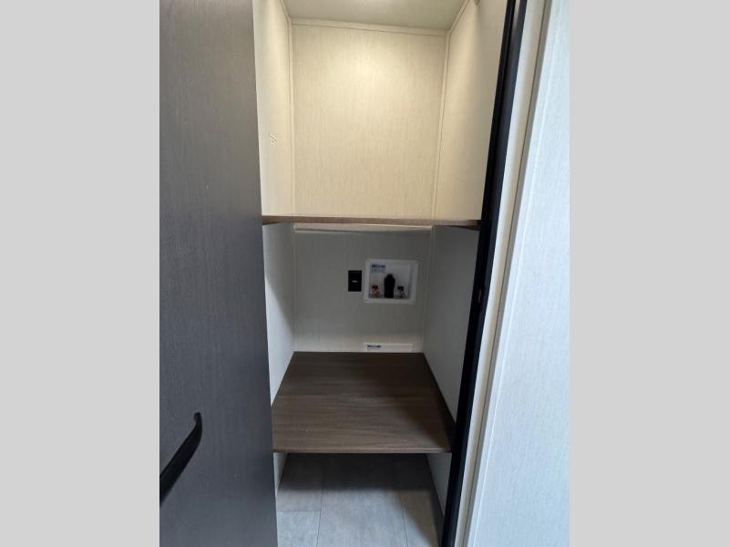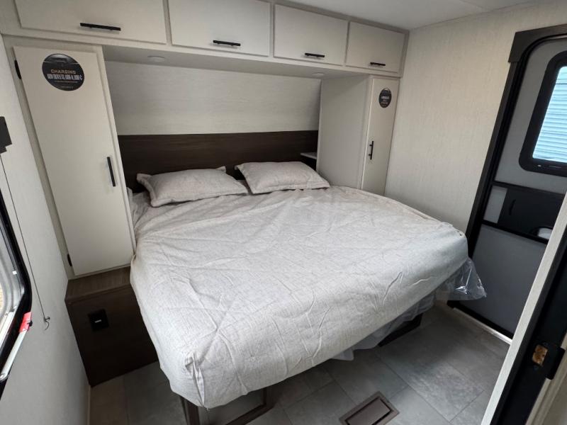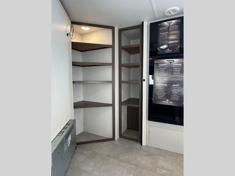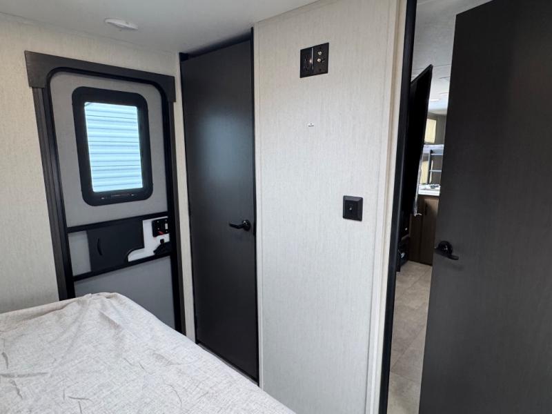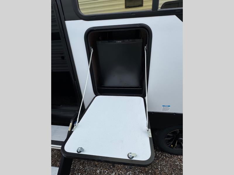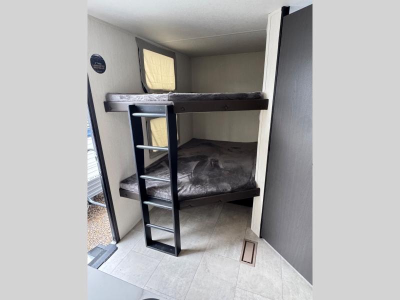If you're looking for more comfort and a larger sleeping capacity in your next RV, this travel trailer is the one! There are double-size bunks in the rear corner, along with a ladder to easily hop into bed, and the full bath is in the other rear corner for easy nighttime use. You'll enjoy the front private bedroom with its queen bed and dual wardrobes for your things, and a separate closet with washer and dryer prep if you choose to add those appliances. And one of the dual entry doors is located here so you can easily slip out in the morning without waking everyone else up in the trailer! In the morning, you can make breakfast in the full kitchen, then dine at the booth dinette within the large slide out. There is also a jack knife sofa here for more comfort. This travel trailer also includes plenty of storage space, including a walk-in pantry with shelves, an additional storage closet, and a pass-thru storage outside for fishing poles!