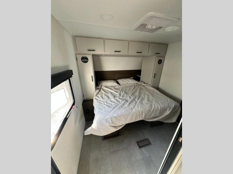 If you're looking for more comfort and a larger sleeping capacity in your next RV, this travel trailer is the one! There are double-size bunks in the rear corner, along with a ladder to easily hop into bed, and the full bath is in the other rear corner for easy nighttime use. You'll enjoy the front private bedroom with its queen bed and dual wardrobes for your things, and a separate closet with washer and dryer prep if you choose to add those appliances. And one of the dual entry doors is located here so you can easily slip out in the morning without waking everyone else up in the trailer! In the morning, you can make breakfast in the full kitchen, then dine at the booth dinette within the large slide out. There is also a jack knife sofa here for more comfort. This travel trailer also includes plenty of storage space, including a walk-in pantry with shelves, an additional storage closet, and a pass-thru storage outside for fishing poles!