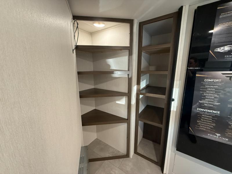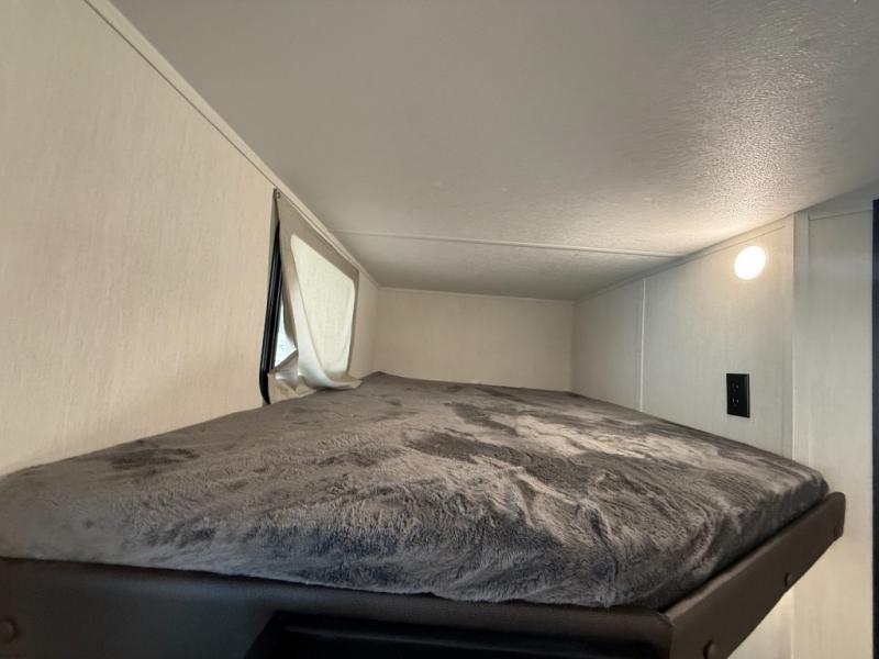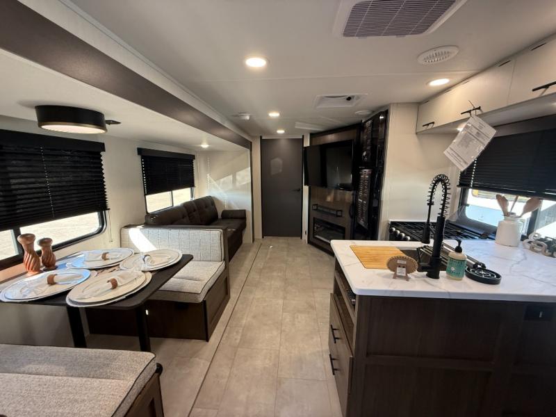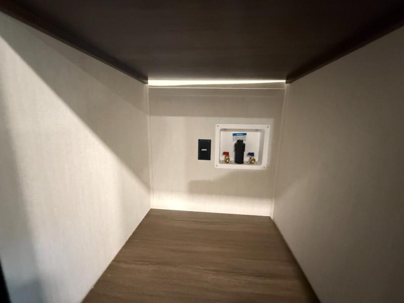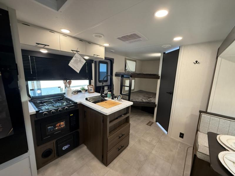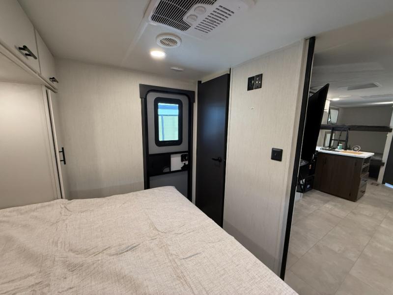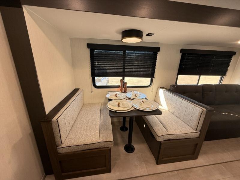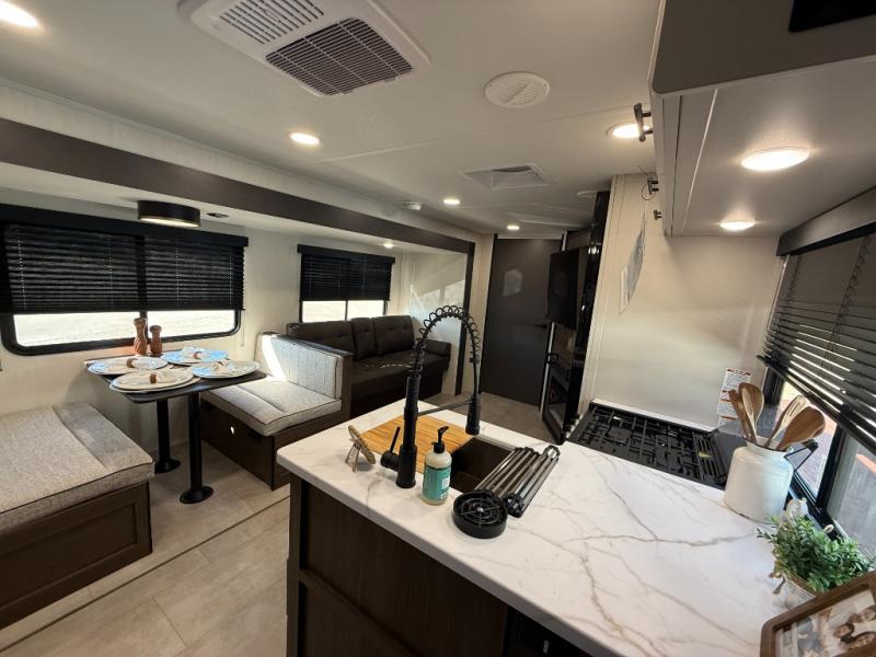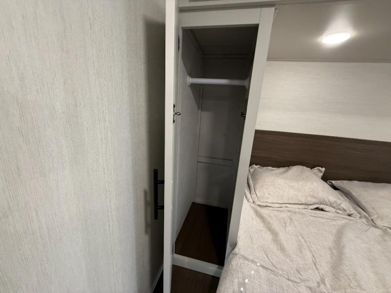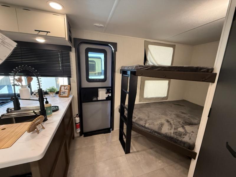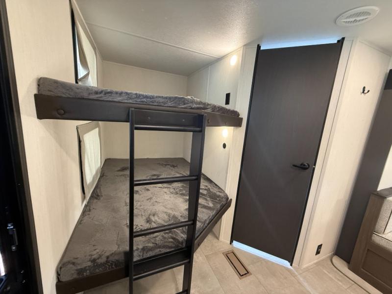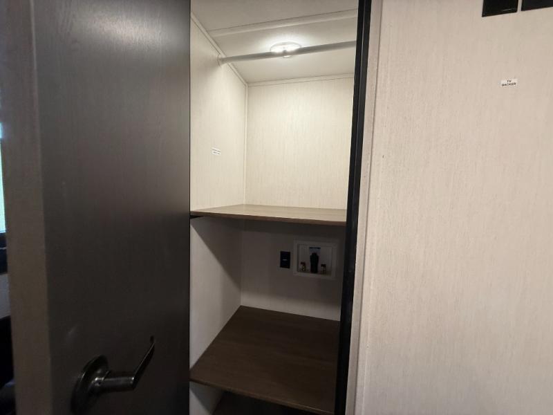 If you're looking for more comfort and a larger sleeping capacity in your next RV, this travel trailer is the one! There are double-size bunks in the rear corner, along with a ladder to easily hop into bed, and the full bath is in the other rear corner for easy nighttime use. You'll enjoy the front private bedroom with its camp king bed and dual wardrobes for your things, and a separate closet with washer and dryer prep if you choose to add those appliances. And one of the dual entry doors is located here so you can easily slip out in the morning without waking everyone else up in the trailer! In the morning, you can make breakfast in the full kitchen, then dine at the booth dinette within the large slide out. There is also a jack knife sofa here for more comfort. This travel trailer also includes plenty of storage space, including a walk-in pantry with shelves, an additional storage closet, and a pass-thru storage outside for fishing poles!