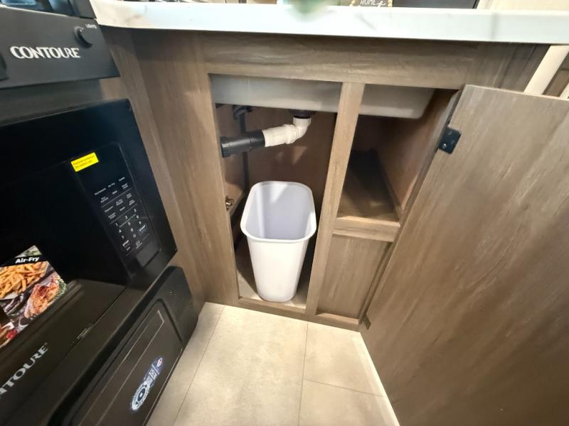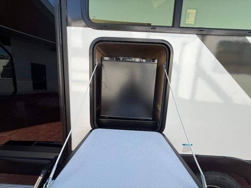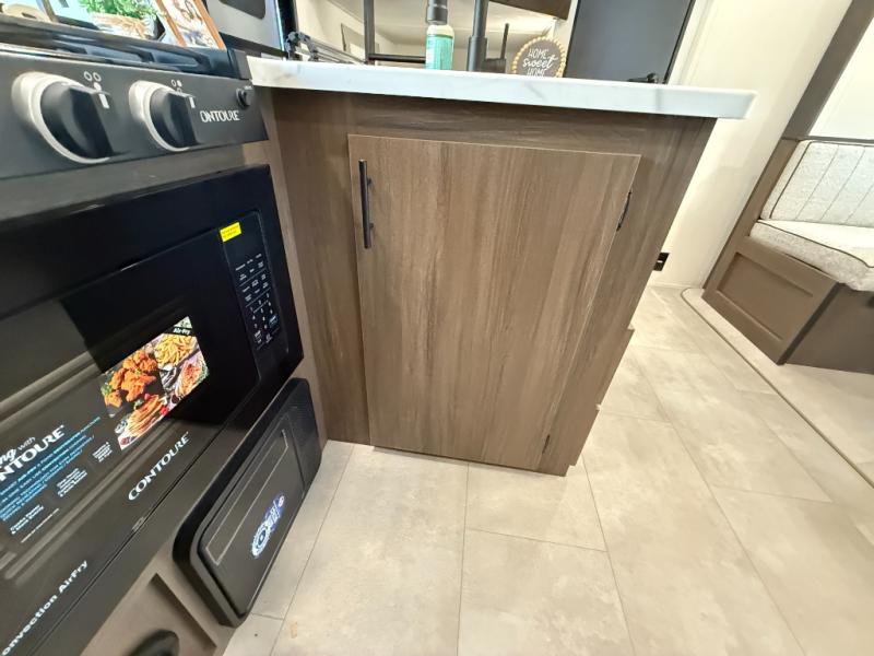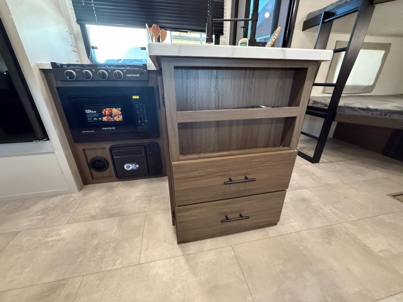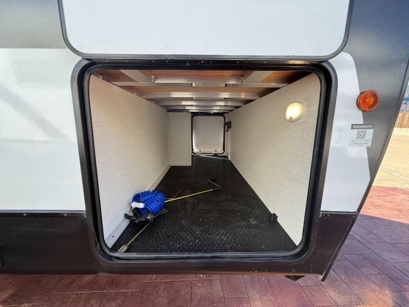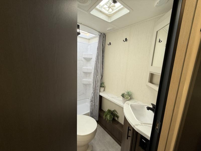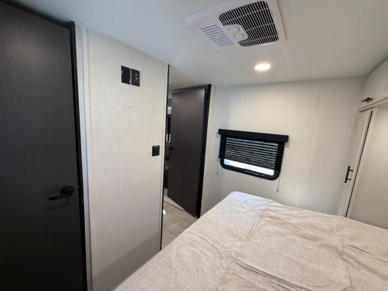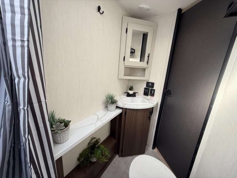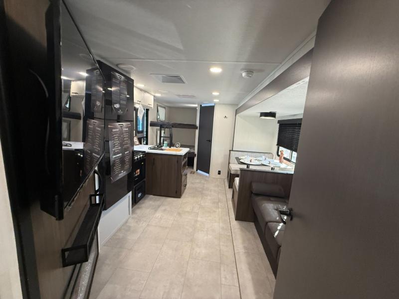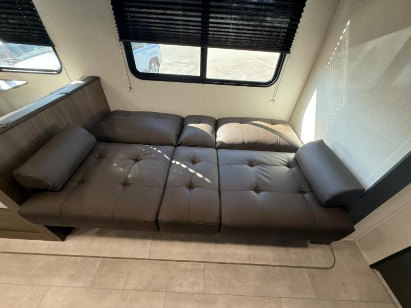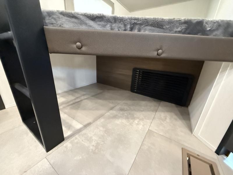 If you're looking for more comfort and a larger sleeping capacity in your next RV, this travel trailer is the one! There are double-size bunks in the rear corner, along with a ladder to easily hop into bed, and the full bath is in the other rear corner for easy nighttime use. You'll enjoy the front private bedroom with its camp king bed and dual wardrobes for your things, and a separate closet with washer and dryer prep if you choose to add those appliances. And one of the dual entry doors is located here so you can easily slip out in the morning without waking everyone else up in the trailer! In the morning, you can make breakfast in the full kitchen, then dine at the booth dinette within the large slide out. There is also a jack knife sofa here for more comfort. This travel trailer also includes plenty of storage space, including a walk-in pantry with shelves, an additional storage closet, and a pass-thru storage outside for fishing poles!