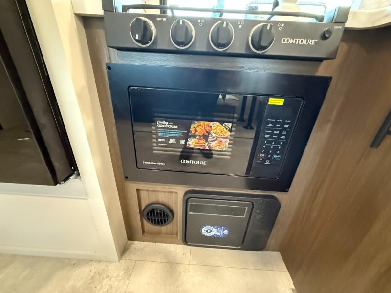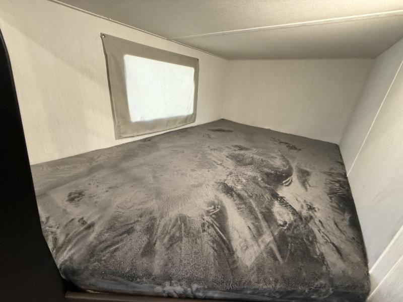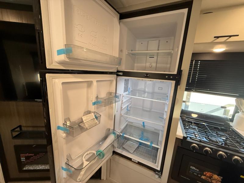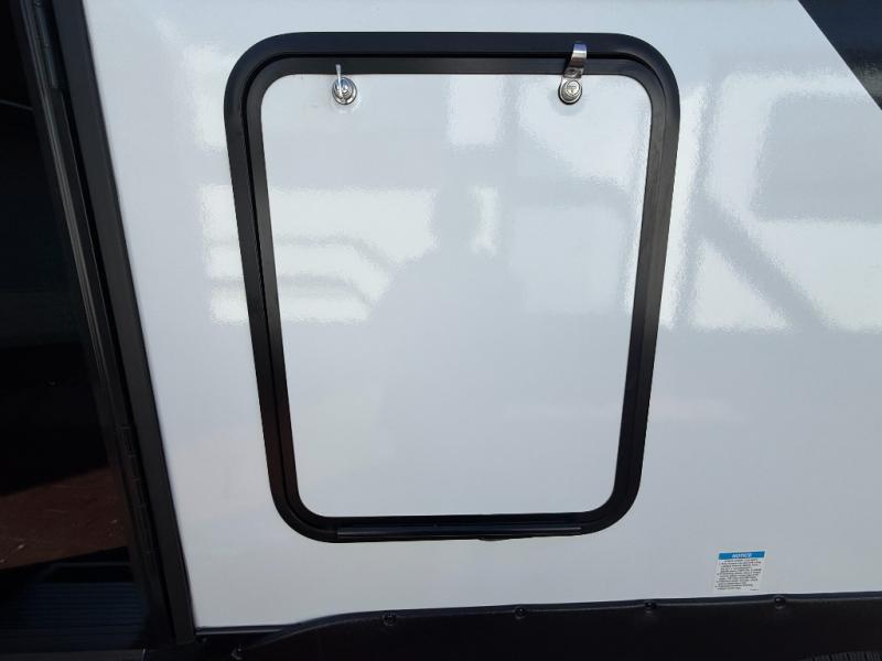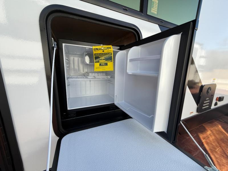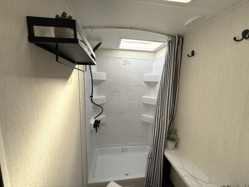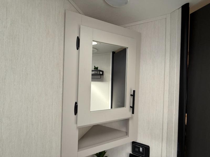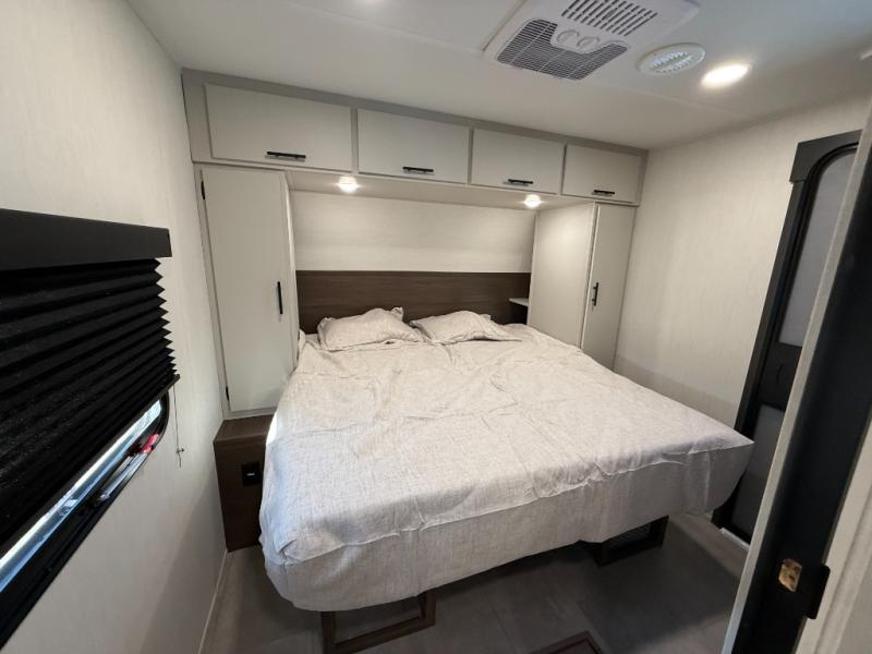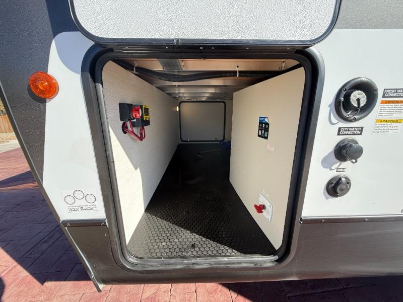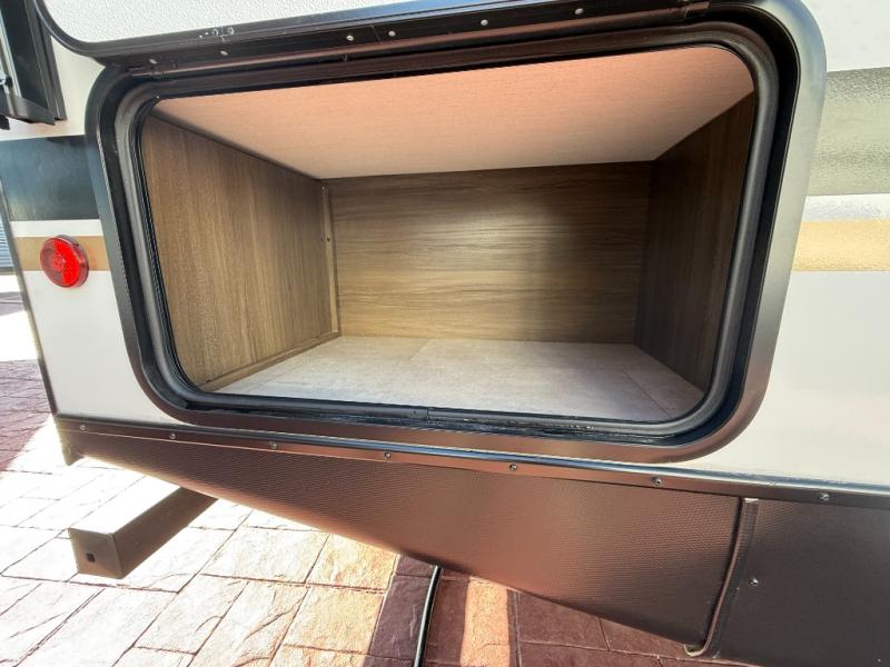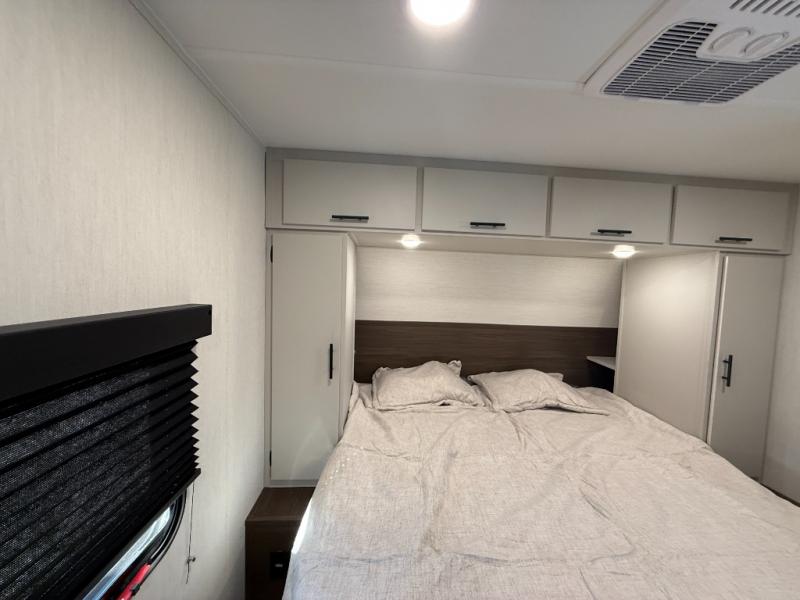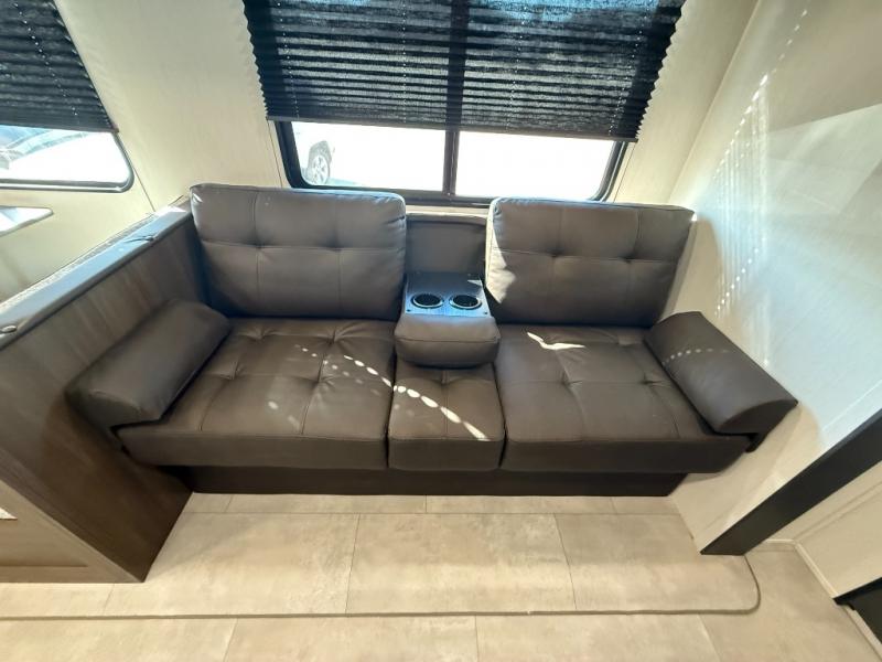 If you're looking for more comfort and a larger sleeping capacity in your next RV, this travel trailer is the one! There are double-size bunks in the rear corner, along with a ladder to easily hop into bed, and the full bath is in the other rear corner for easy nighttime use. You'll enjoy the front private bedroom with its camp king bed and dual wardrobes for your things, and a separate closet with washer and dryer prep if you choose to add those appliances. And one of the dual entry doors is located here so you can easily slip out in the morning without waking everyone else up in the trailer! In the morning, you can make breakfast in the full kitchen, then dine at the booth dinette within the large slide out. There is also a jack knife sofa here for more comfort. This travel trailer also includes plenty of storage space, including a walk-in pantry with shelves, an additional storage closet, and a pass-thru storage outside for fishing poles!