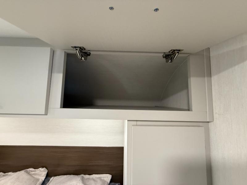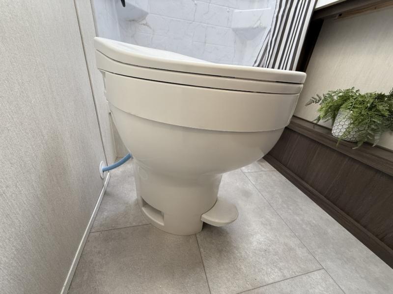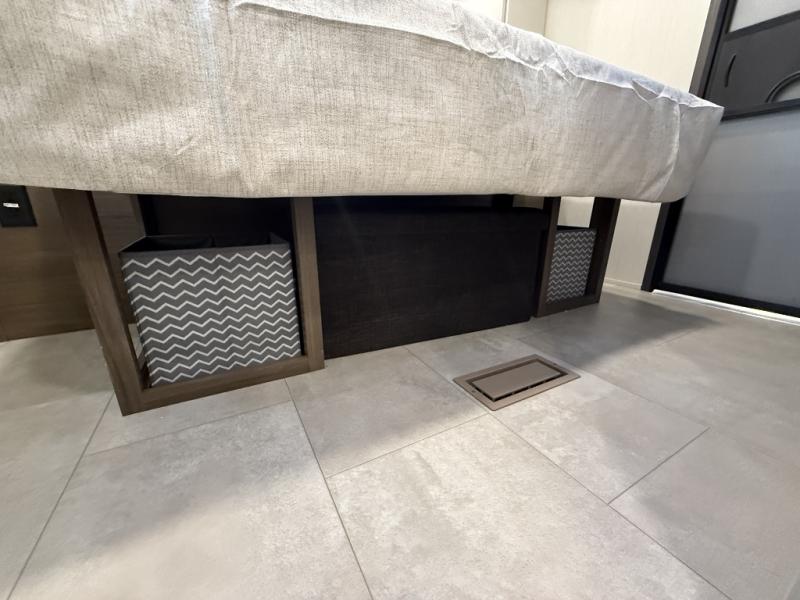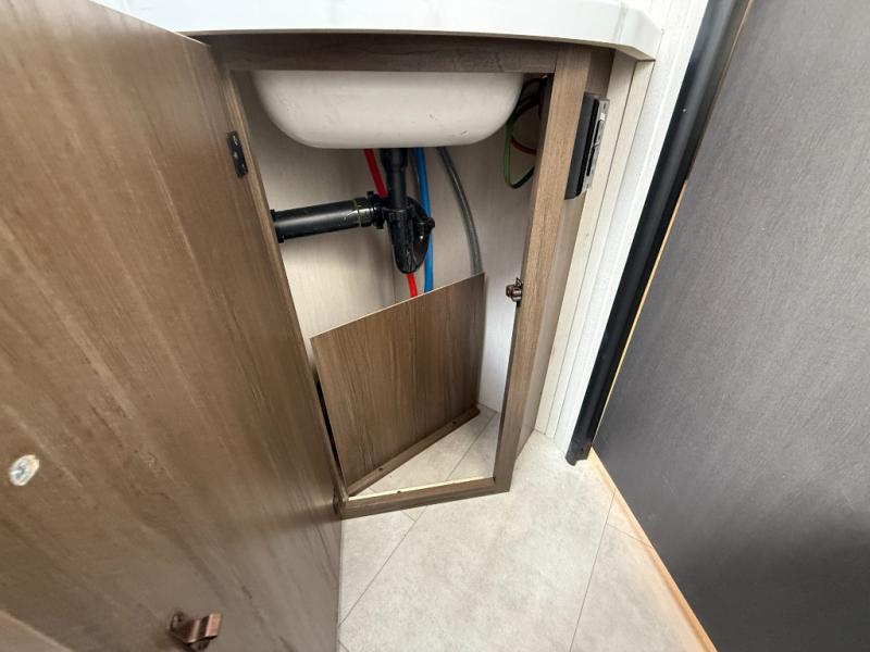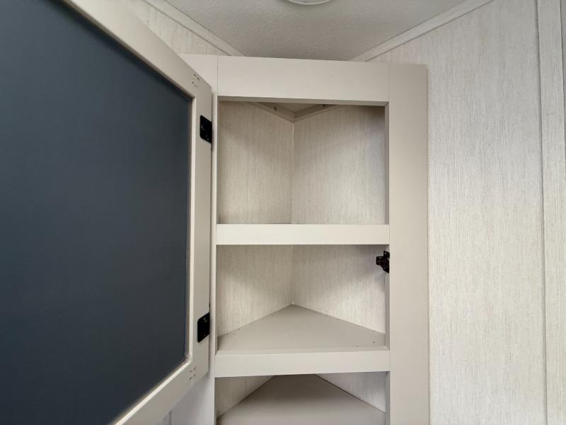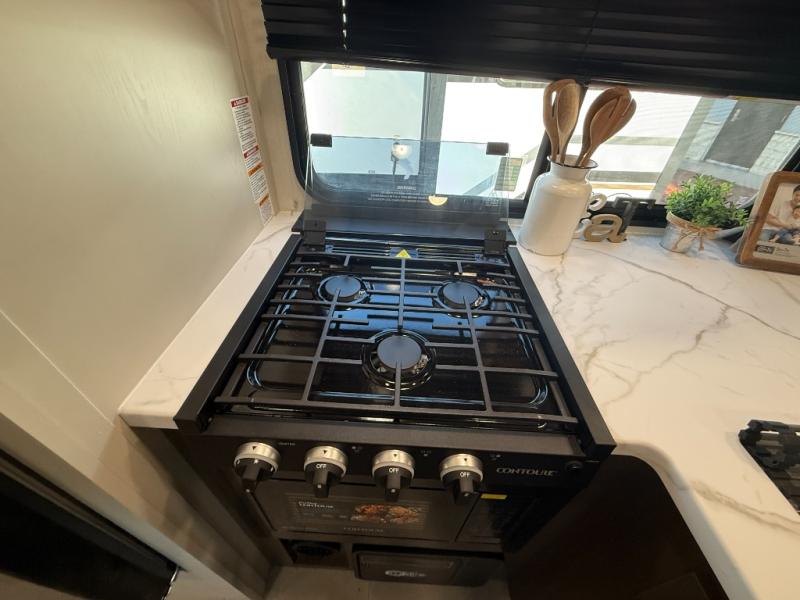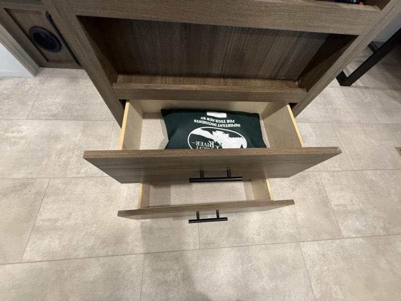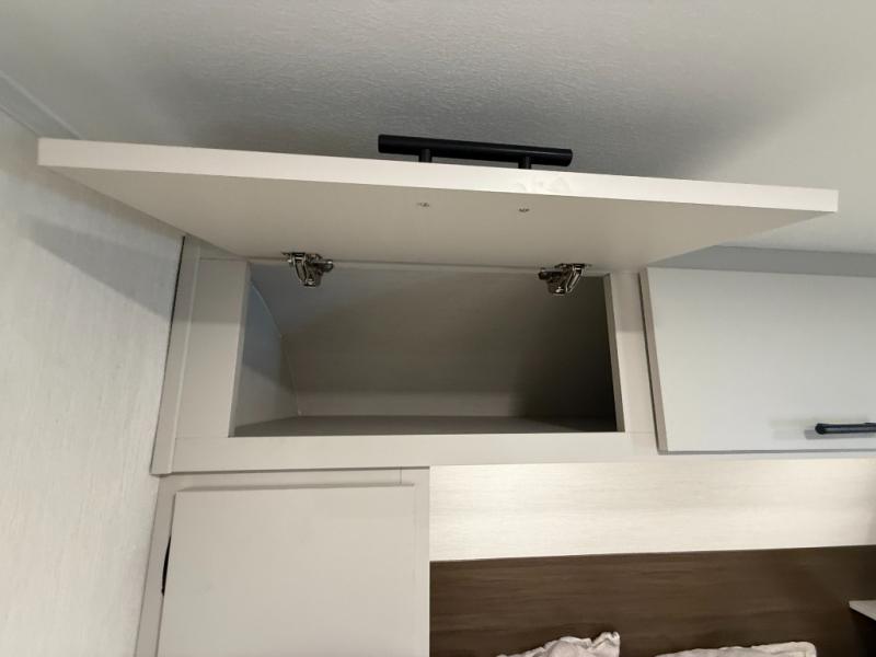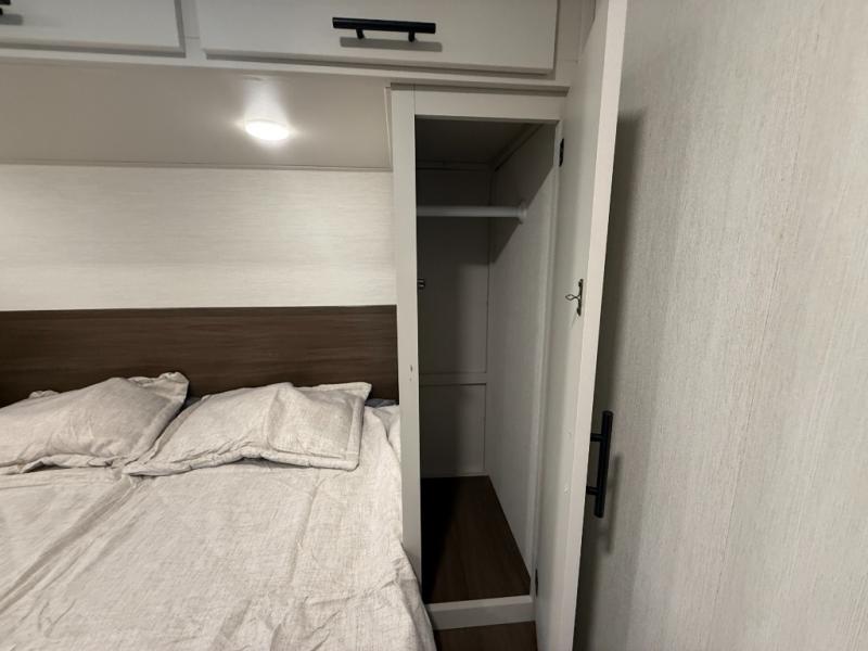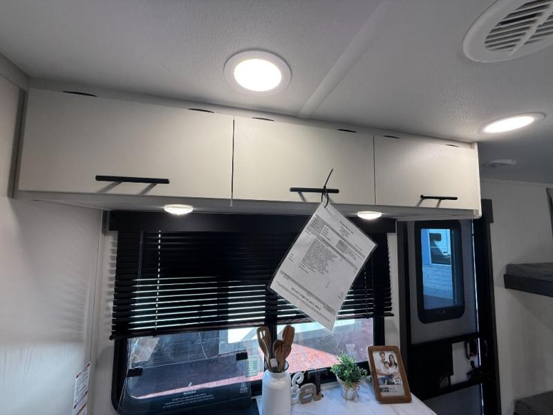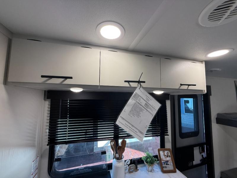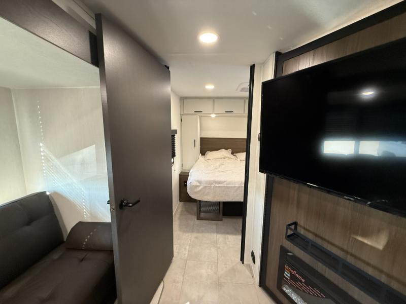 If you're looking for more comfort and a larger sleeping capacity in your next RV, this travel trailer is the one! There are double-size bunks in the rear corner, along with a ladder to easily hop into bed, and the full bath is in the other rear corner for easy nighttime use. You'll enjoy the front private bedroom with its camp king bed and dual wardrobes for your things, and a separate closet with washer and dryer prep if you choose to add those appliances. And one of the dual entry doors is located here so you can easily slip out in the morning without waking everyone else up in the trailer! In the morning, you can make breakfast in the full kitchen, then dine at the booth dinette within the large slide out. There is also a jack knife sofa here for more comfort. This travel trailer also includes plenty of storage space, including a walk-in pantry with shelves, an additional storage closet, and a pass-thru storage outside for fishing poles!