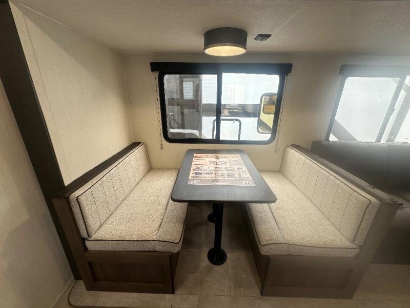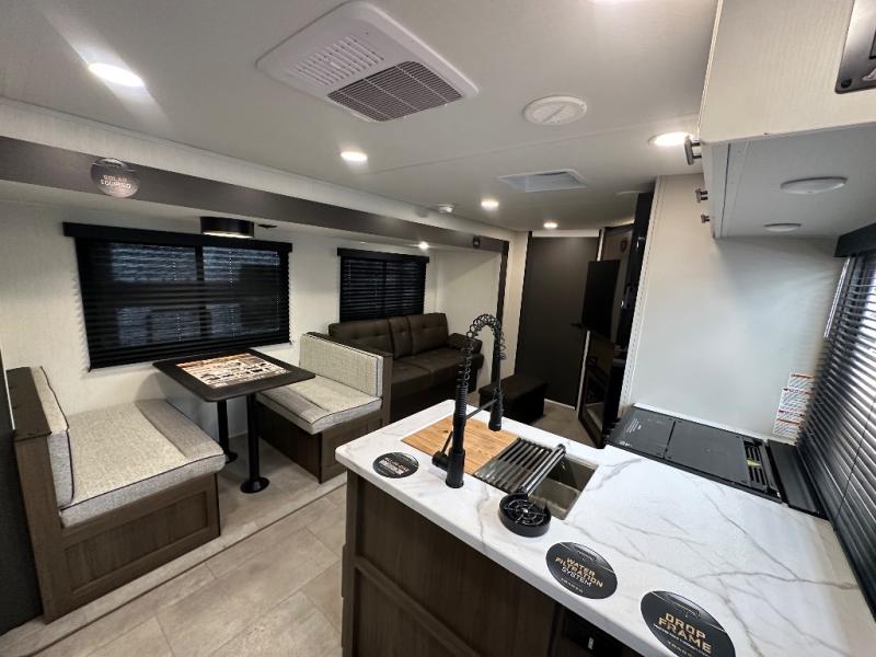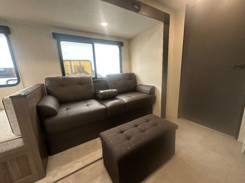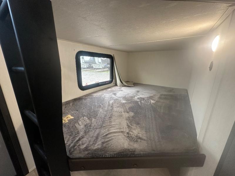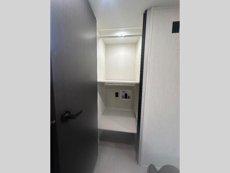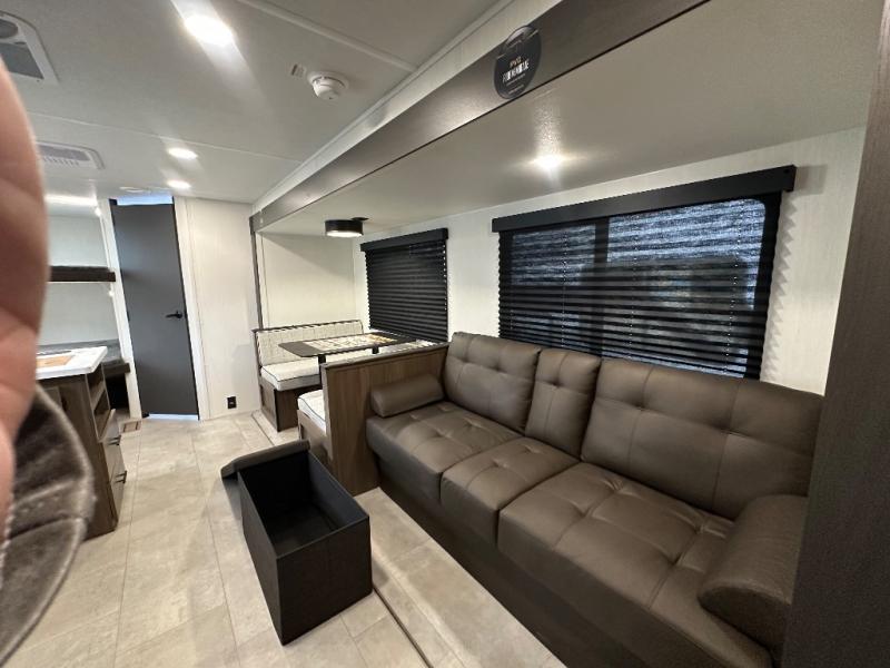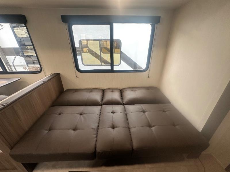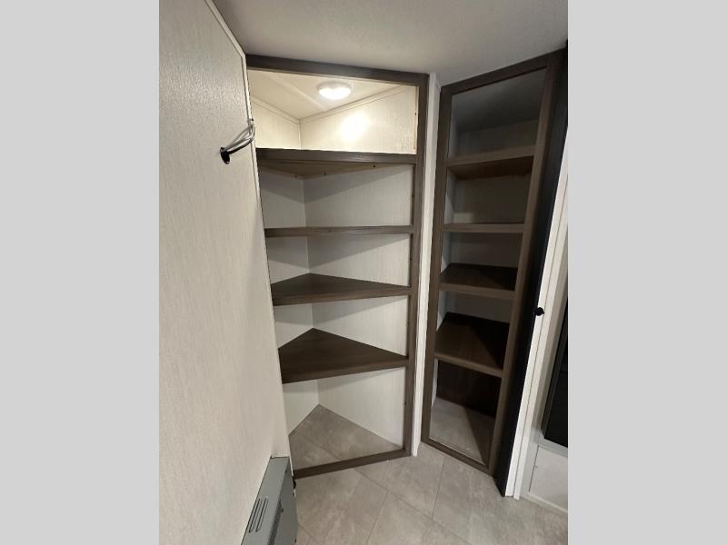 If you're looking for more comfort and a larger sleeping capacity in your next RV, this travel trailer is the one! There are double-size bunks in the rear corner, along with a ladder to easily hop into bed, and the full bath is in the other rear corner for easy nighttime use. You'll enjoy the front private bedroom with its camp king bed and dual wardrobes for your things, and a separate closet with washer and dryer prep if you choose to add those appliances. And one of the dual entry doors is located here so you can easily slip out in the morning without waking everyone else up in the trailer! In the morning, you can make breakfast in the full kitchen, then dine at the booth dinette within the large slide out. There is also a jack knife sofa here for more comfort. This travel trailer also includes plenty of storage space, including a walk-in pantry with shelves, an additional storage closet, and a pass-thru storage outside for fishing poles!