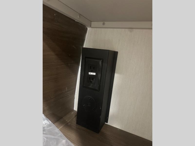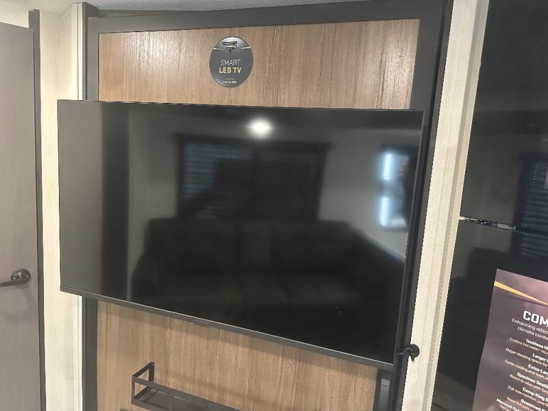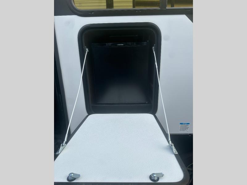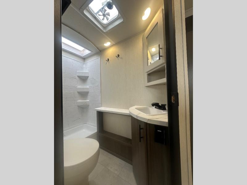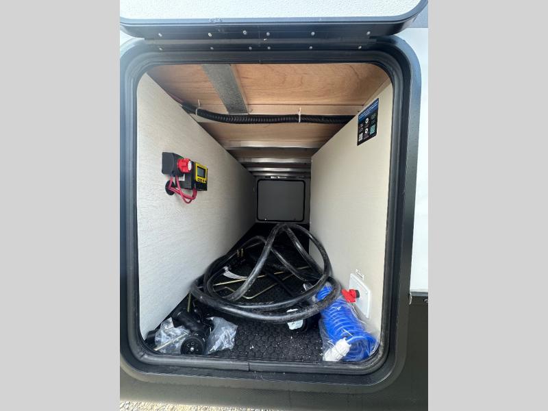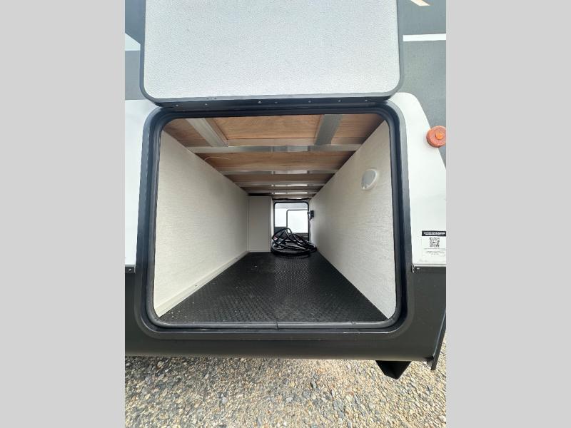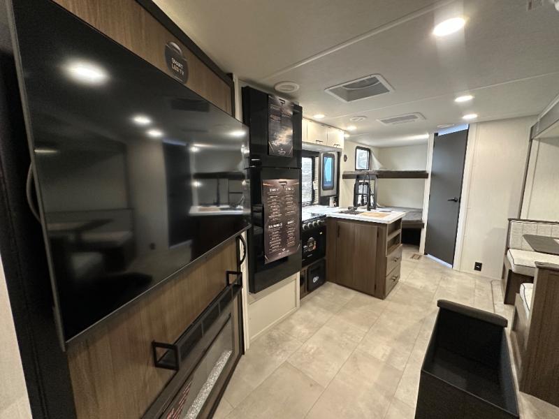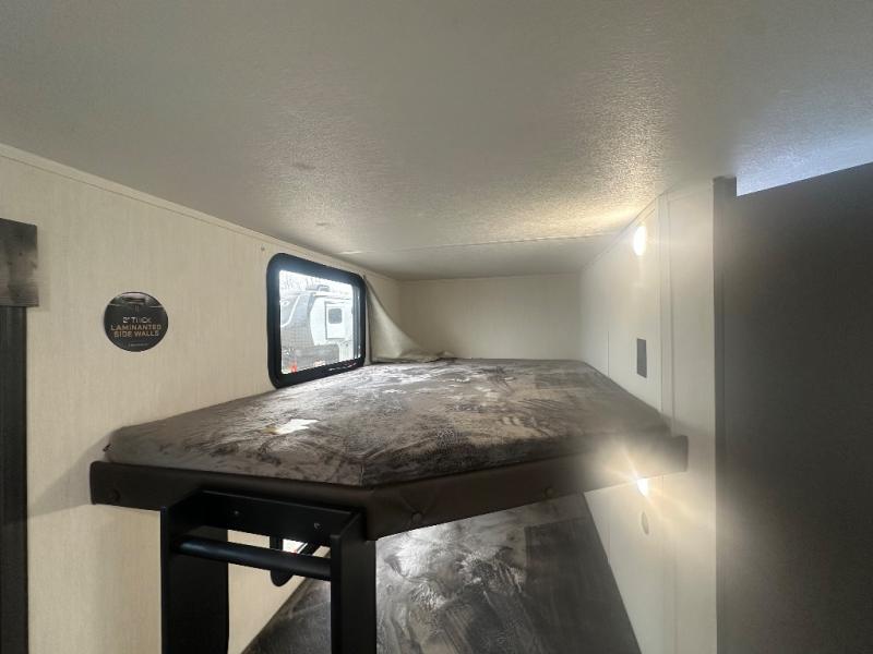 If you're looking for more comfort and a larger sleeping capacity in your next RV, this travel trailer is the one! There are double-size bunks in the rear corner, along with a ladder to easily hop into bed, and the full bath is in the other rear corner for easy nighttime use. You'll enjoy the front private bedroom with its camp king bed and dual wardrobes for your things, and a separate closet with washer and dryer prep if you choose to add those appliances. And one of the dual entry doors is located here so you can easily slip out in the morning without waking everyone else up in the trailer! In the morning, you can make breakfast in the full kitchen, then dine at the booth dinette within the large slide out. There is also a jack knife sofa here for more comfort. This travel trailer also includes plenty of storage space, including a walk-in pantry with shelves, an additional storage closet, and a pass-thru storage outside for fishing poles!