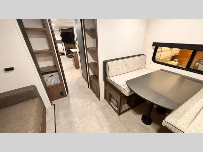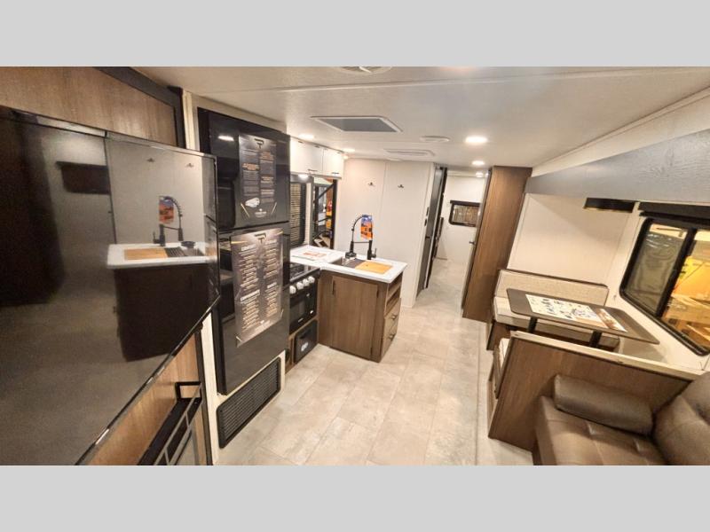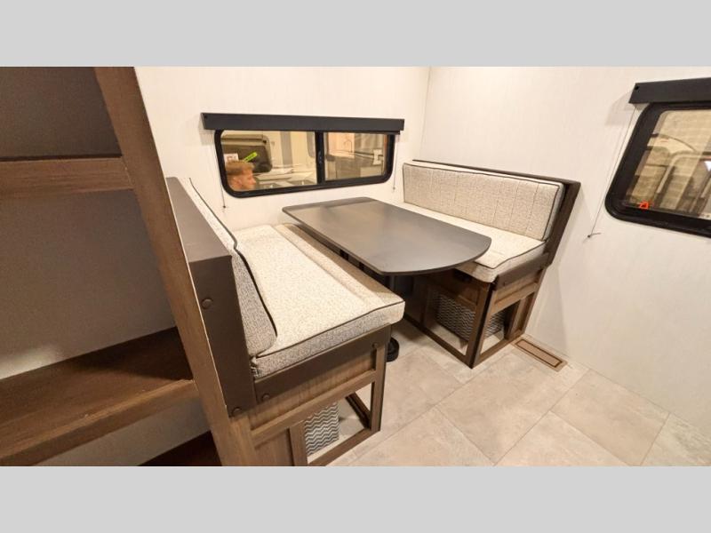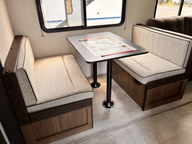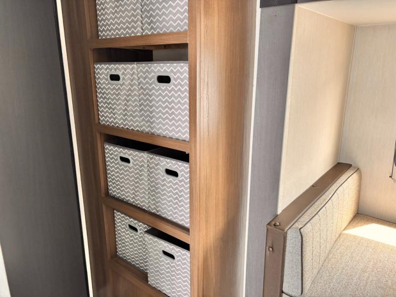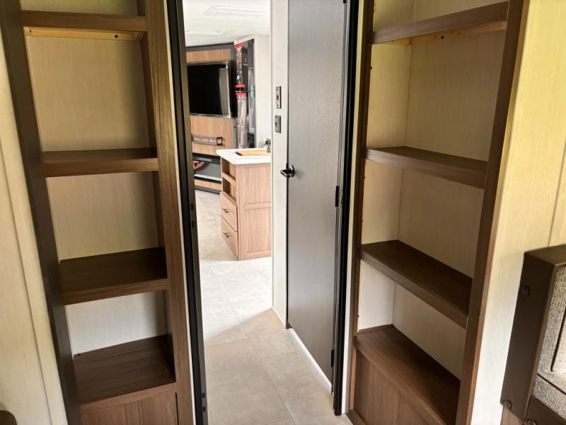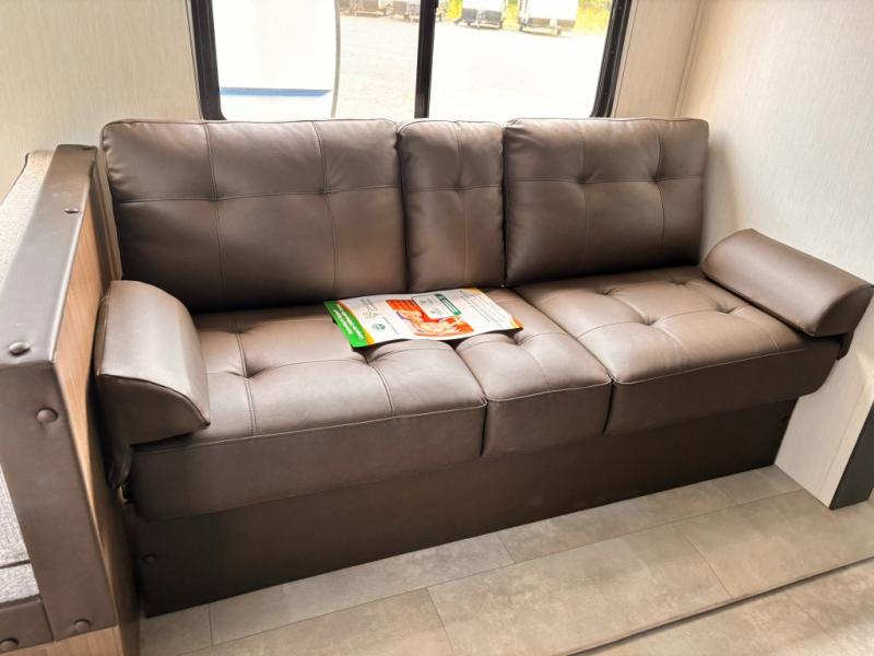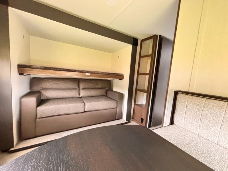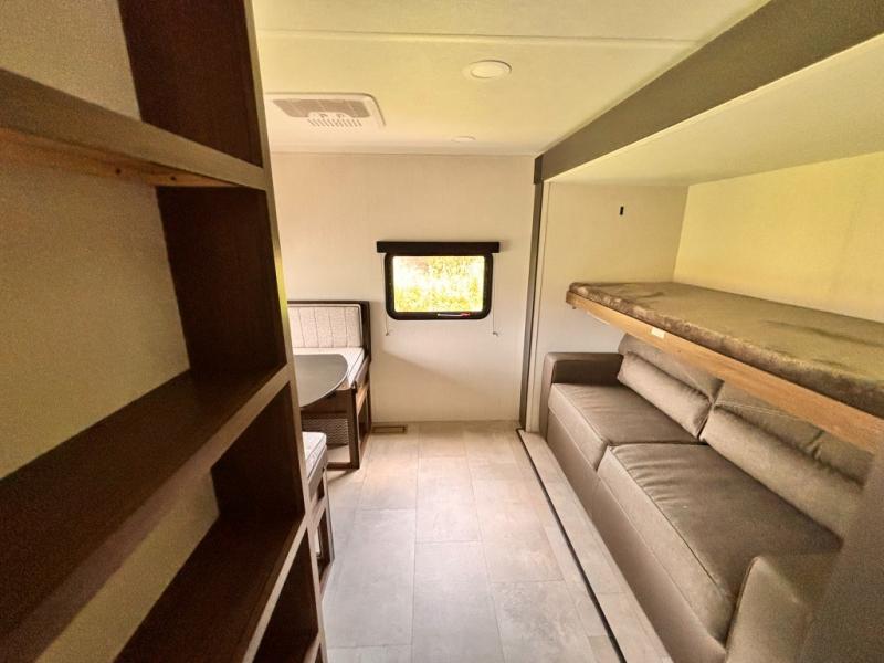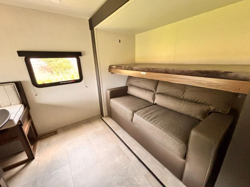 This travel trailer is the best option for a big family! The trailer boasts a spacious bunk bed above a sofa bed, providing ample sleeping space for kids and adults alike. The luxurious front king bed is a serene retreat, featuring expansive wardrobes and overhead cabinets for storing your essentials. The charming booth dinette is a cozy spot for meals or extra sleeping space, as well as the versatile jackknife sofa, which also provides additional sleeping space or a comfortable spot to relax. The sleek entertainment center is perfect for family movie nights. The well-appointed kitchen is equipped with a large fridge, convenient shelves, and a spacious pantry, making meal prep and storage an easy chore. The modern full bathroom features a well-stocked linen closet and provides a convenient space for freshening up. Plus, with two convenient entry/exit doors, this trailer offers added flexibility and ease of use, and the ample overhead cabinets provide additional storage space for your belongings.