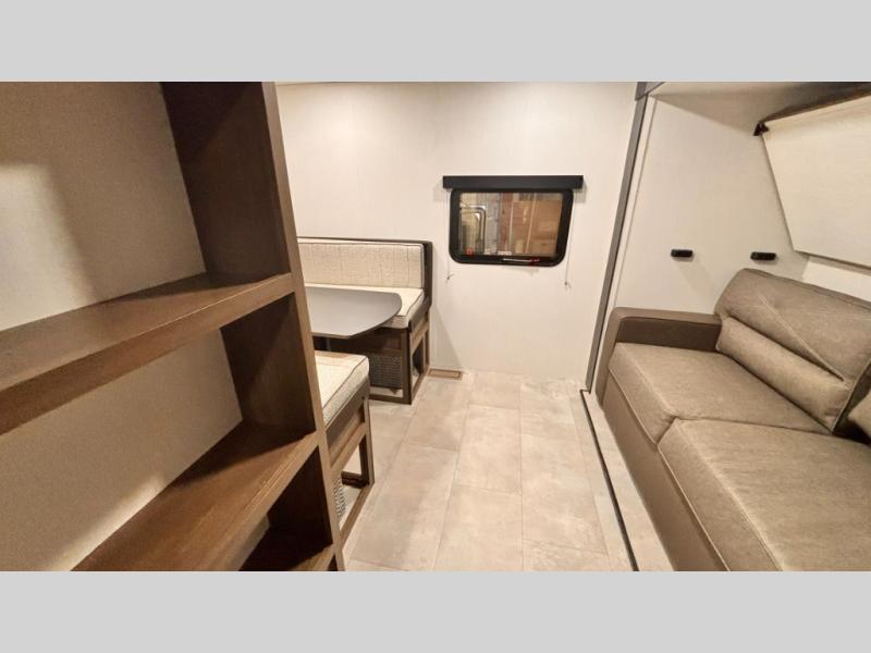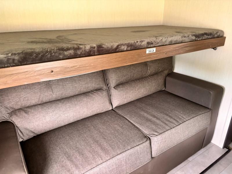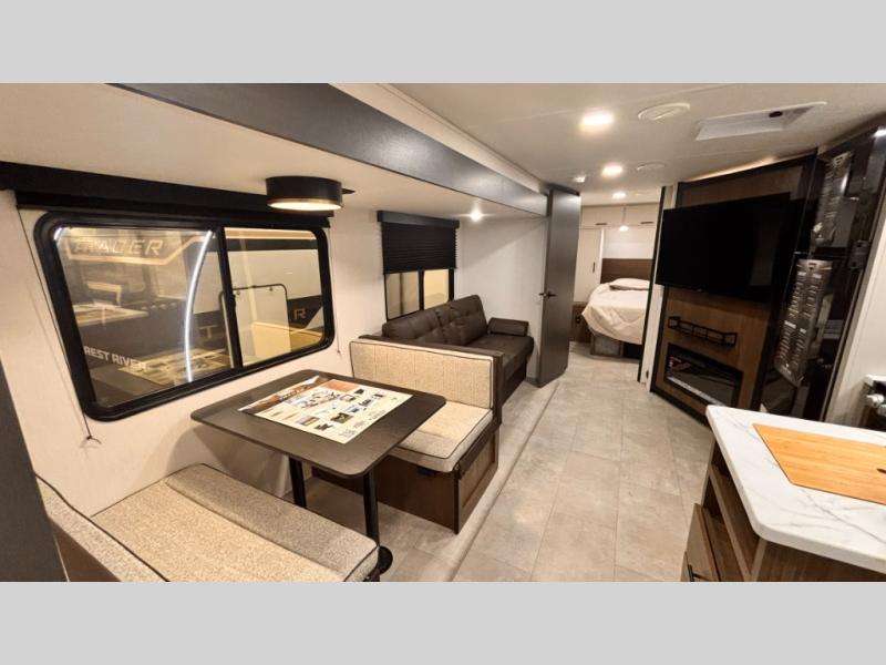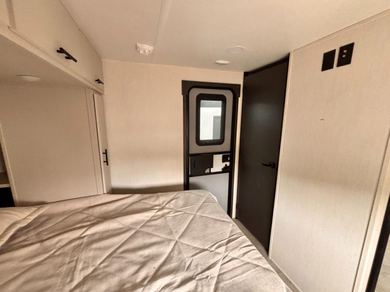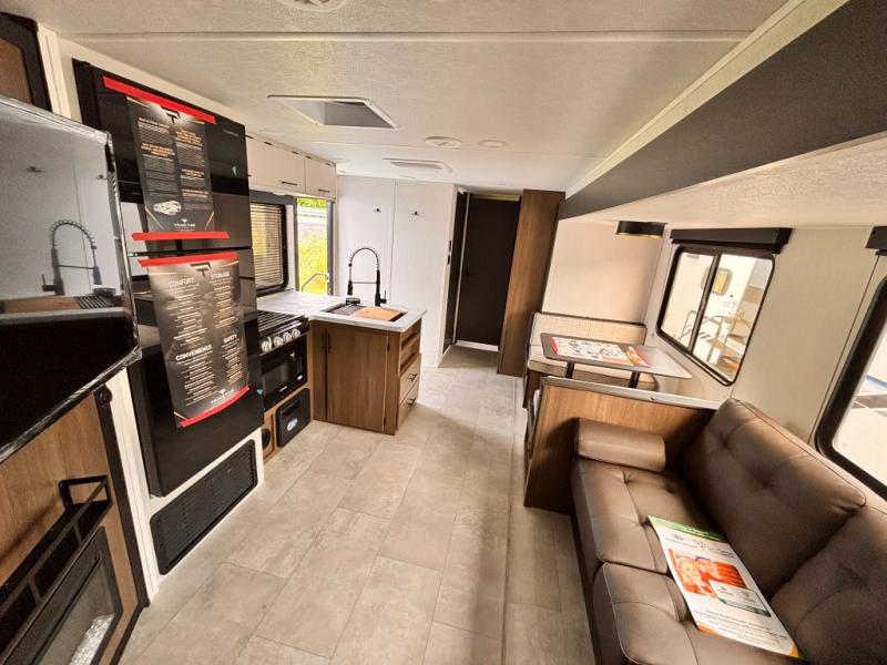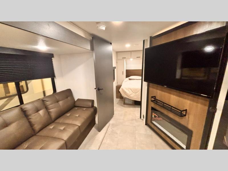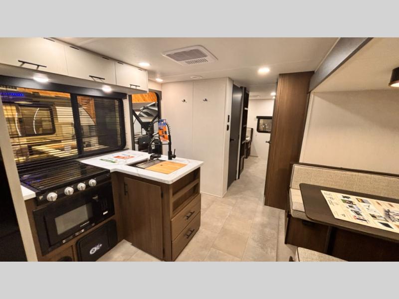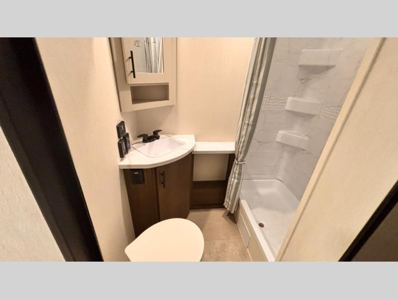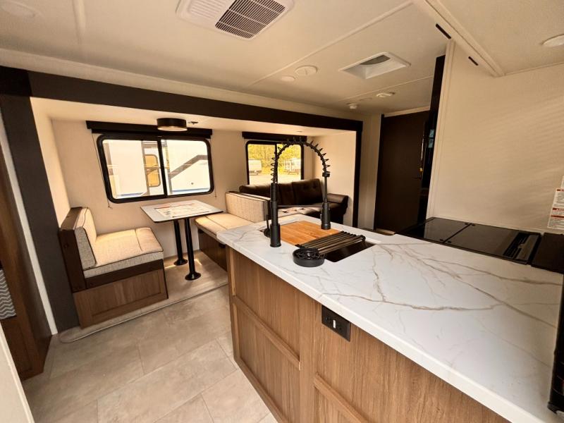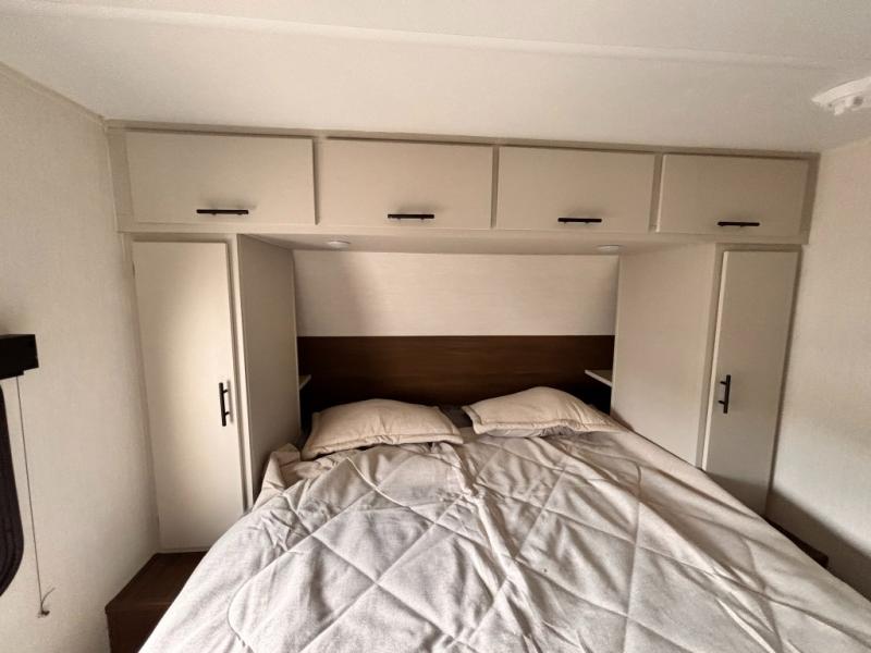 This travel trailer is the best option for a big family! The trailer boasts a spacious bunk bed above a sofa bed, providing ample sleeping space for kids and adults alike. The luxurious front king bed is a serene retreat, featuring expansive wardrobes and overhead cabinets for storing your essentials. The charming booth dinette is a cozy spot for meals or extra sleeping space, as well as the versatile jackknife sofa, which also provides additional sleeping space or a comfortable spot to relax. The sleek entertainment center is perfect for family movie nights. The well-appointed kitchen is equipped with a large fridge, convenient shelves, and a spacious pantry, making meal prep and storage an easy chore. The modern full bathroom features a well-stocked linen closet and provides a convenient space for freshening up. Plus, with two convenient entry/exit doors, this trailer offers added flexibility and ease of use, and the ample overhead cabinets provide additional storage space for your belongings.