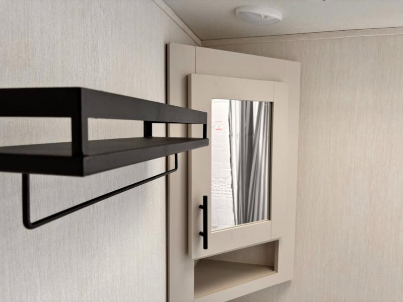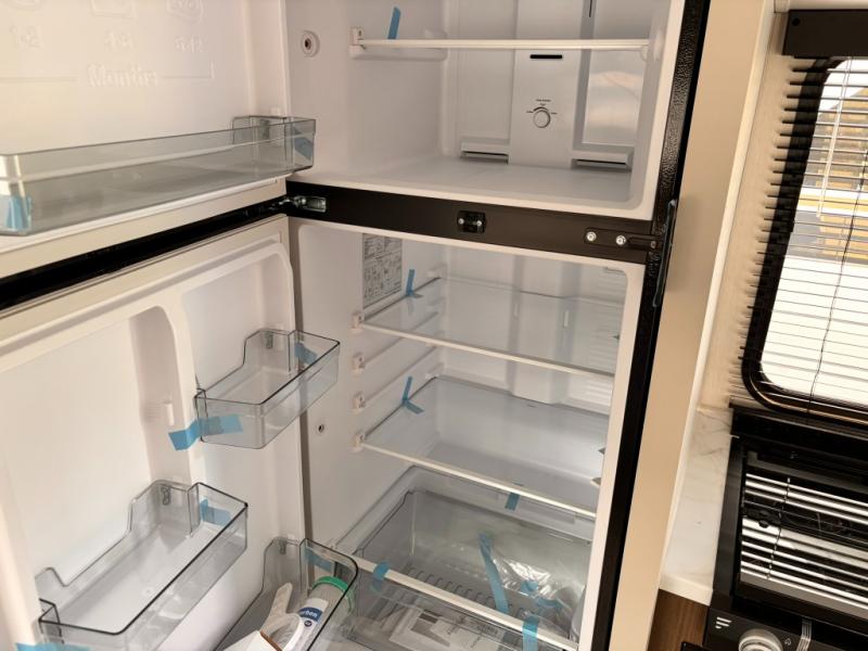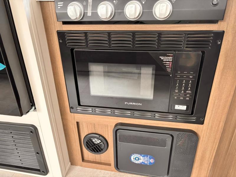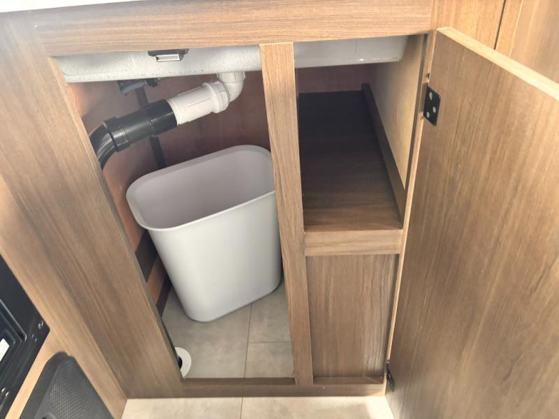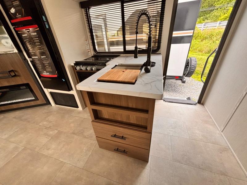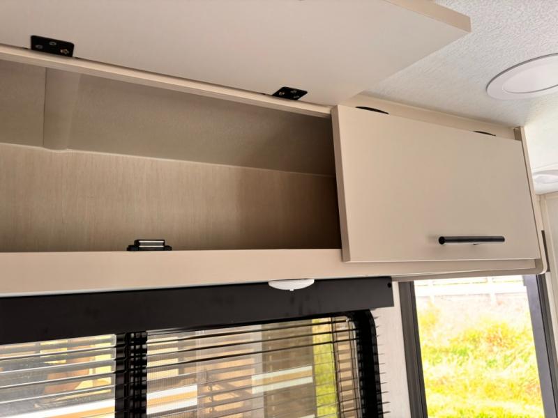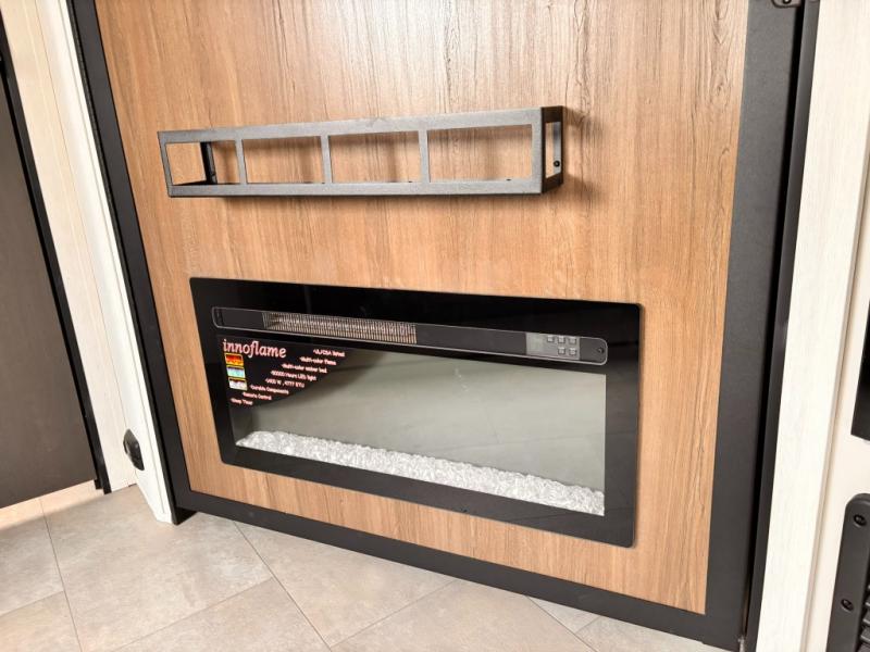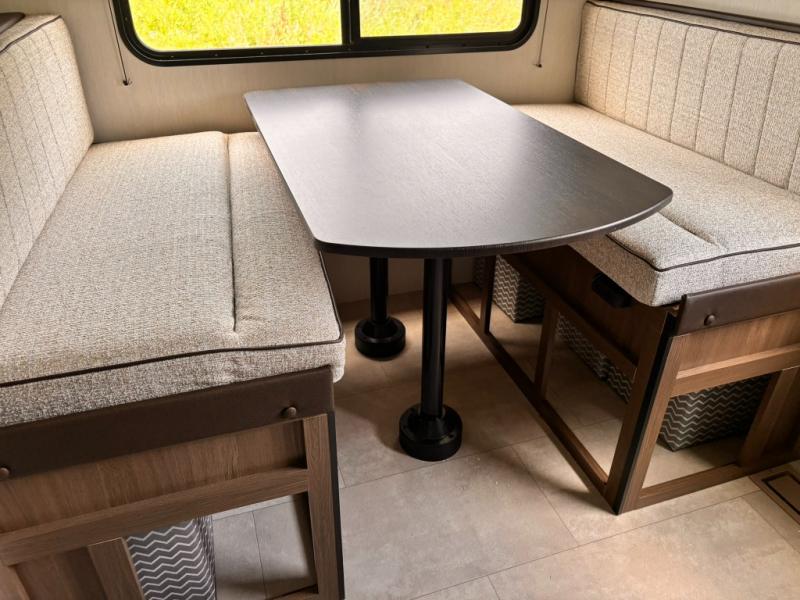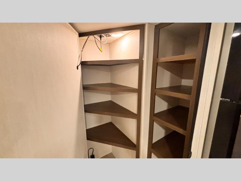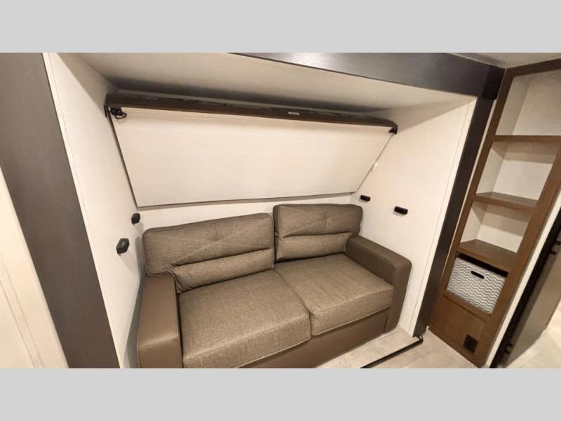This travel trailer is the best option for a big family! The trailer boasts a spacious bunk bed above a sofa bed, providing ample sleeping space for kids and adults alike. The luxurious front king bed is a serene retreat, featuring expansive wardrobes and overhead cabinets for storing your essentials. The charming booth dinette is a cozy spot for meals or extra sleeping space, as well as the versatile jackknife sofa, which also provides additional sleeping space or a comfortable spot to relax. The sleek entertainment center is perfect for family movie nights. The well-appointed kitchen is equipped with a large fridge, convenient shelves, and a spacious pantry, making meal prep and storage an easy chore. The modern full bathroom features a well-stocked linen closet and provides a convenient space for freshening up. Plus, with two convenient entry/exit doors, this trailer offers added flexibility and ease of use, and the ample overhead cabinets provide additional storage space for your belongings.
