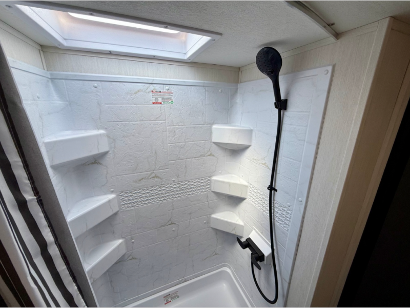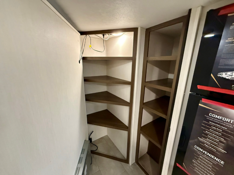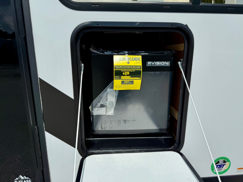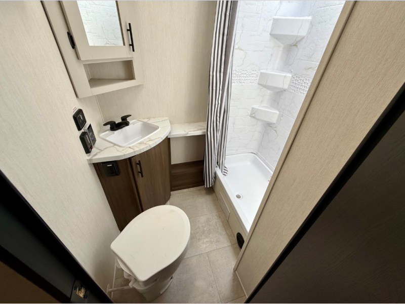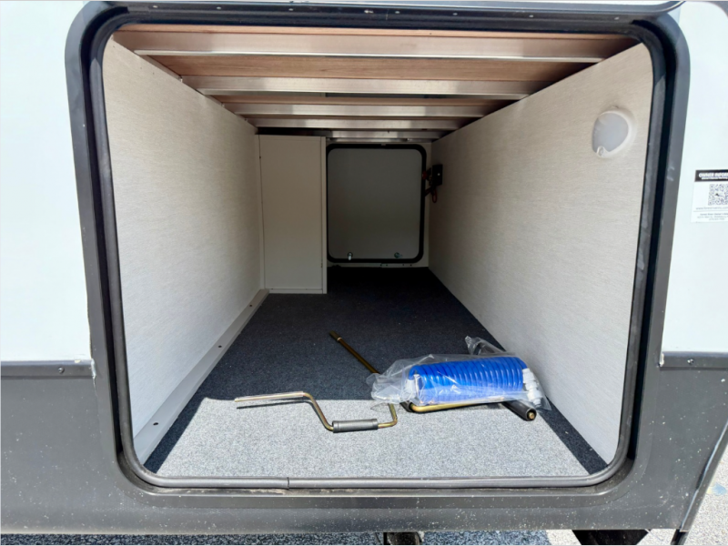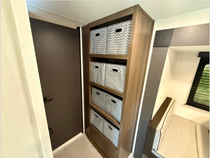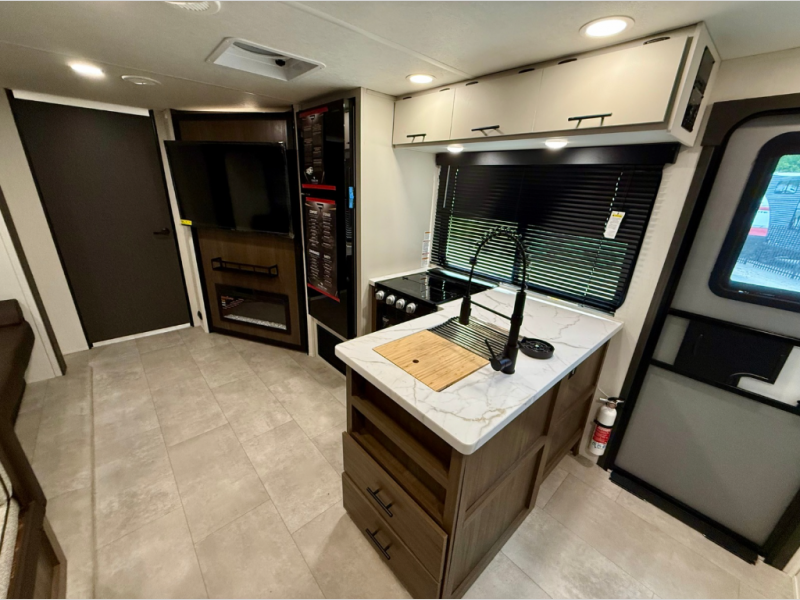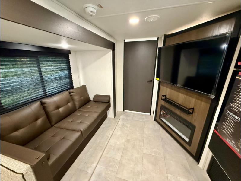 This travel trailer is the best option for a big family! The trailer boasts a spacious bunk bed above a sofa bed, providing ample sleeping space for kids and adults alike. The luxurious front king bed is a serene retreat, featuring expansive wardrobes and overhead cabinets for storing your essentials. The charming booth dinette is a cozy spot for meals or extra sleeping space, as well as the versatile jackknife sofa, which also provides additional sleeping space or a comfortable spot to relax. The sleek entertainment center is perfect for family movie nights. The well-appointed kitchen is equipped with a large fridge, convenient shelves, and a spacious pantry, making meal prep and storage an easy chore. The modern full bathroom features a well-stocked linen closet and provides a convenient space for freshening up. Plus, with two convenient entry/exit doors, this trailer offers added flexibility and ease of use, and the ample overhead cabinets provide additional storage space for your belongings.