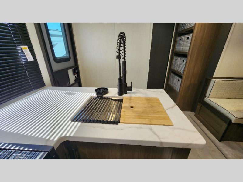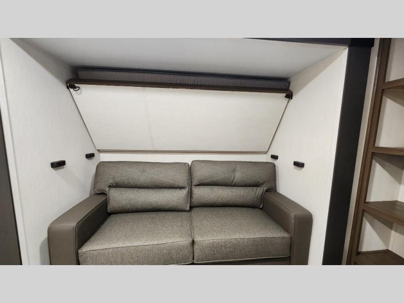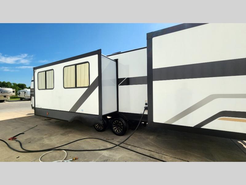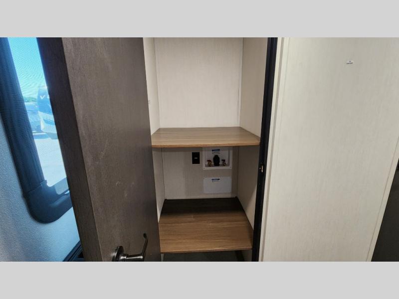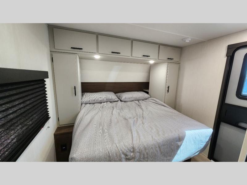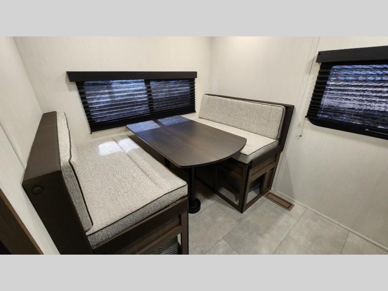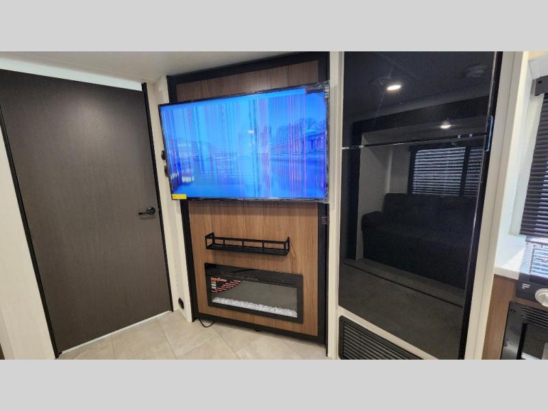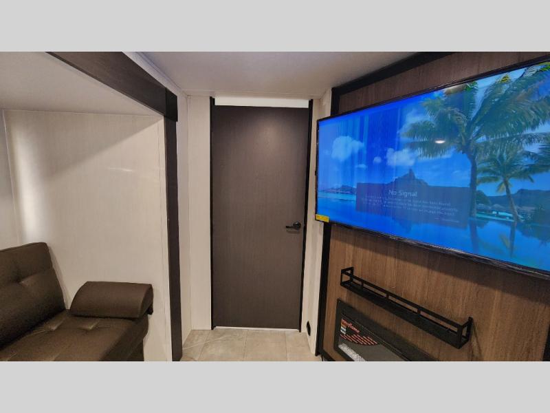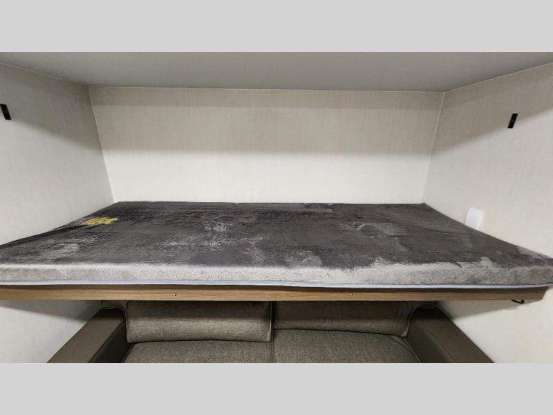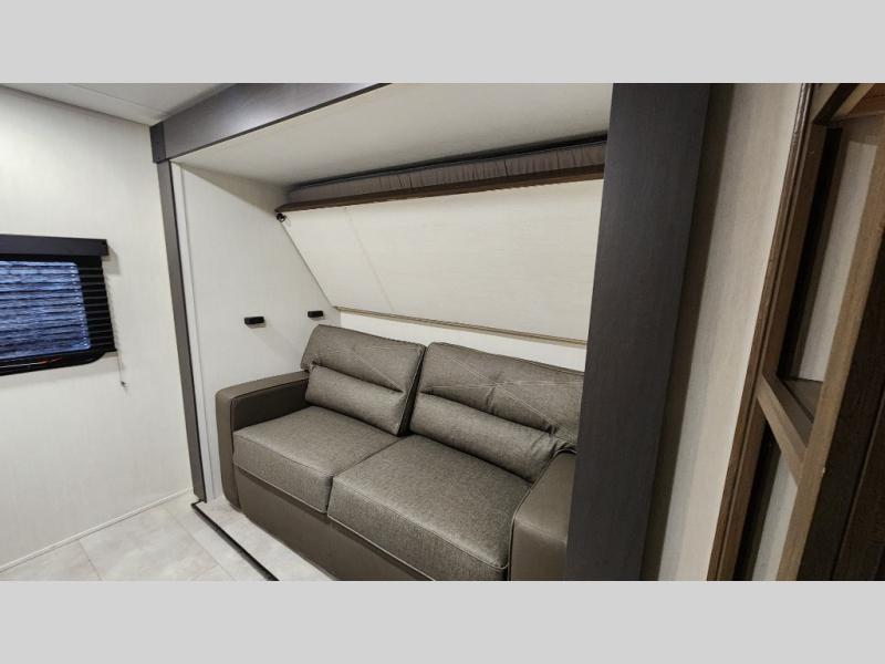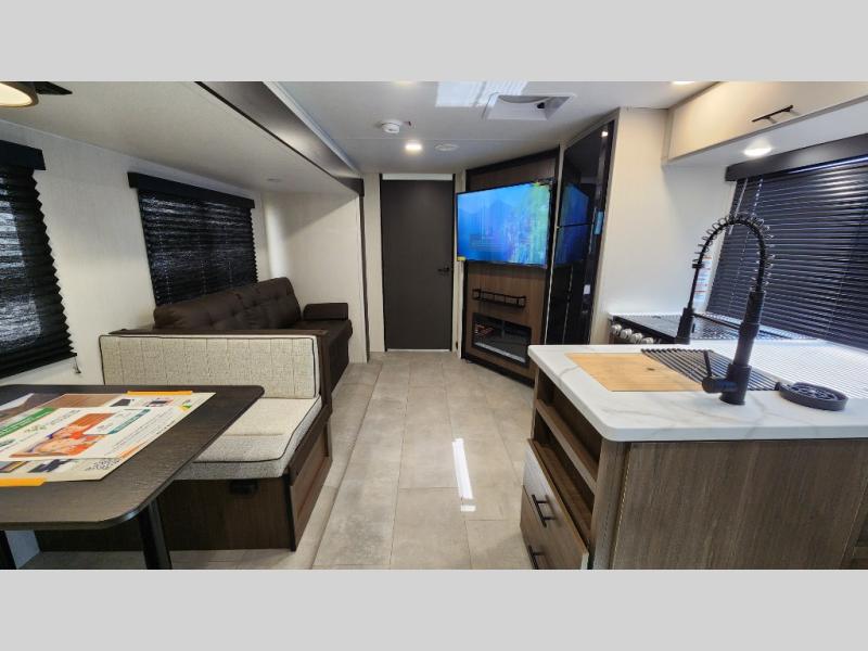 This travel trailer is the best option for a big family! The trailer boasts a spacious bunk bed above a sofa bed, providing ample sleeping space for kids and adults alike. The luxurious front king bed is a serene retreat, featuring expansive wardrobes and overhead cabinets for storing your essentials. The charming booth dinette is a cozy spot for meals or extra sleeping space, as well as the versatile jackknife sofa, which also provides additional sleeping space or a comfortable spot to relax. The sleek entertainment center is perfect for family movie nights. The well-appointed kitchen is equipped with a large fridge, convenient shelves, and a spacious pantry, making meal prep and storage an easy chore. The modern full bathroom features a well-stocked linen closet and provides a convenient space for freshening up. Plus, with two convenient entry/exit doors, this trailer offers added flexibility and ease of use, and the ample overhead cabinets provide additional storage space for your belongings.
