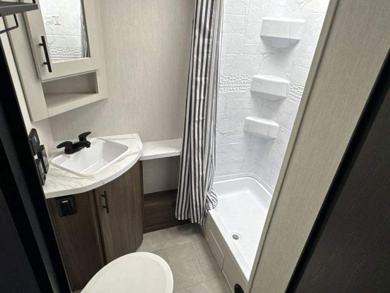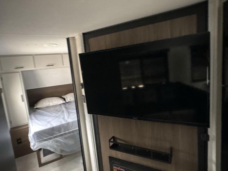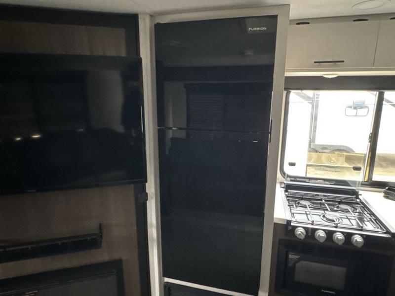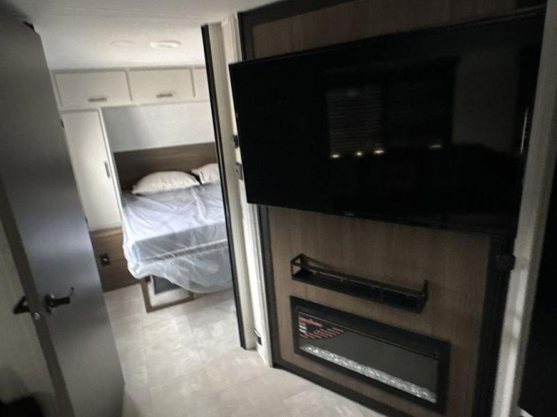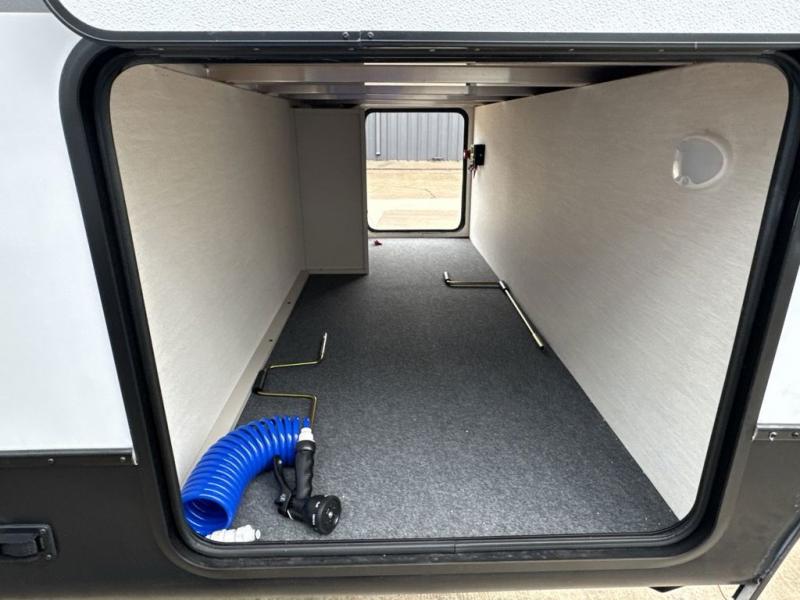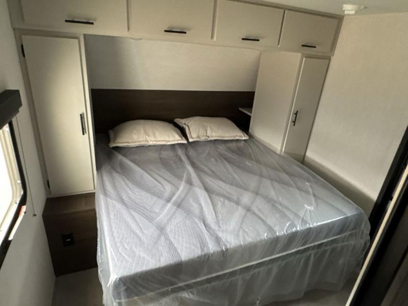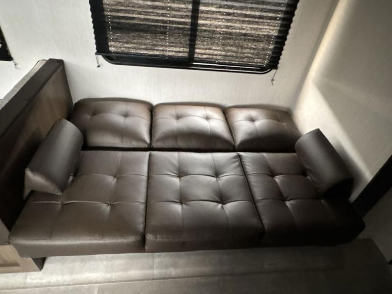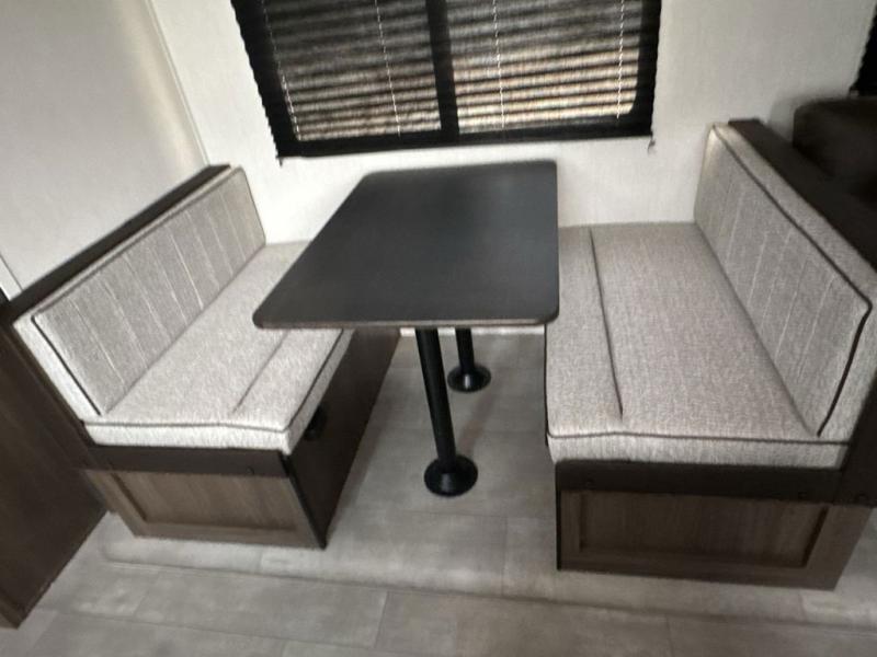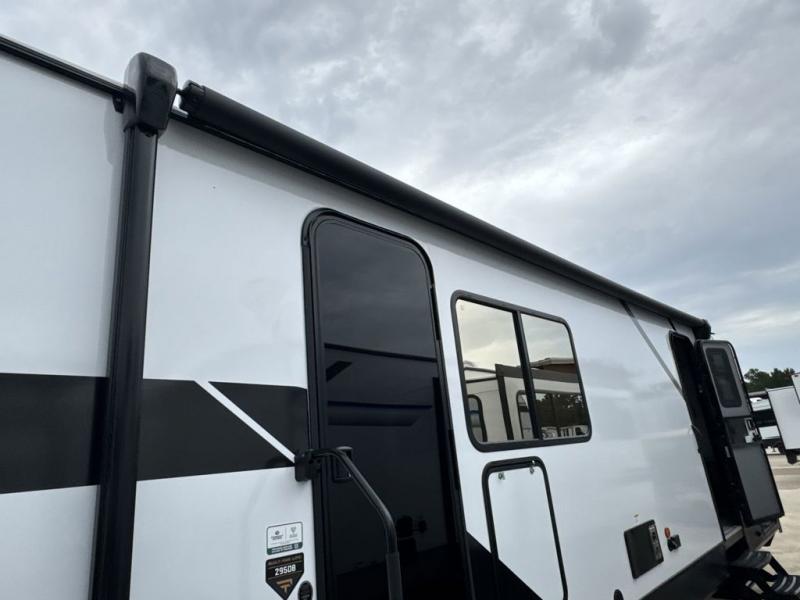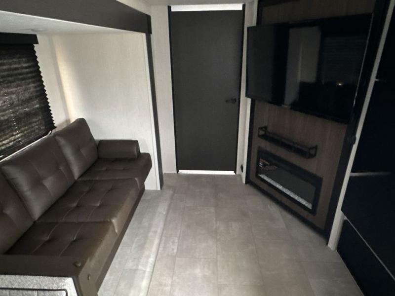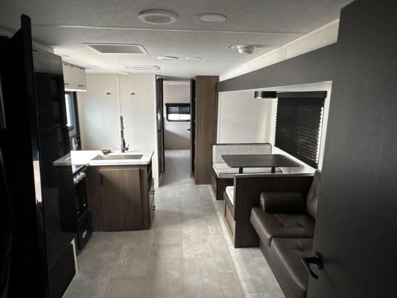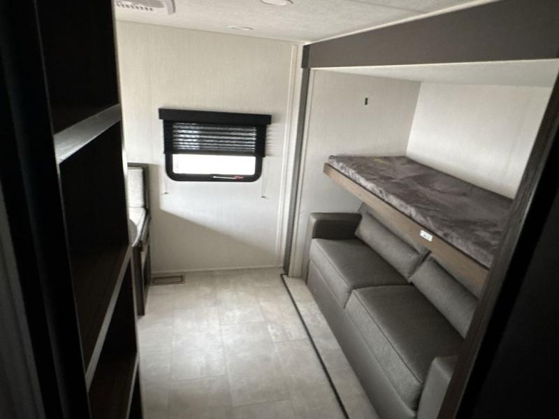 This travel trailer is the best option for a big family! The trailer boasts a spacious bunk bed above a sofa bed, providing ample sleeping space for kids and adults alike. The luxurious front king bed is a serene retreat, featuring expansive wardrobes and overhead cabinets for storing your essentials. The charming booth dinette is a cozy spot for meals or extra sleeping space, as well as the versatile jackknife sofa, which also provides additional sleeping space or a comfortable spot to relax. The sleek entertainment center is perfect for family movie nights. The well-appointed kitchen is equipped with a large fridge, convenient shelves, and a spacious pantry, making meal prep and storage an easy chore. The modern full bathroom features a well-stocked linen closet and provides a convenient space for freshening up. Plus, with two convenient entry/exit doors, this trailer offers added flexibility and ease of use, and the ample overhead cabinets provide additional storage space for your belongings.