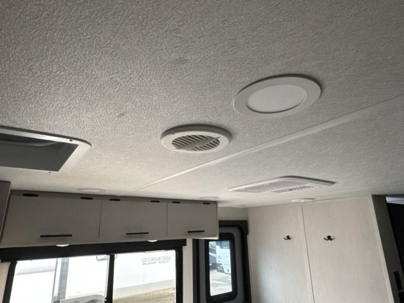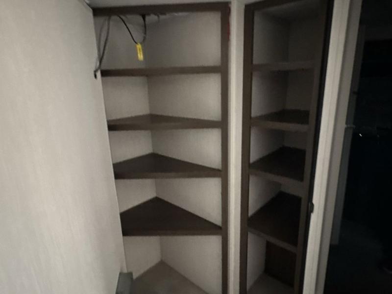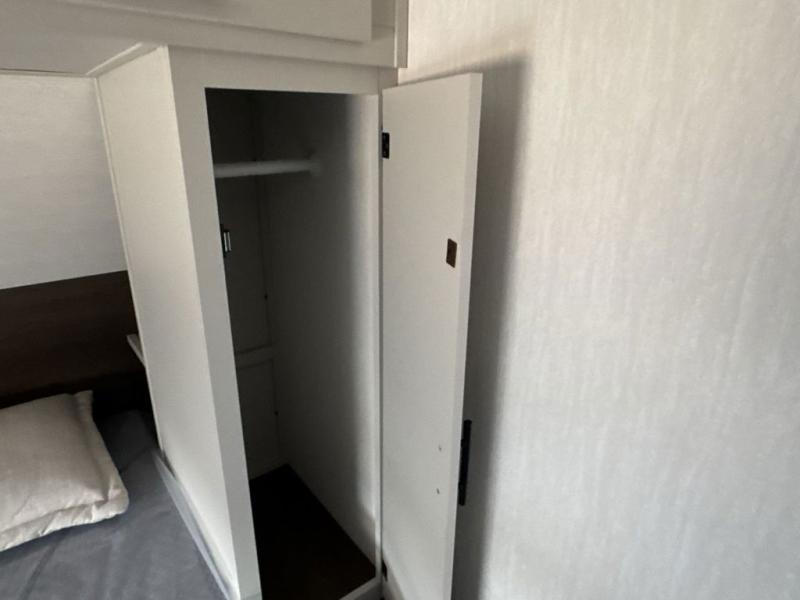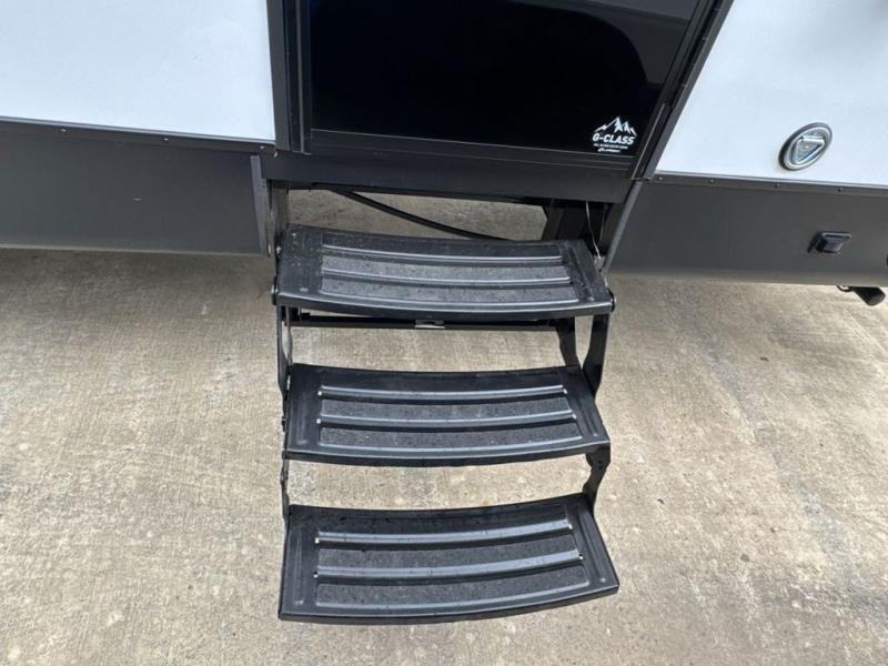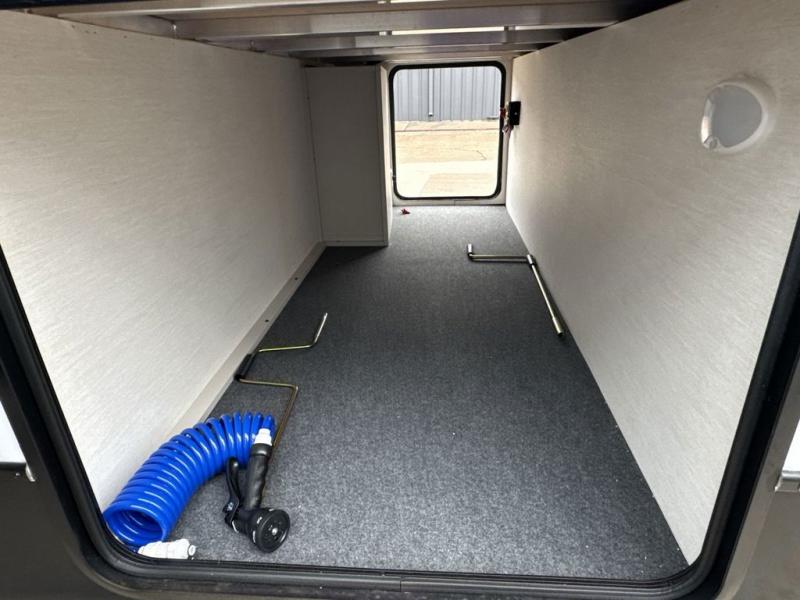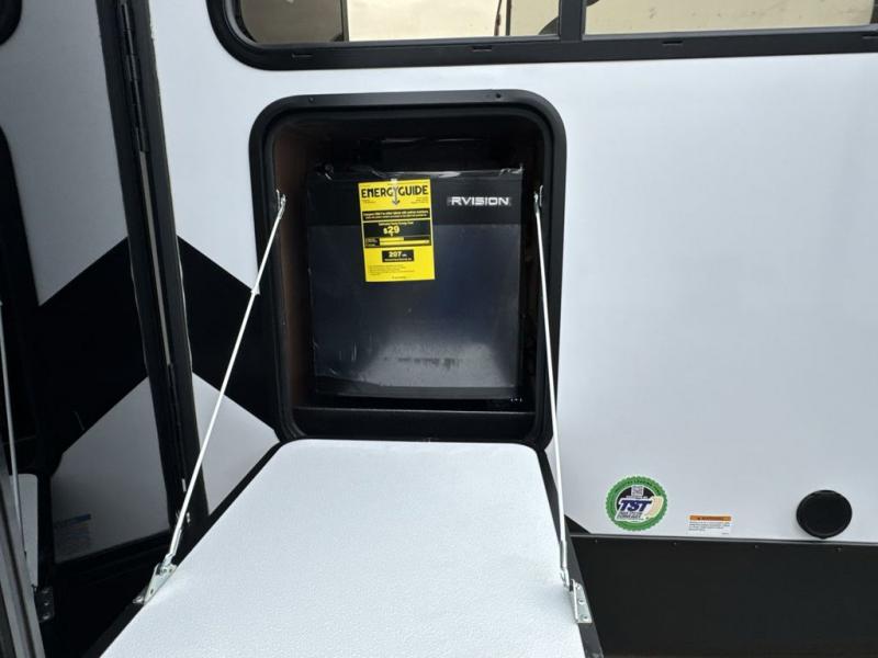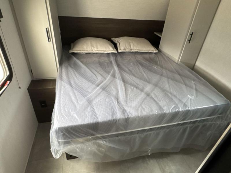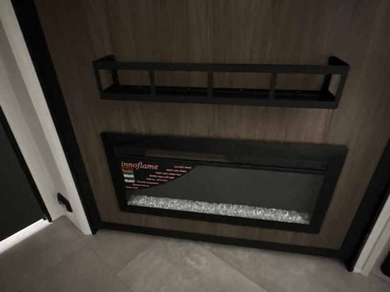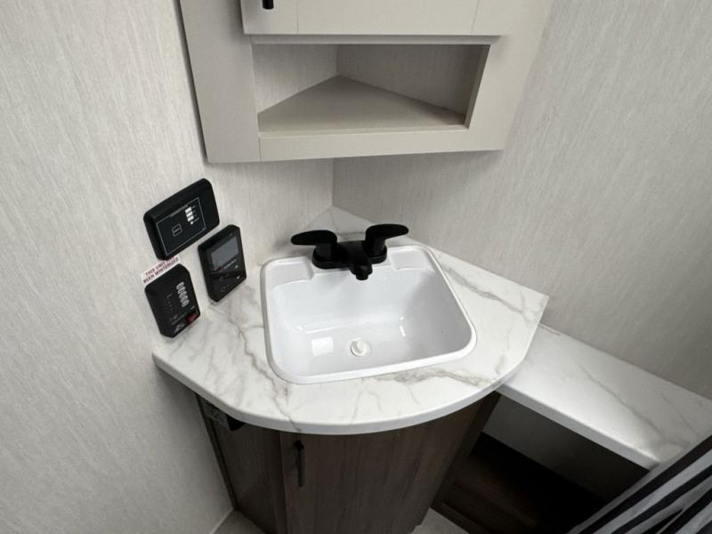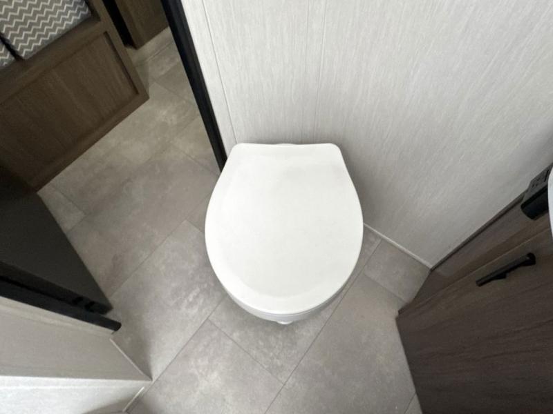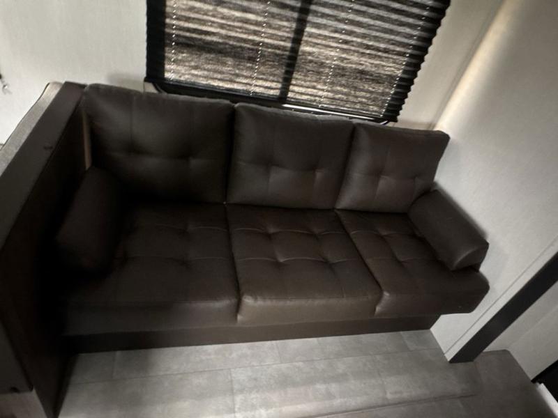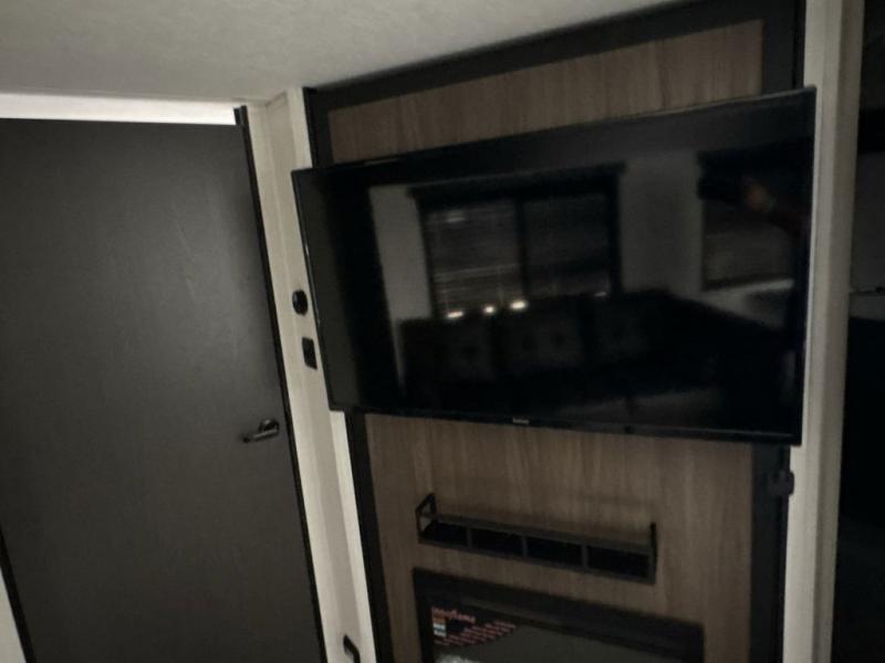 This travel trailer is the best option for a big family! The trailer boasts a spacious bunk bed above a sofa bed, providing ample sleeping space for kids and adults alike. The luxurious front king bed is a serene retreat, featuring expansive wardrobes and overhead cabinets for storing your essentials. The charming booth dinette is a cozy spot for meals or extra sleeping space, as well as the versatile jackknife sofa, which also provides additional sleeping space or a comfortable spot to relax. The sleek entertainment center is perfect for family movie nights. The well-appointed kitchen is equipped with a large fridge, convenient shelves, and a spacious pantry, making meal prep and storage an easy chore. The modern full bathroom features a well-stocked linen closet and provides a convenient space for freshening up. Plus, with two convenient entry/exit doors, this trailer offers added flexibility and ease of use, and the ample overhead cabinets provide additional storage space for your belongings.