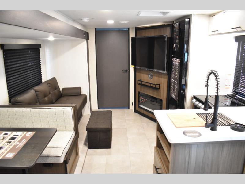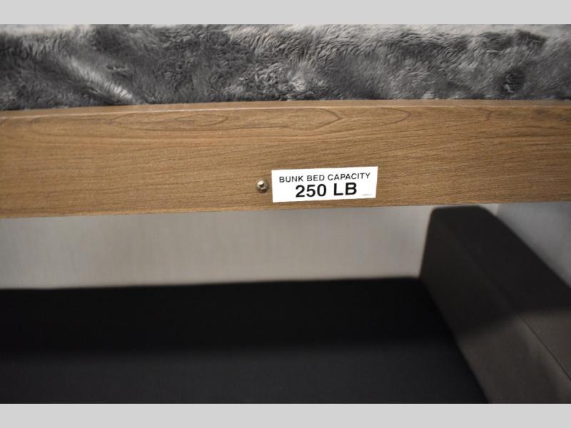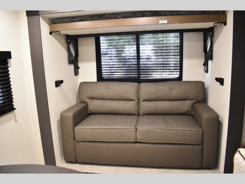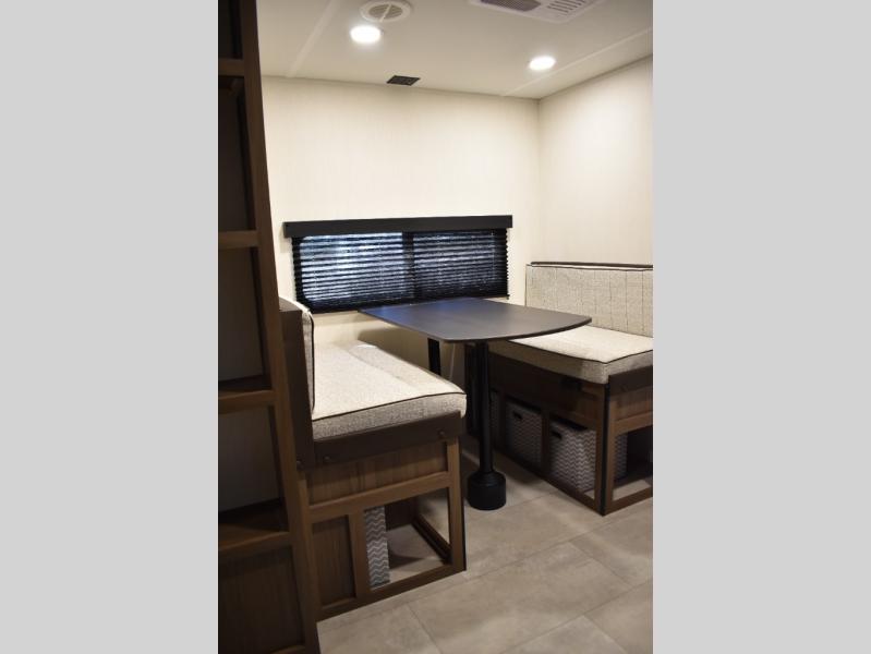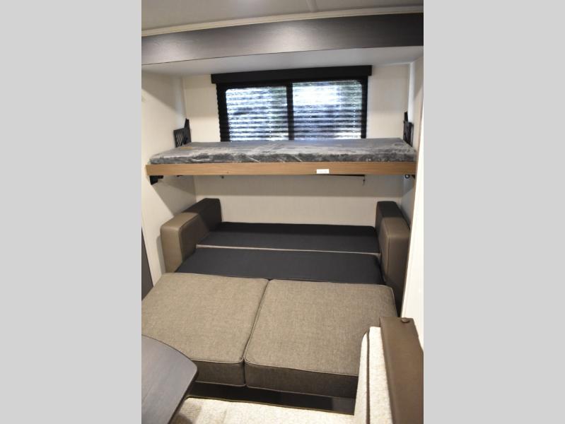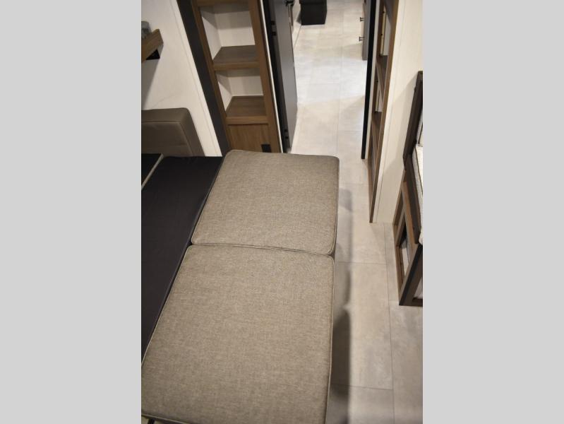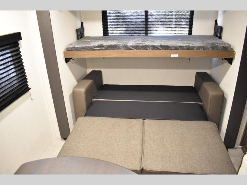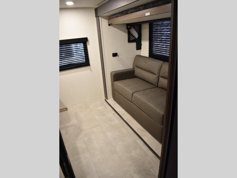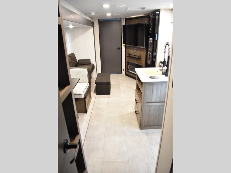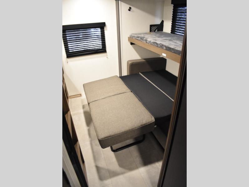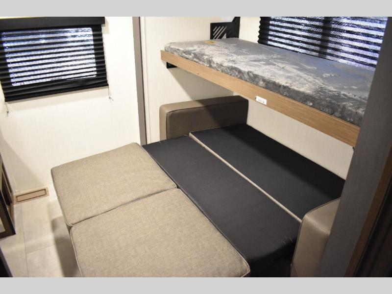 This travel trailer is the best option for a big family! The trailer boasts a spacious bunk bed above a sofa bed, providing ample sleeping space for kids and adults alike. The luxurious front king bed is a serene retreat, featuring expansive wardrobes and overhead cabinets for storing your essentials. The charming booth dinette is a cozy spot for meals or extra sleeping space, as well as the versatile jackknife sofa, which also provides additional sleeping space or a comfortable spot to relax. The sleek entertainment center is perfect for family movie nights. The well-appointed kitchen is equipped with a large fridge, convenient shelves, and a spacious pantry, making meal prep and storage an easy chore. The modern full bathroom features a well-stocked linen closet and provides a convenient space for freshening up. Plus, with two convenient entry/exit doors, this trailer offers added flexibility and ease of use, and the ample overhead cabinets provide additional storage space for your belongings.