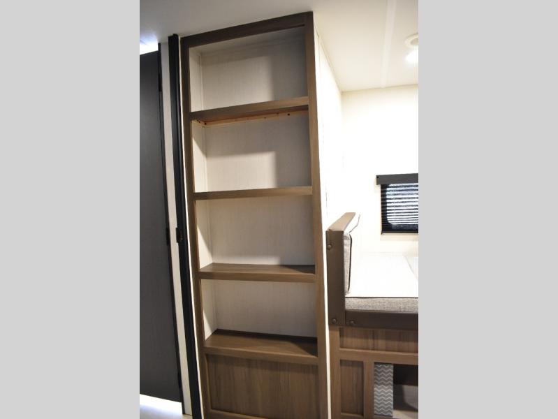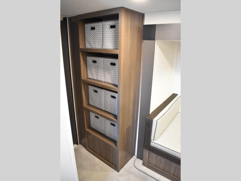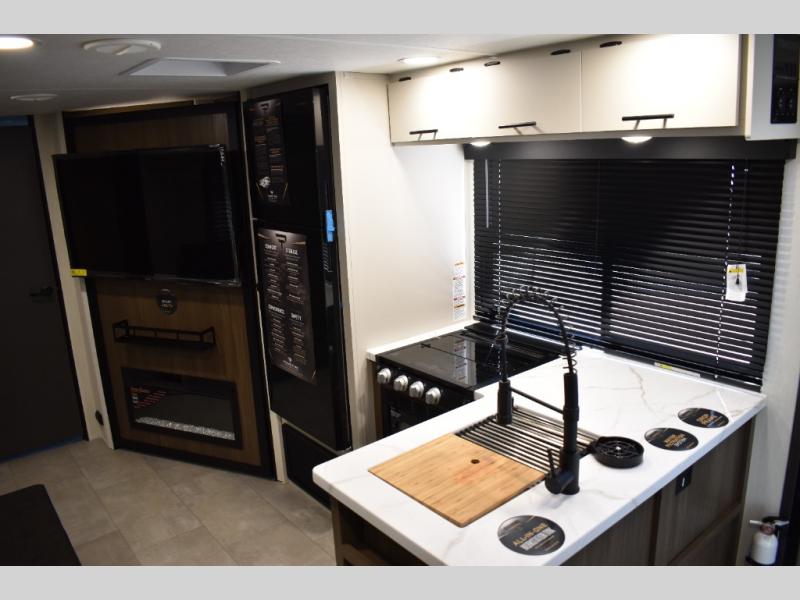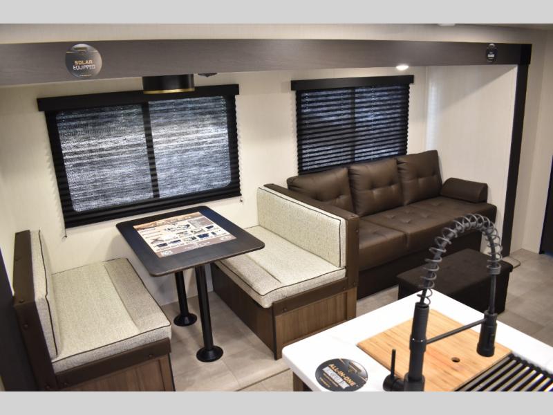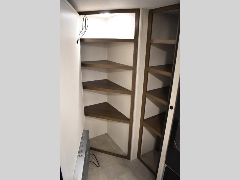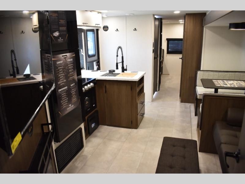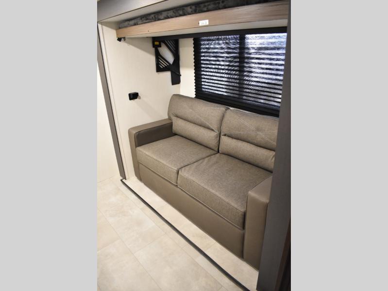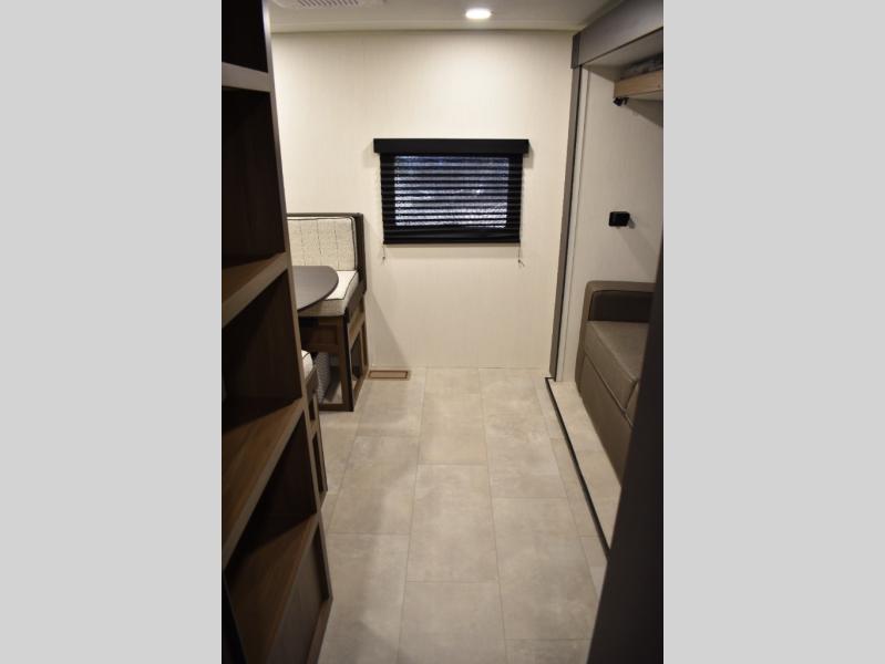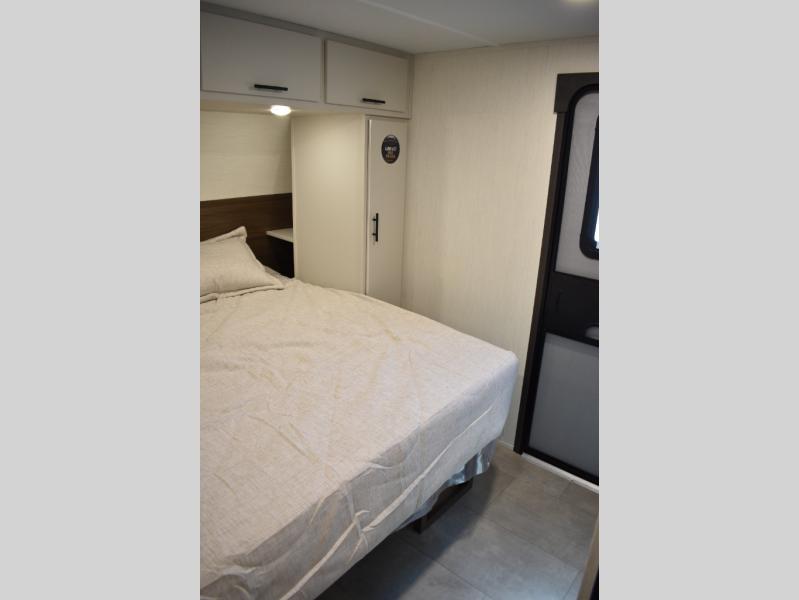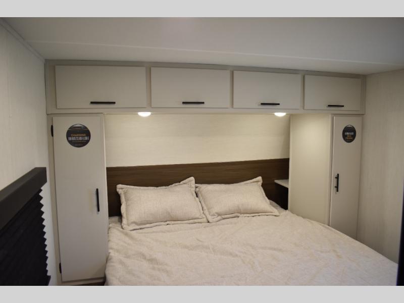This travel trailer is the best option for a big family! The trailer boasts a spacious bunk bed above a sofa bed, providing ample sleeping space for kids and adults alike. The luxurious front king bed is a serene retreat, featuring expansive wardrobes and overhead cabinets for storing your essentials. The charming booth dinette is a cozy spot for meals or extra sleeping space, as well as the versatile jackknife sofa, which also provides additional sleeping space or a comfortable spot to relax. The sleek entertainment center is perfect for family movie nights. The well-appointed kitchen is equipped with a large fridge, convenient shelves, and a spacious pantry, making meal prep and storage an easy chore. The modern full bathroom features a well-stocked linen closet and provides a convenient space for freshening up. Plus, with two convenient entry/exit doors, this trailer offers added flexibility and ease of use, and the ample overhead cabinets provide additional storage space for your belongings.