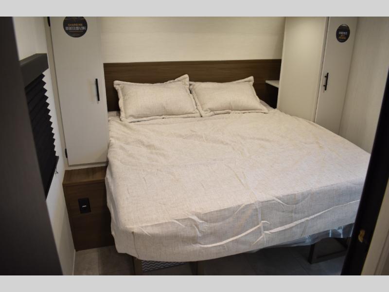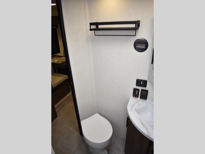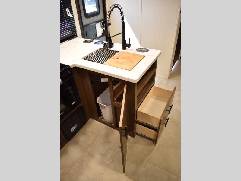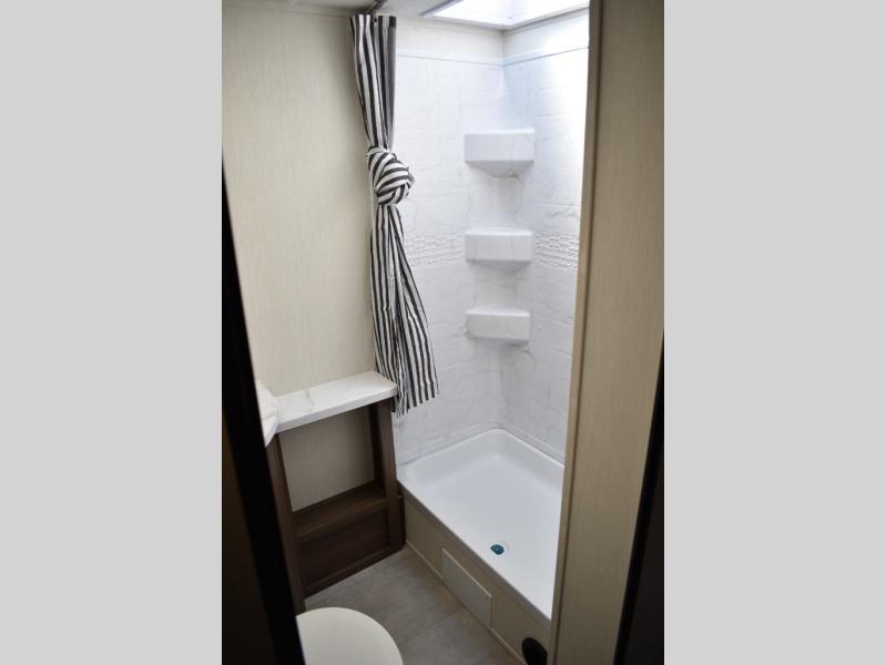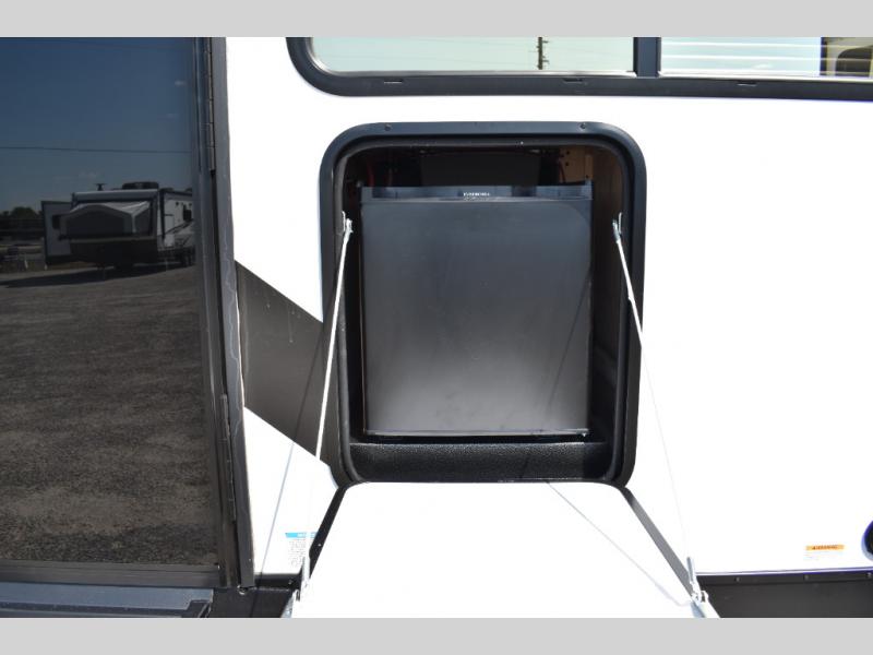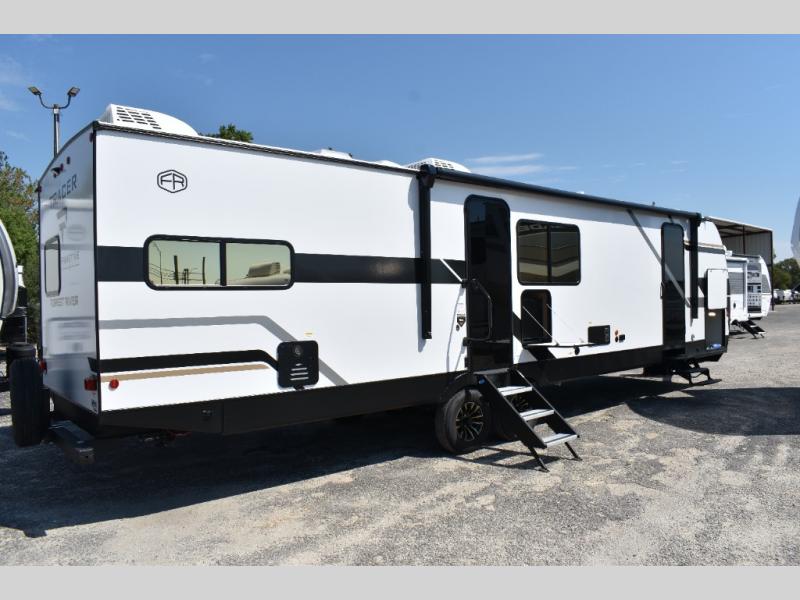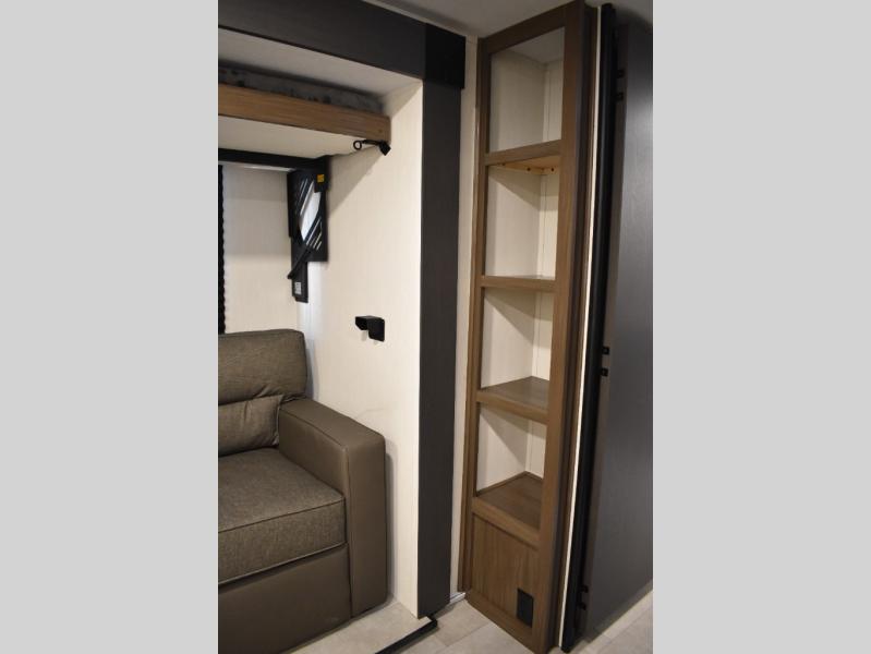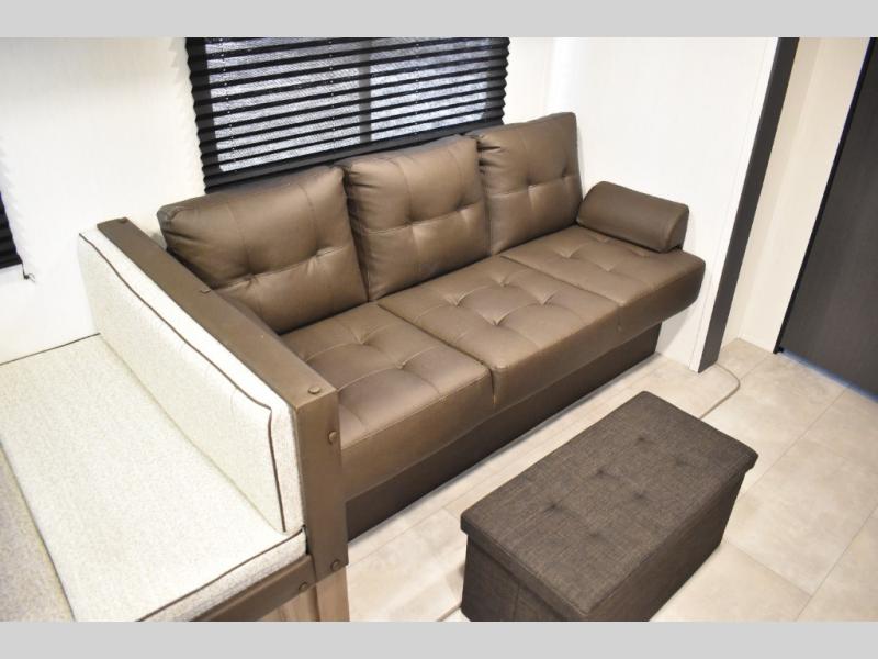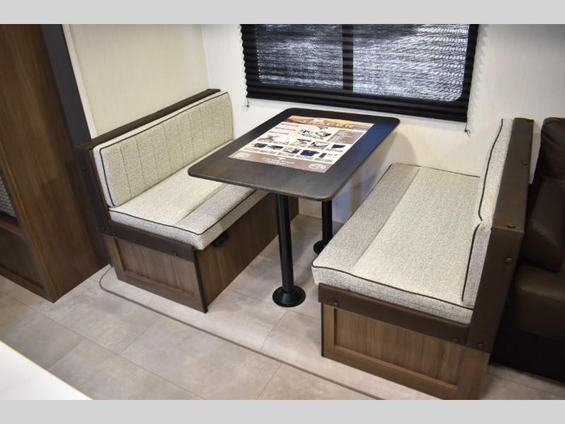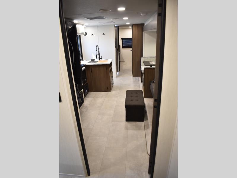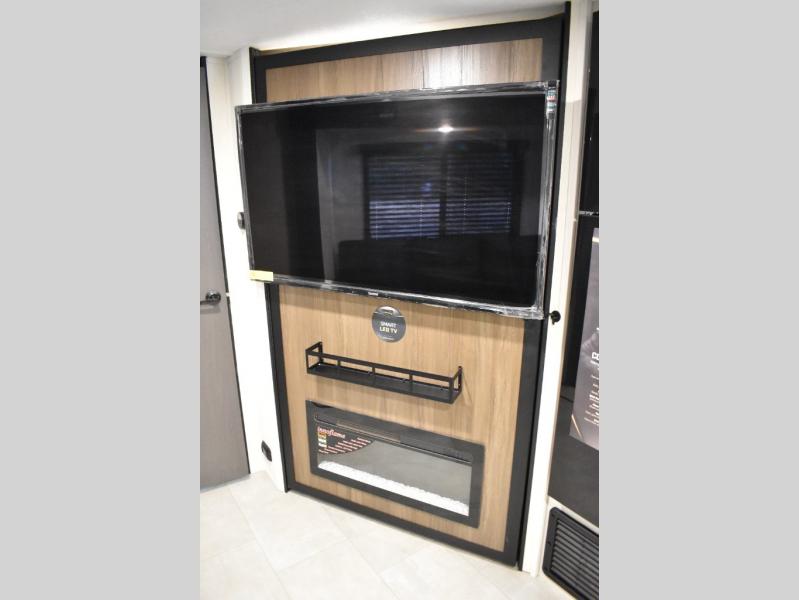 This travel trailer is the best option for a big family! The trailer boasts a spacious bunk bed above a sofa bed, providing ample sleeping space for kids and adults alike. The luxurious front king bed is a serene retreat, featuring expansive wardrobes and overhead cabinets for storing your essentials. The charming booth dinette is a cozy spot for meals or extra sleeping space, as well as the versatile jackknife sofa, which also provides additional sleeping space or a comfortable spot to relax. The sleek entertainment center is perfect for family movie nights. The well-appointed kitchen is equipped with a large fridge, convenient shelves, and a spacious pantry, making meal prep and storage an easy chore. The modern full bathroom features a well-stocked linen closet and provides a convenient space for freshening up. Plus, with two convenient entry/exit doors, this trailer offers added flexibility and ease of use, and the ample overhead cabinets provide additional storage space for your belongings.