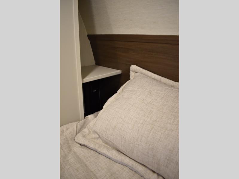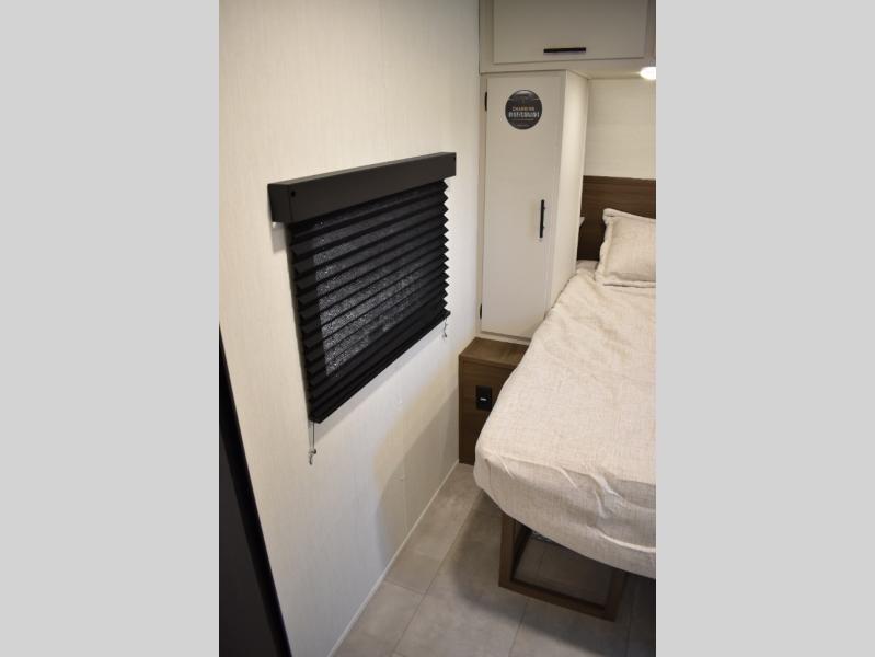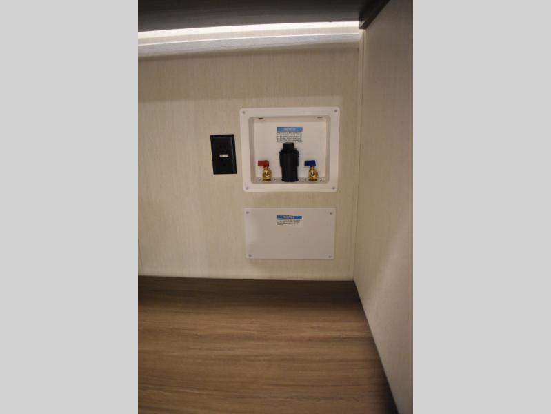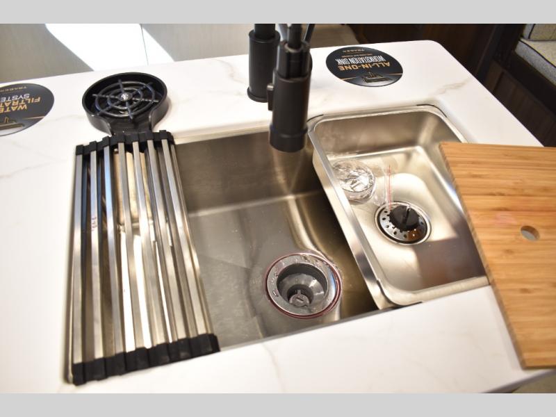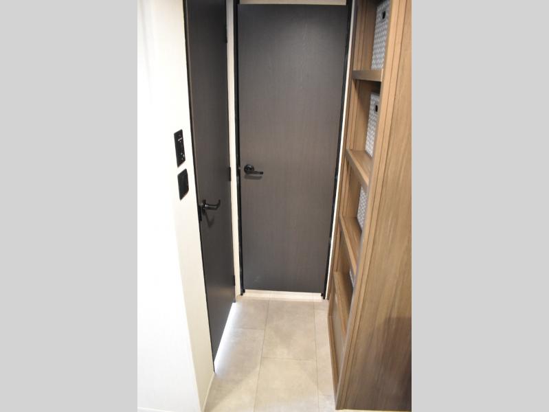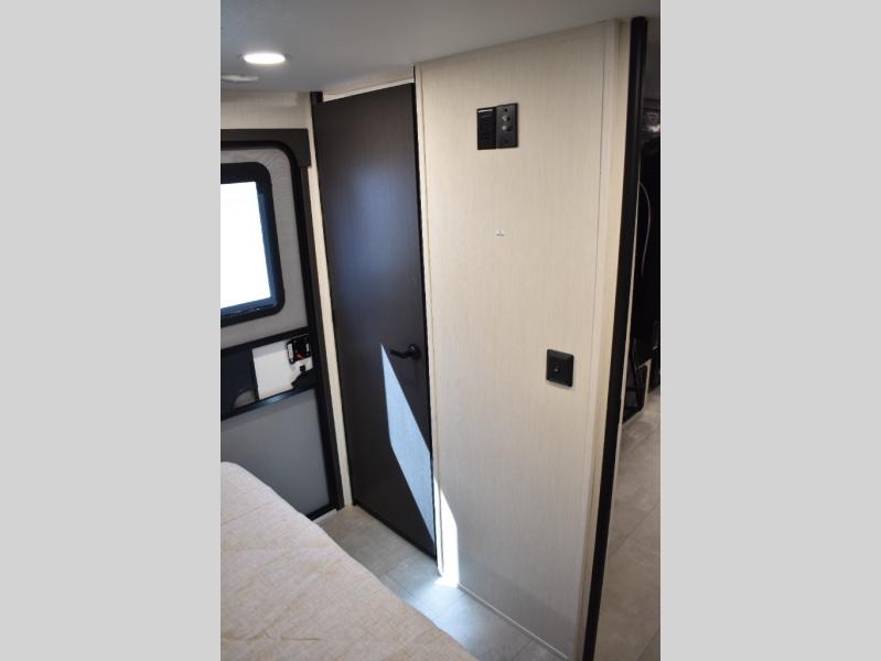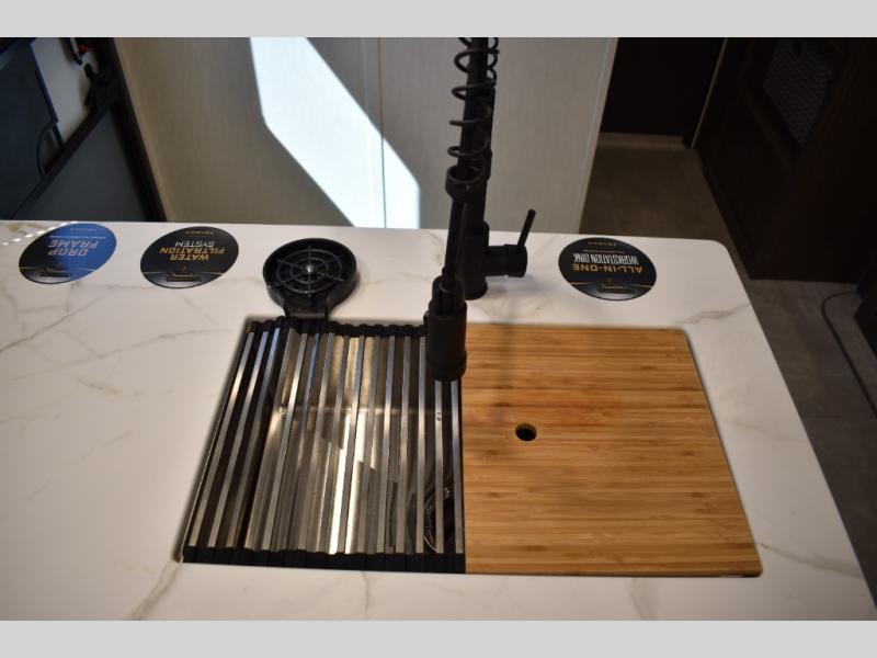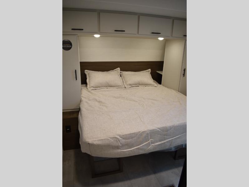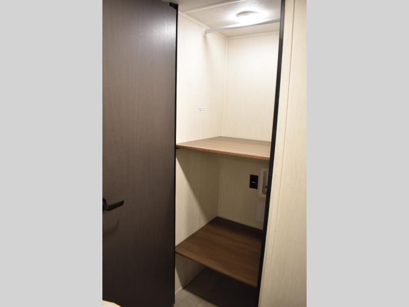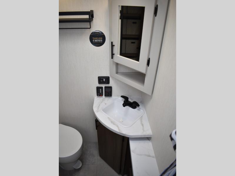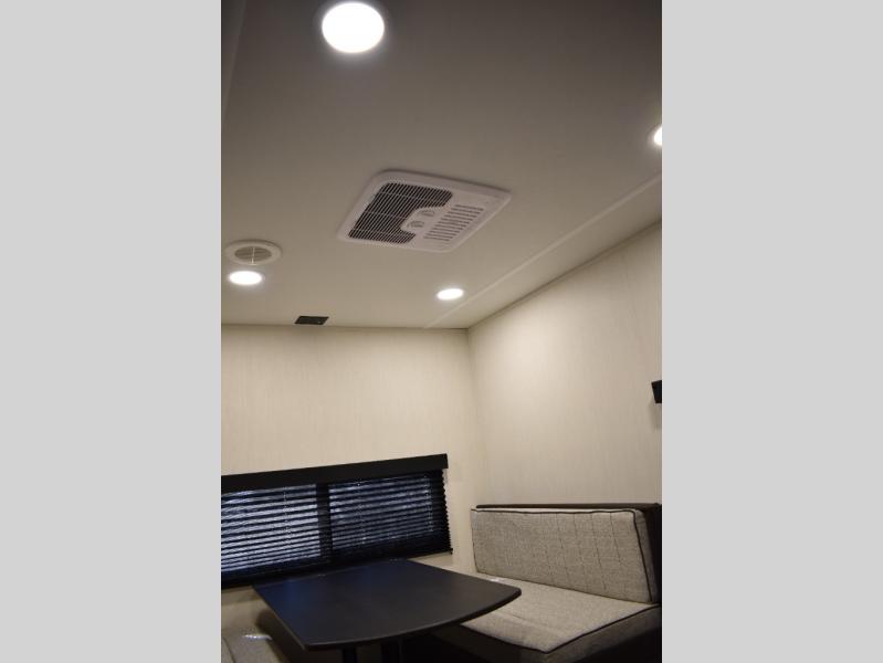 This travel trailer is the best option for a big family! The trailer boasts a spacious bunk bed above a sofa bed, providing ample sleeping space for kids and adults alike. The luxurious front king bed is a serene retreat, featuring expansive wardrobes and overhead cabinets for storing your essentials. The charming booth dinette is a cozy spot for meals or extra sleeping space, as well as the versatile jackknife sofa, which also provides additional sleeping space or a comfortable spot to relax. The sleek entertainment center is perfect for family movie nights. The well-appointed kitchen is equipped with a large fridge, convenient shelves, and a spacious pantry, making meal prep and storage an easy chore. The modern full bathroom features a well-stocked linen closet and provides a convenient space for freshening up. Plus, with two convenient entry/exit doors, this trailer offers added flexibility and ease of use, and the ample overhead cabinets provide additional storage space for your belongings.
