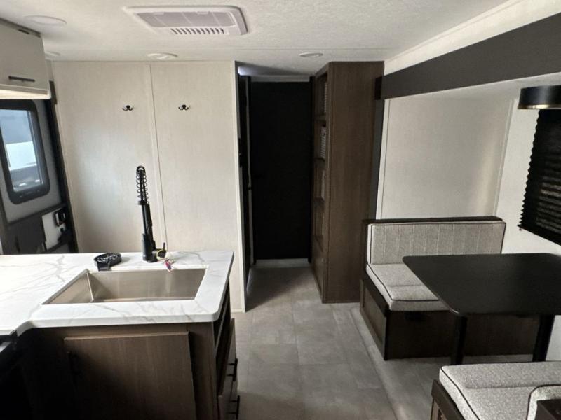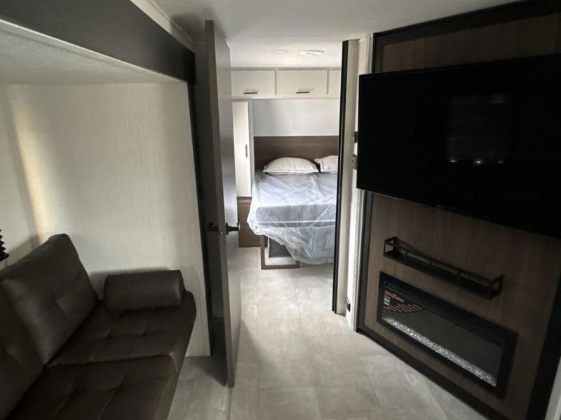 This travel trailer is the best option for a big family! The trailer boasts a spacious bunk bed above a sofa bed, providing ample sleeping space for kids and adults alike. The luxurious front king bed is a serene retreat, featuring expansive wardrobes and overhead cabinets for storing your essentials. The charming booth dinette is a cozy spot for meals or extra sleeping space, as well as the versatile jackknife sofa, which also provides additional sleeping space or a comfortable spot to relax. The sleek entertainment center is perfect for family movie nights. The well-appointed kitchen is equipped with a large fridge, convenient shelves, and a spacious pantry, making meal prep and storage an easy chore. The modern full bathroom features a well-stocked linen closet and provides a convenient space for freshening up. Plus, with two convenient entry/exit doors, this trailer offers added flexibility and ease of use, and the ample overhead cabinets provide additional storage space for your belongings.