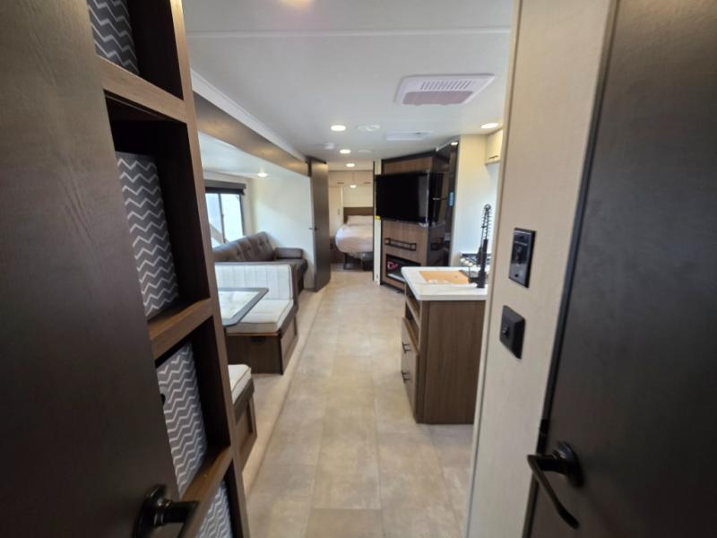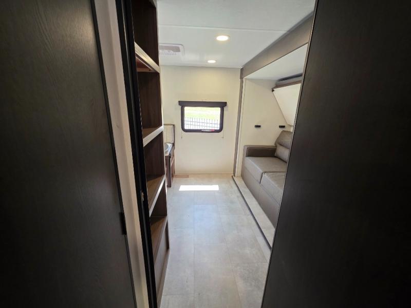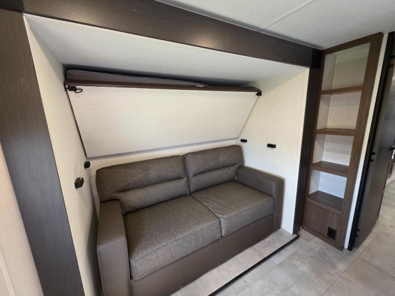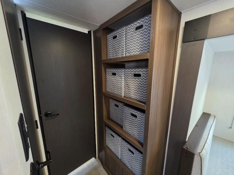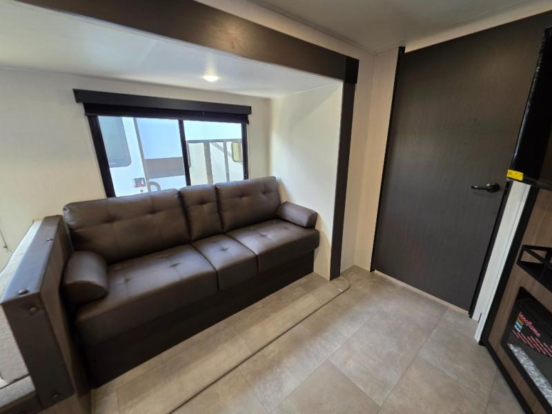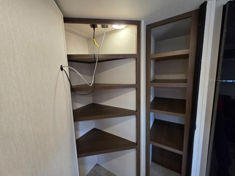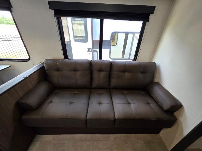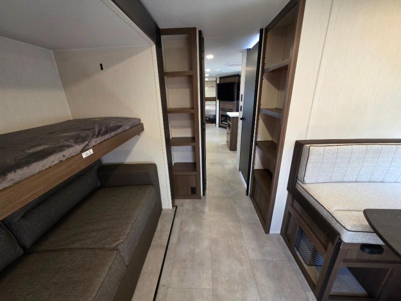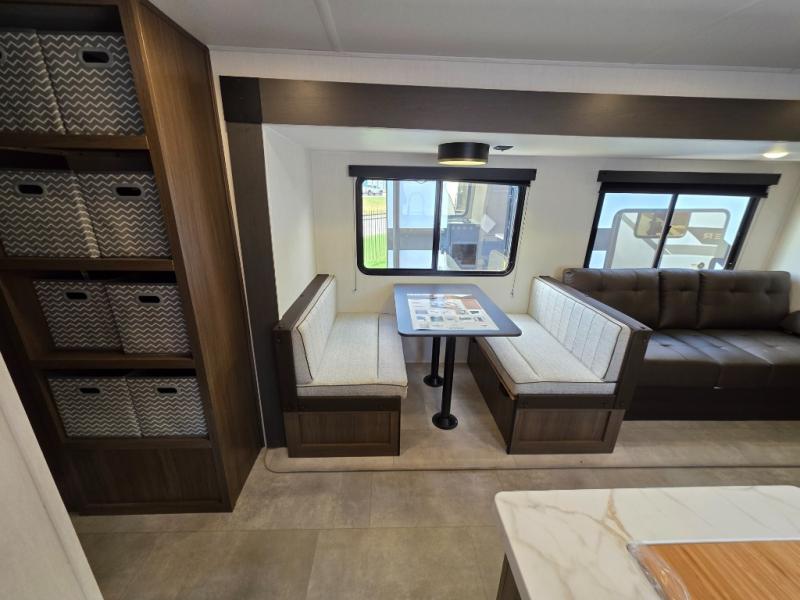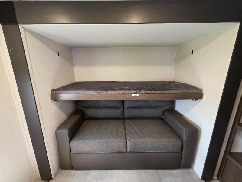 This travel trailer is the best option for a big family! The trailer boasts a spacious bunk bed above a sofa bed, providing ample sleeping space for kids and adults alike. The luxurious front king bed is a serene retreat, featuring expansive wardrobes and overhead cabinets for storing your essentials. The charming booth dinette is a cozy spot for meals or extra sleeping space, as well as the versatile jackknife sofa, which also provides additional sleeping space or a comfortable spot to relax. The sleek entertainment center is perfect for family movie nights. The well-appointed kitchen is equipped with a large fridge, convenient shelves, and a spacious pantry, making meal prep and storage an easy chore. The modern full bathroom features a well-stocked linen closet and provides a convenient space for freshening up. Plus, with two convenient entry/exit doors, this trailer offers added flexibility and ease of use, and the ample overhead cabinets provide additional storage space for your belongings.