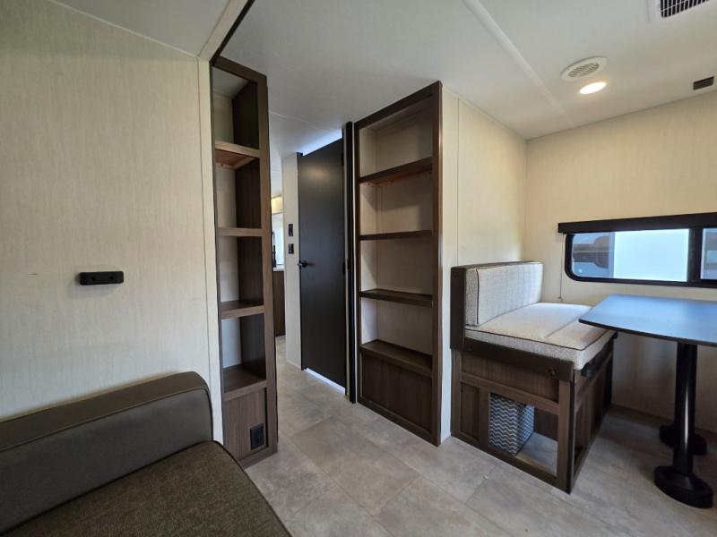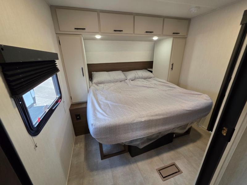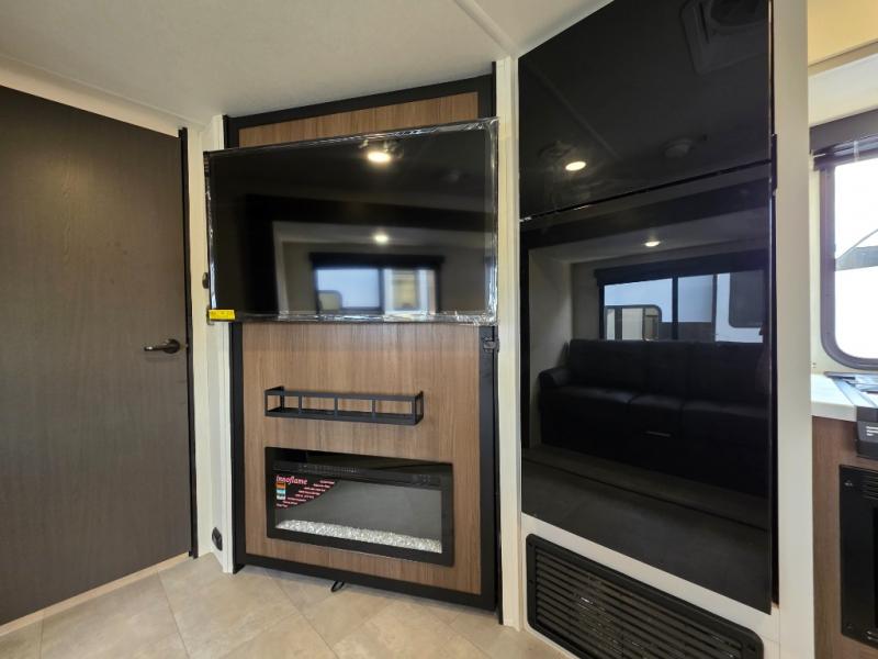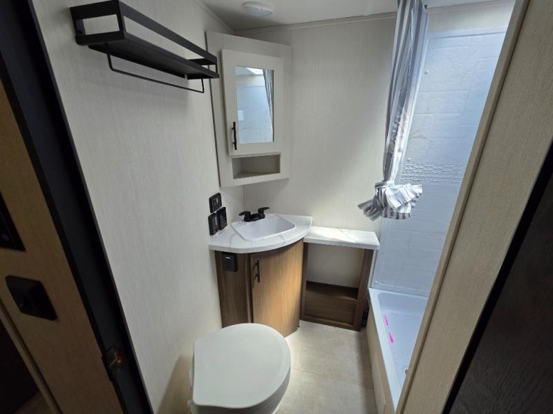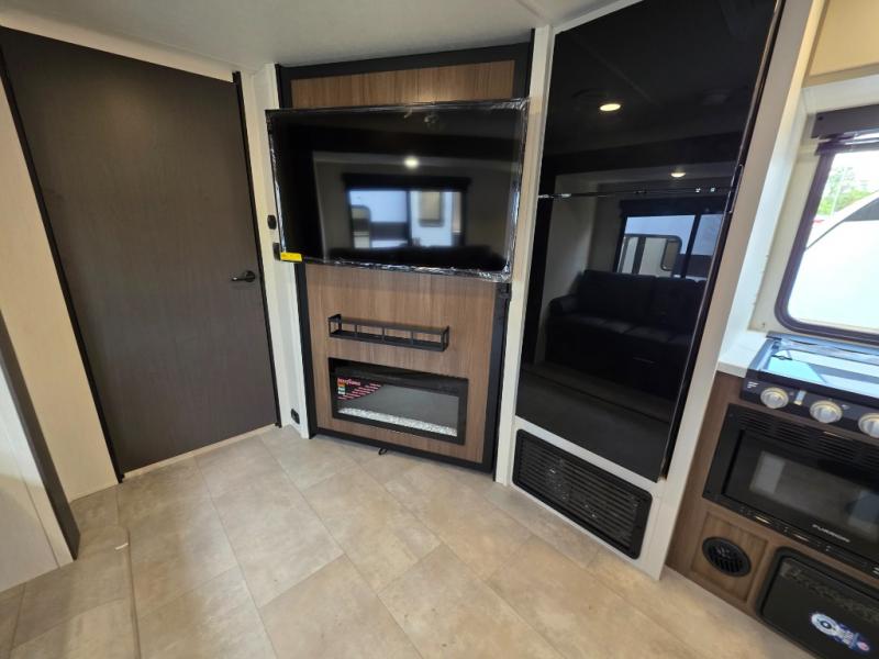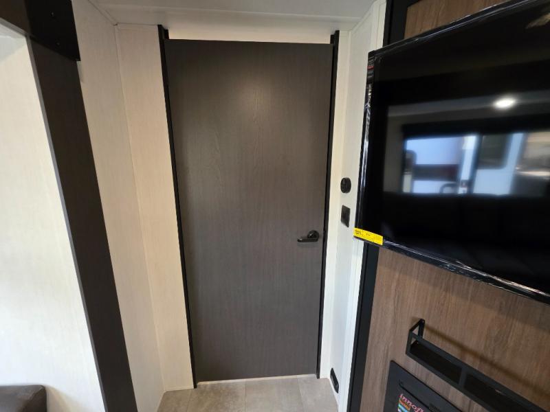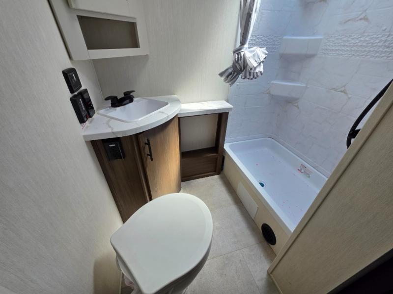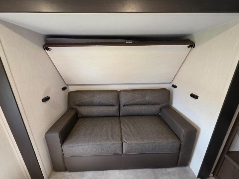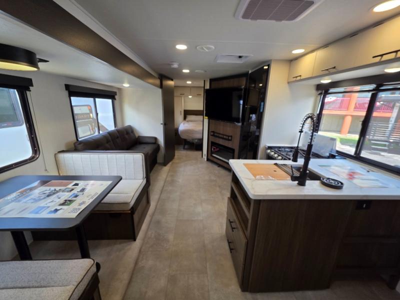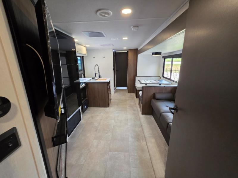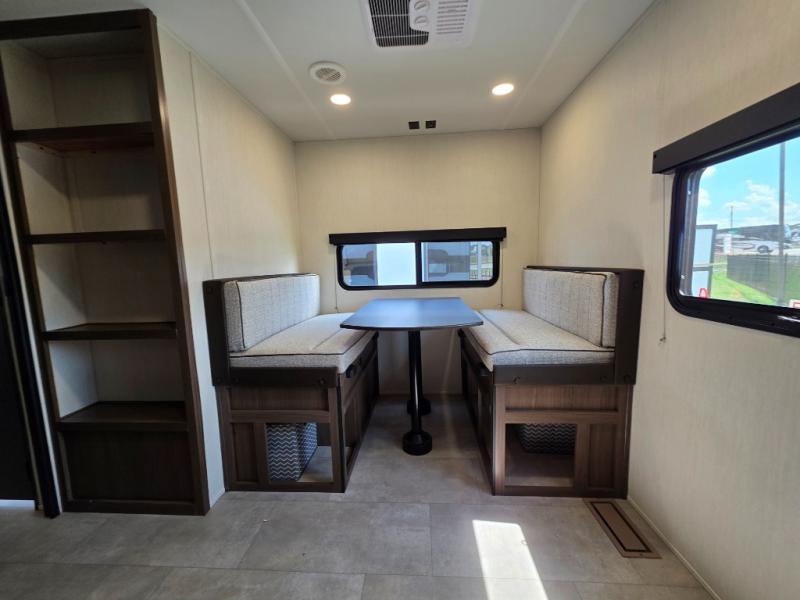 This travel trailer is the best option for a big family! The trailer boasts a spacious bunk bed above a sofa bed, providing ample sleeping space for kids and adults alike. The luxurious front king bed is a serene retreat, featuring expansive wardrobes and overhead cabinets for storing your essentials. The charming booth dinette is a cozy spot for meals or extra sleeping space, as well as the versatile jackknife sofa, which also provides additional sleeping space or a comfortable spot to relax. The sleek entertainment center is perfect for family movie nights. The well-appointed kitchen is equipped with a large fridge, convenient shelves, and a spacious pantry, making meal prep and storage an easy chore. The modern full bathroom features a well-stocked linen closet and provides a convenient space for freshening up. Plus, with two convenient entry/exit doors, this trailer offers added flexibility and ease of use, and the ample overhead cabinets provide additional storage space for your belongings.