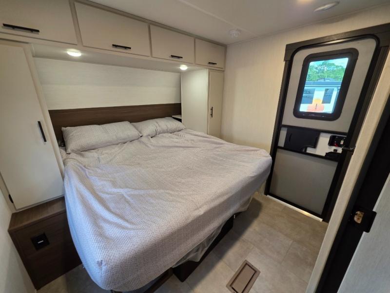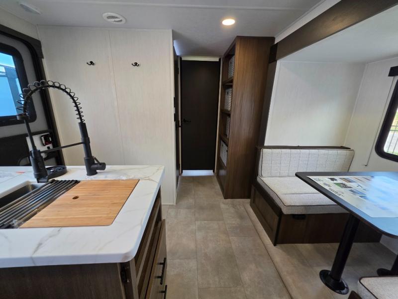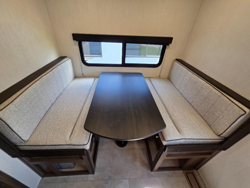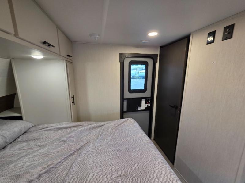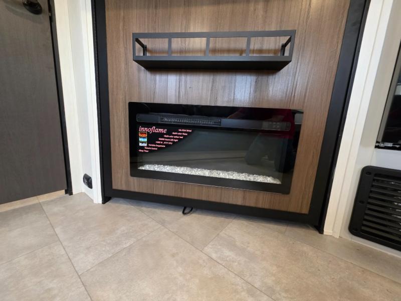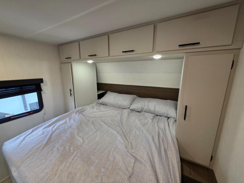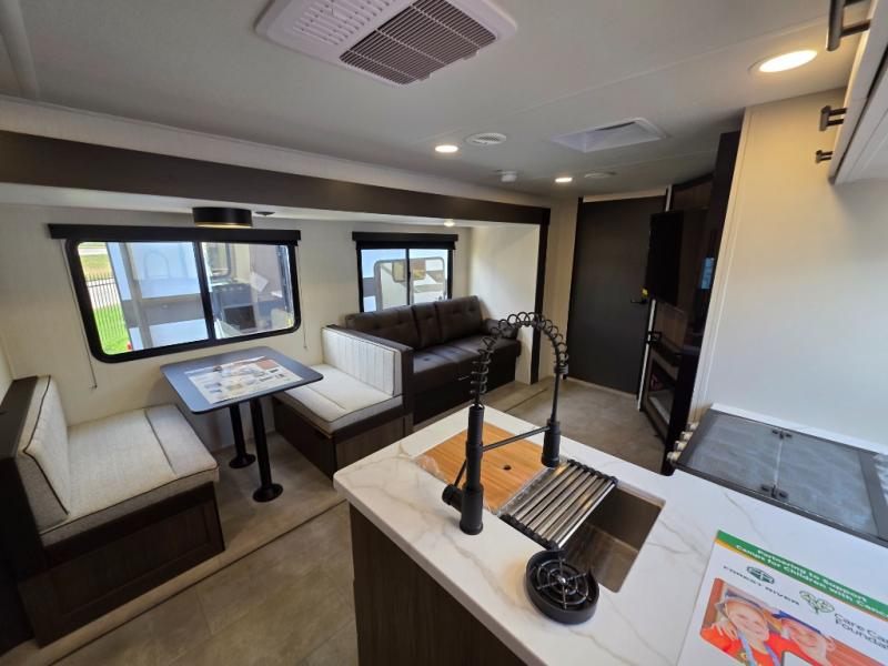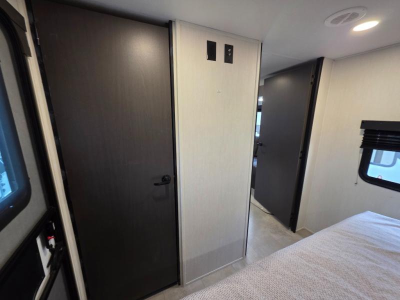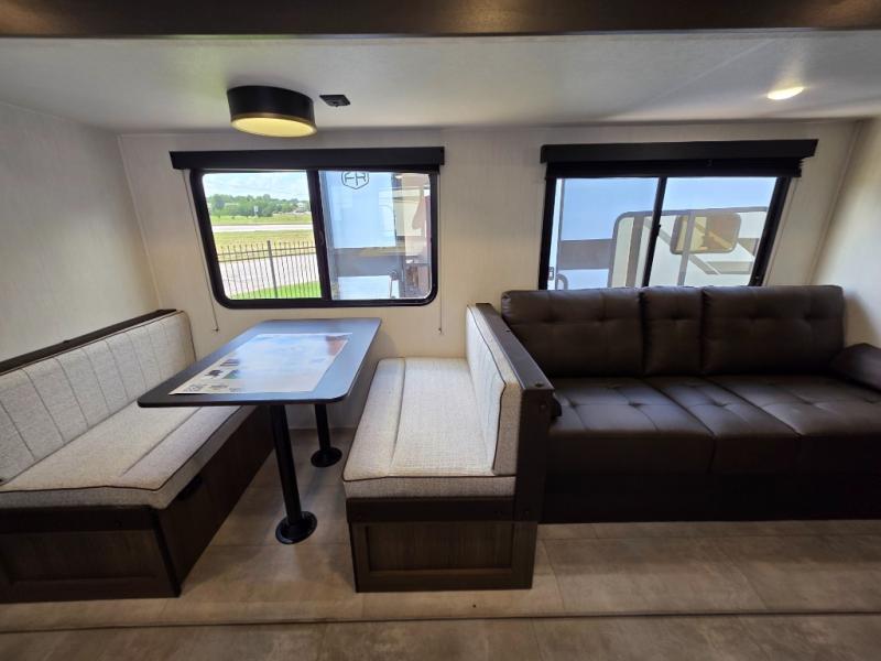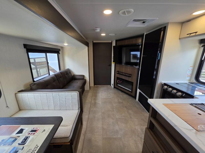 This travel trailer is the best option for a big family! The trailer boasts a spacious bunk bed above a sofa bed, providing ample sleeping space for kids and adults alike. The luxurious front king bed is a serene retreat, featuring expansive wardrobes and overhead cabinets for storing your essentials. The charming booth dinette is a cozy spot for meals or extra sleeping space, as well as the versatile jackknife sofa, which also provides additional sleeping space or a comfortable spot to relax. The sleek entertainment center is perfect for family movie nights. The well-appointed kitchen is equipped with a large fridge, convenient shelves, and a spacious pantry, making meal prep and storage an easy chore. The modern full bathroom features a well-stocked linen closet and provides a convenient space for freshening up. Plus, with two convenient entry/exit doors, this trailer offers added flexibility and ease of use, and the ample overhead cabinets provide additional storage space for your belongings.
