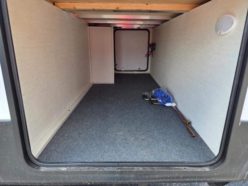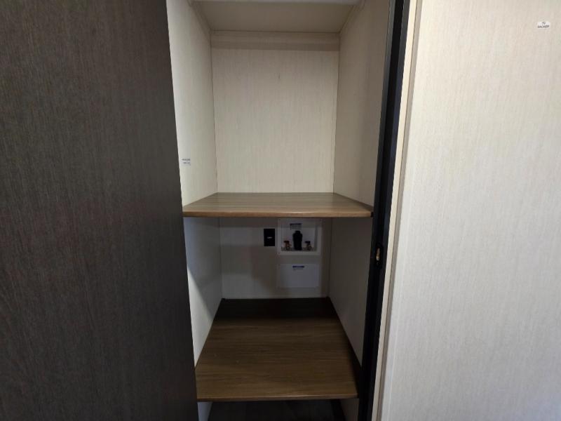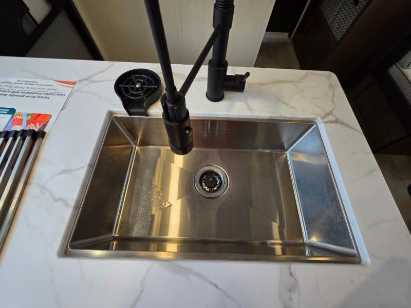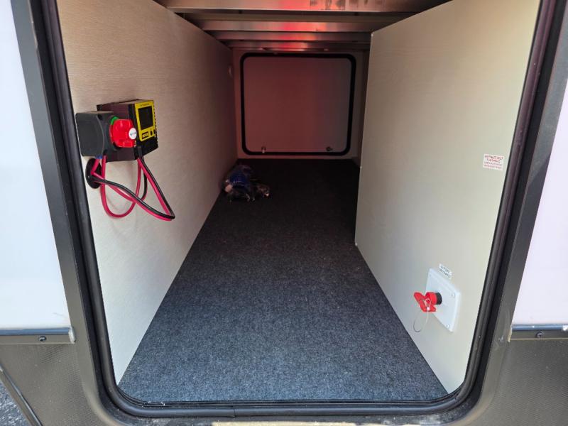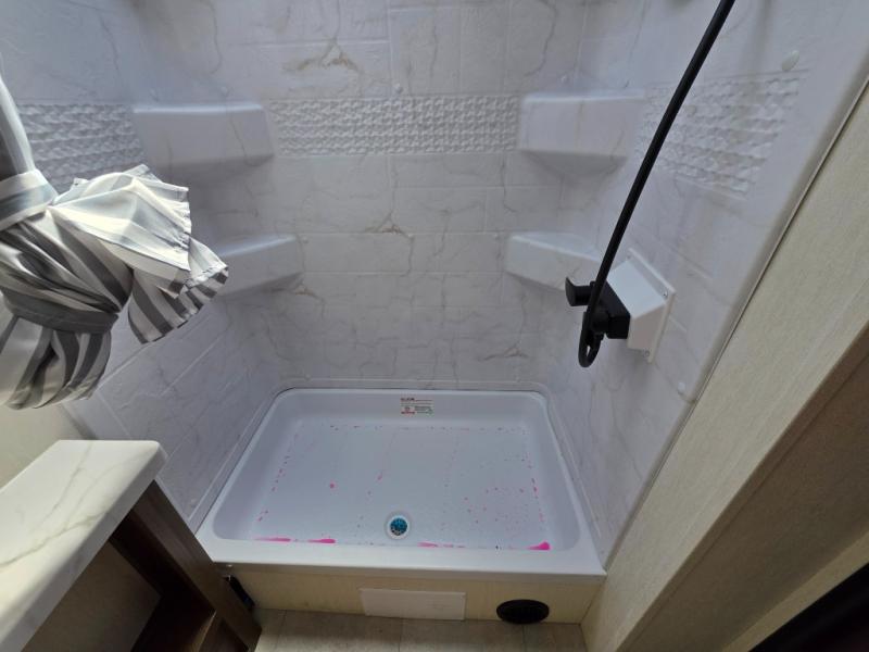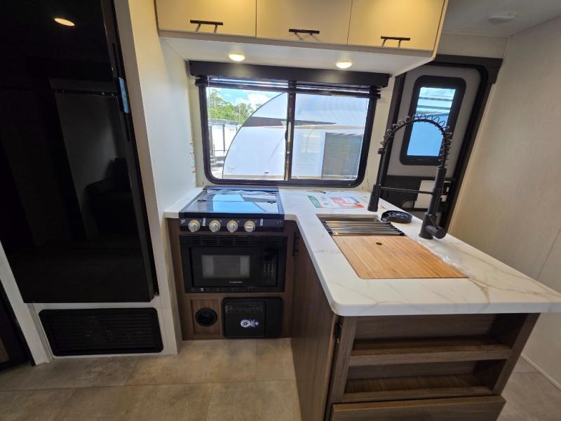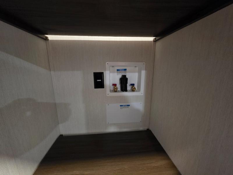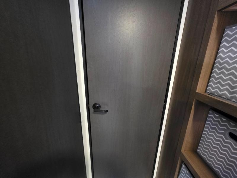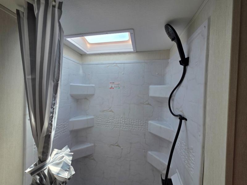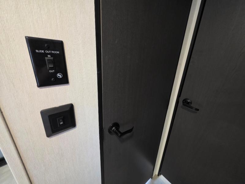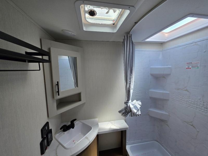 This travel trailer is the best option for a big family! The trailer boasts a spacious bunk bed above a sofa bed, providing ample sleeping space for kids and adults alike. The luxurious front king bed is a serene retreat, featuring expansive wardrobes and overhead cabinets for storing your essentials. The charming booth dinette is a cozy spot for meals or extra sleeping space, as well as the versatile jackknife sofa, which also provides additional sleeping space or a comfortable spot to relax. The sleek entertainment center is perfect for family movie nights. The well-appointed kitchen is equipped with a large fridge, convenient shelves, and a spacious pantry, making meal prep and storage an easy chore. The modern full bathroom features a well-stocked linen closet and provides a convenient space for freshening up. Plus, with two convenient entry/exit doors, this trailer offers added flexibility and ease of use, and the ample overhead cabinets provide additional storage space for your belongings.